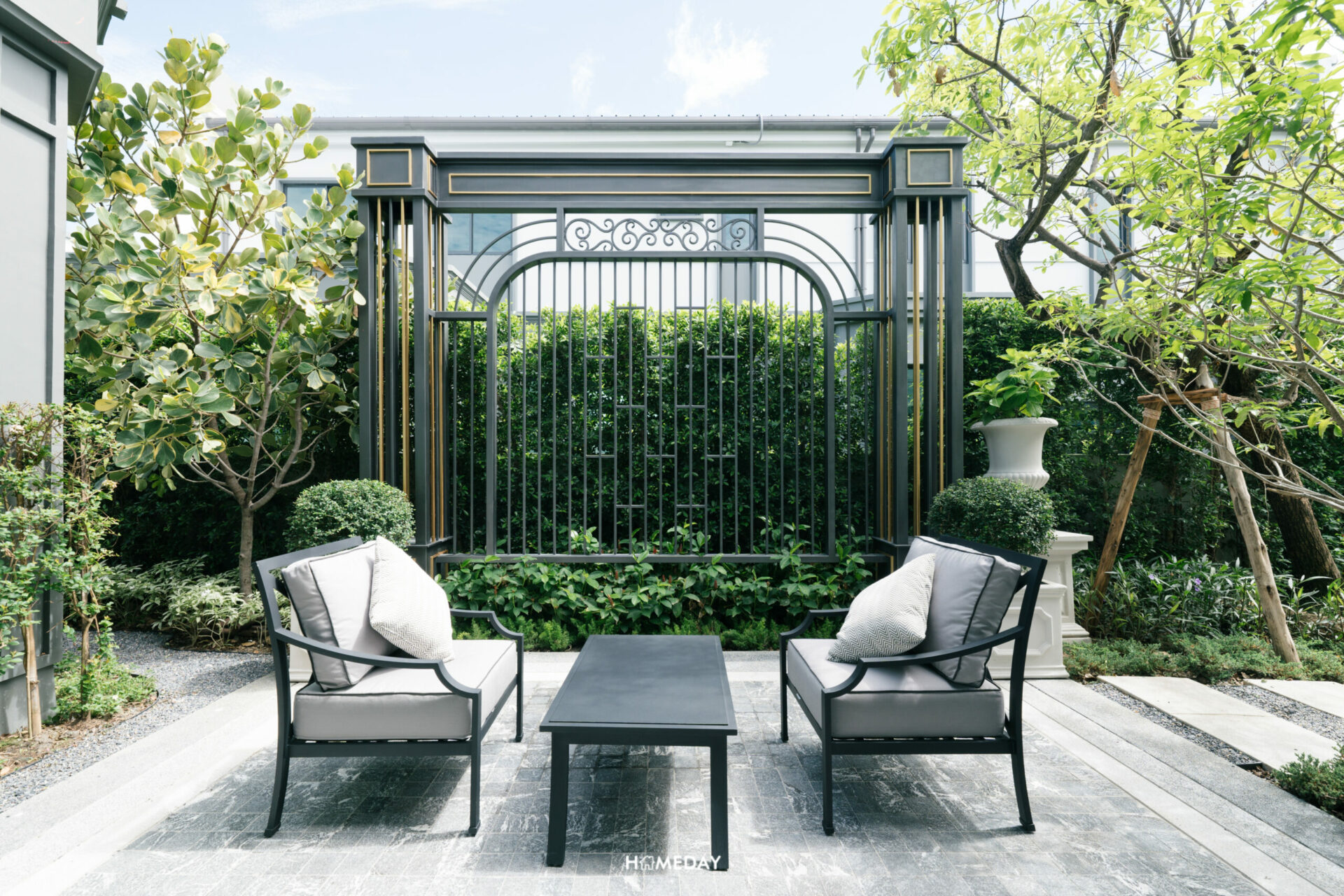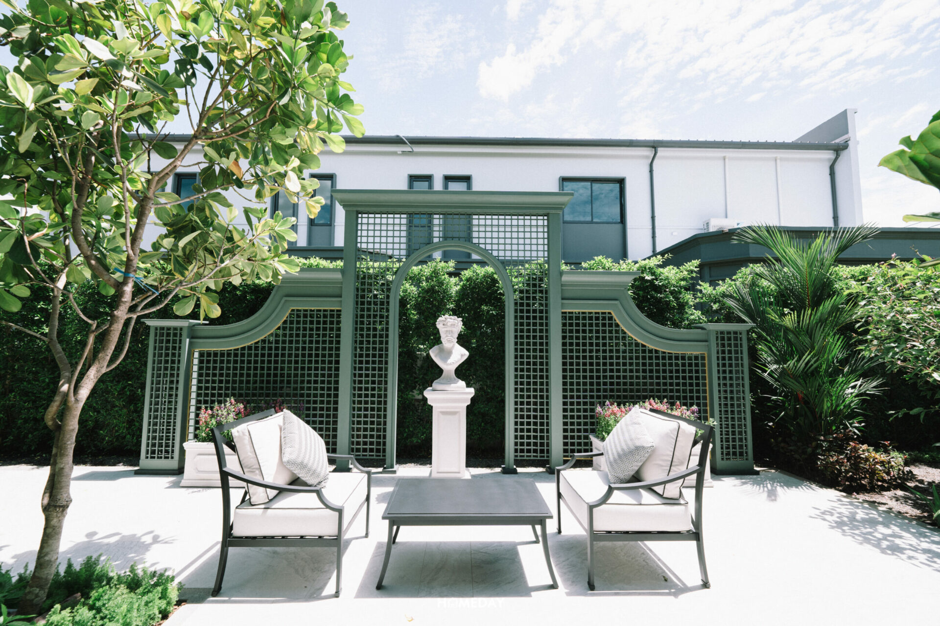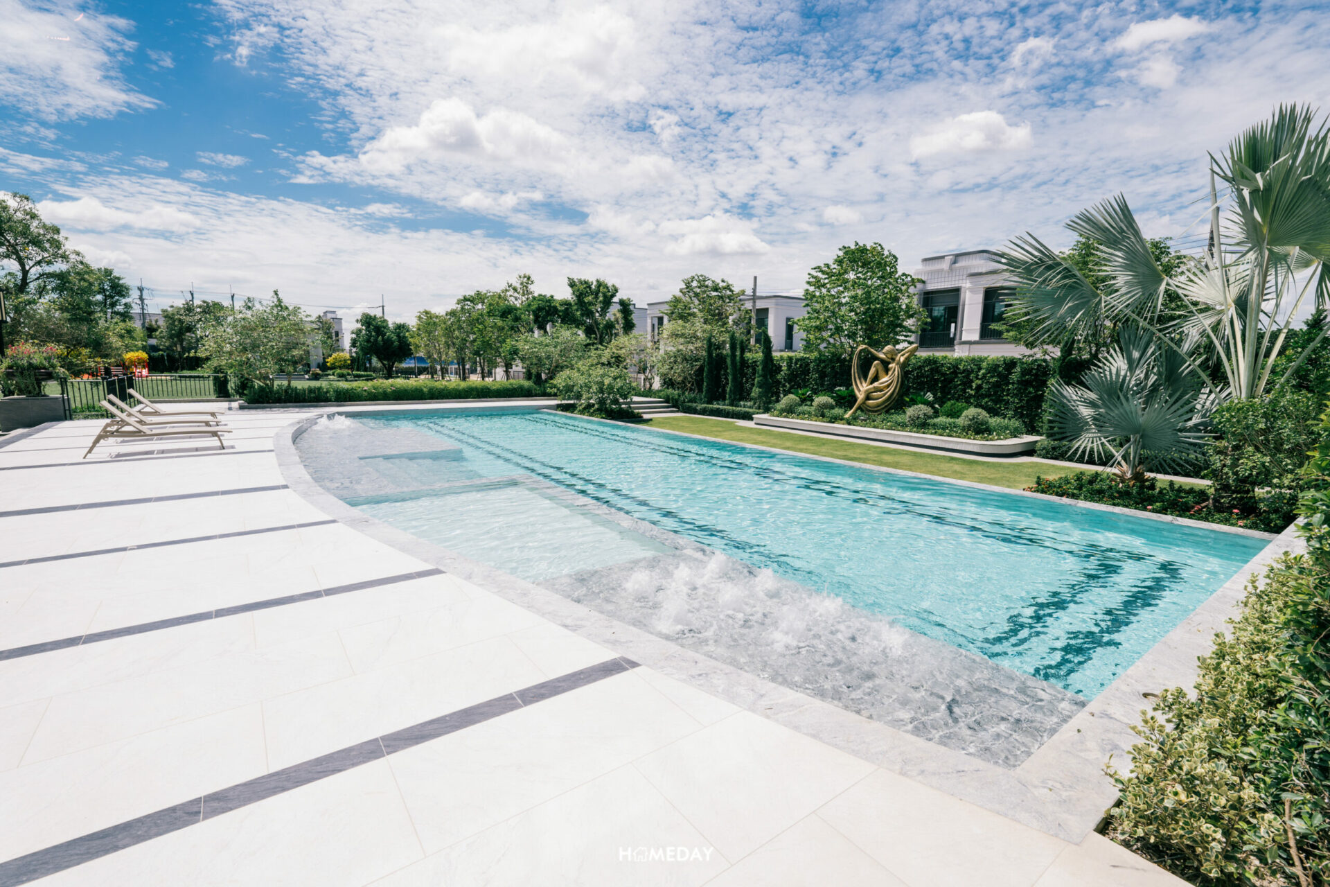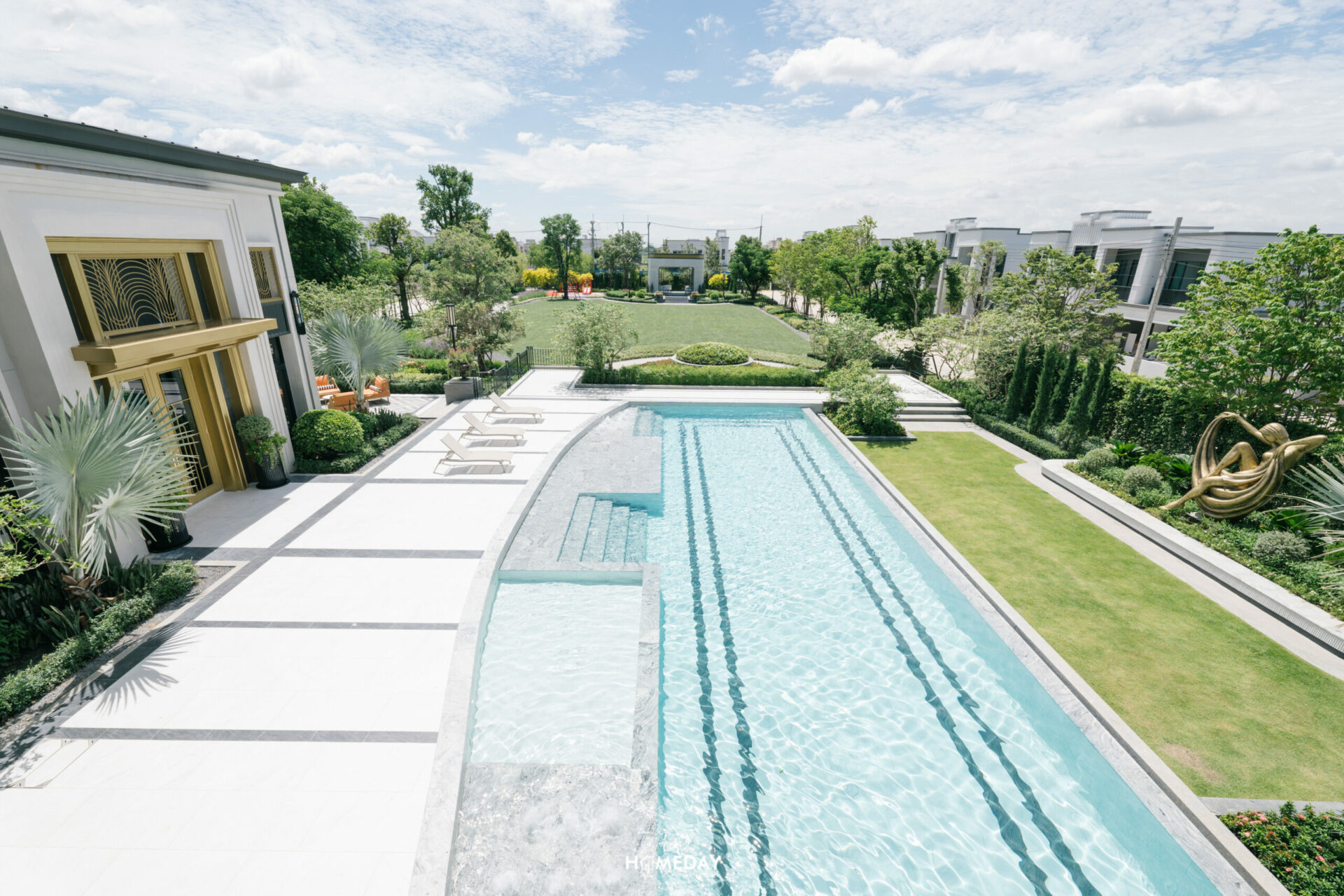 ทางด้านของสวนหลังบ้าน โครงการออกแบบพื้นที่ให้ดูเป็นมุมนั่งเล่น Outdoor ที่รายล้อมไปด้วยต้นไม้และประติมากรรมรูปปั้นที่สวยงาม ในช่วงเวลาเย็น หรือเช้าตรู่ที่แดดไม่จัดมาก อากาศดี ๆ เหมาะจะมานั่งเล่นพักผ่อนมาก ๆ เลยครับ