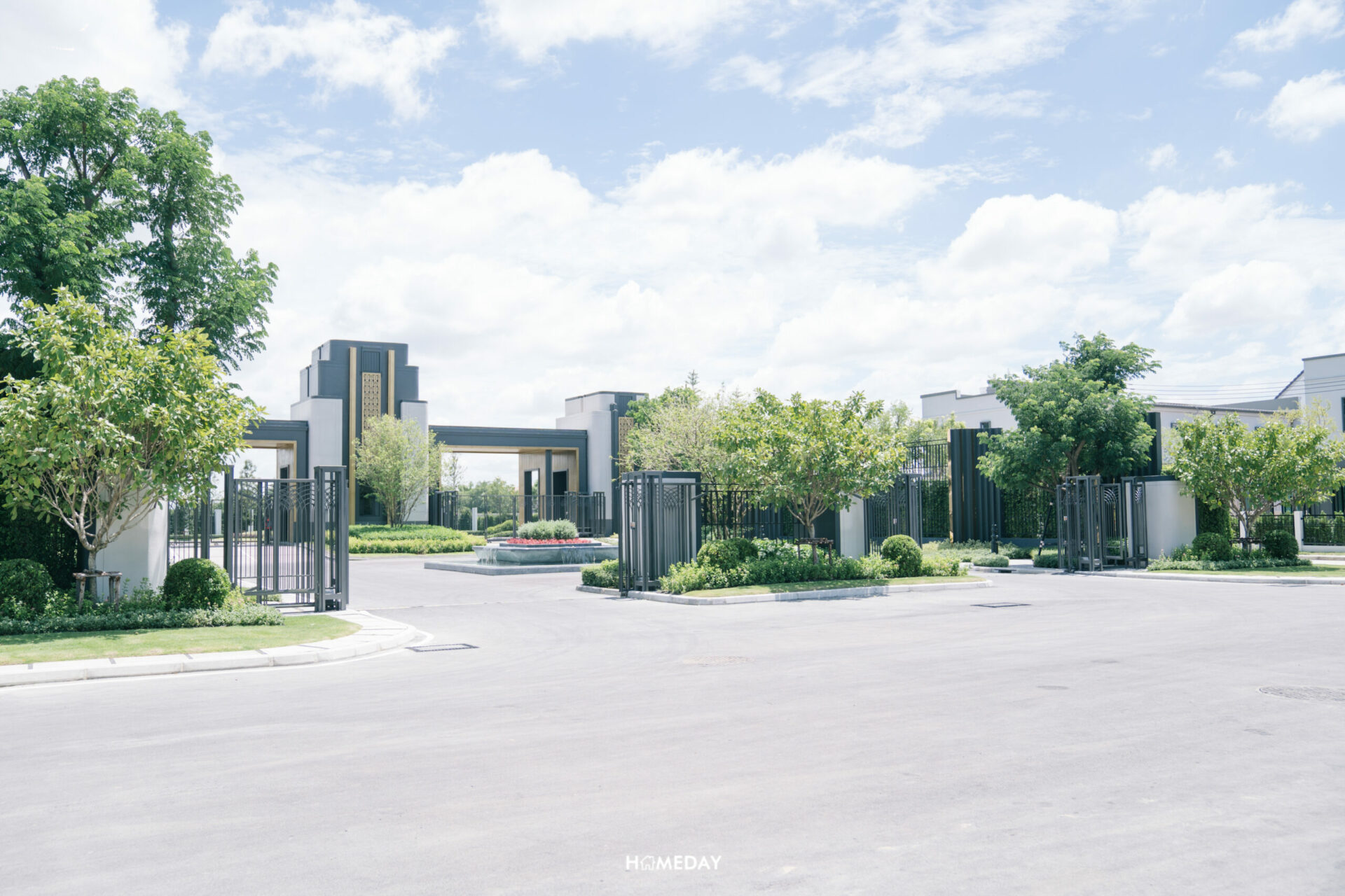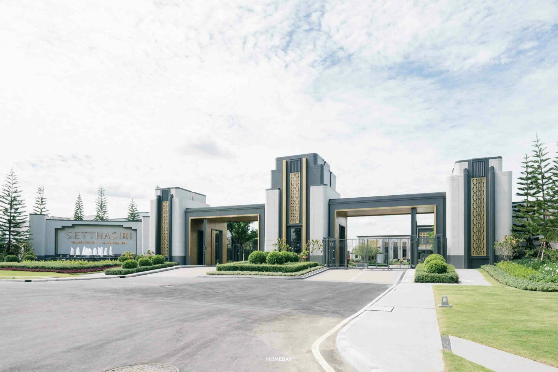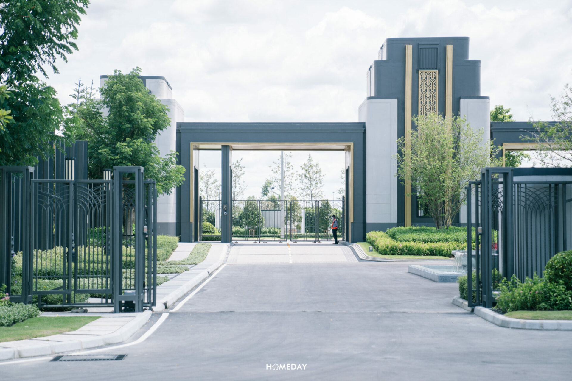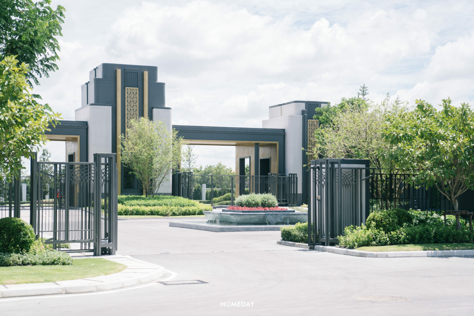 ซุ้มทางเข้าโครงการ สดชื่น ร่มรื่น ด้วยไม้นานาพรรณ ดีไซน์แบบ Modern Art Deco ที่เป็นตำนานของโลก ตกแต่งด้วยลวดลาย และเส้นสายสีทอง สลับ ขาว ดำ รูปทรงเรขาคณิต หรือการย่อมุมด้วยเส้นสายที่อ่อนช้อย สะท้อนความภาคภูมิของผู้อยู่อาศัยได้อย่างเต็มเปี่ยม