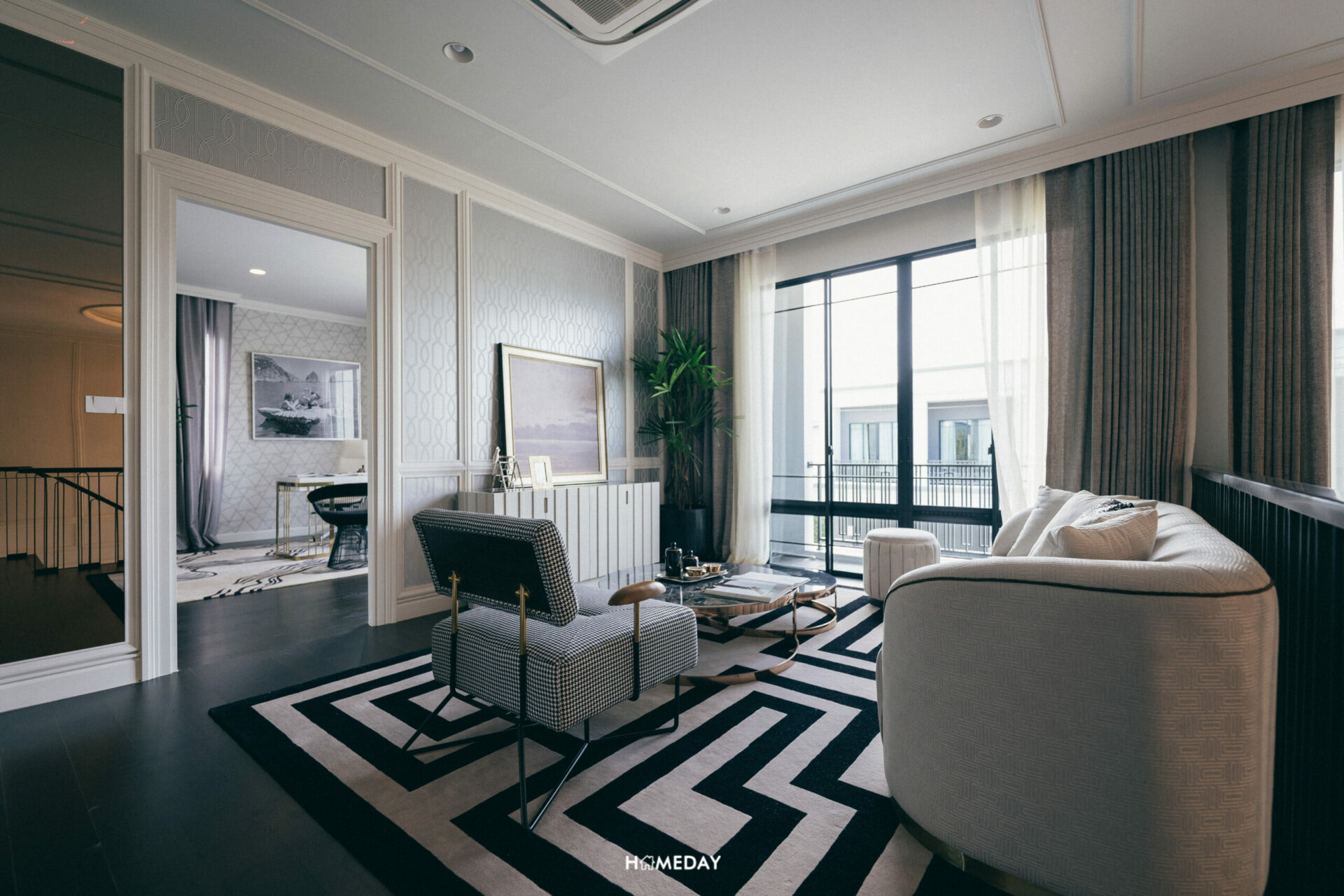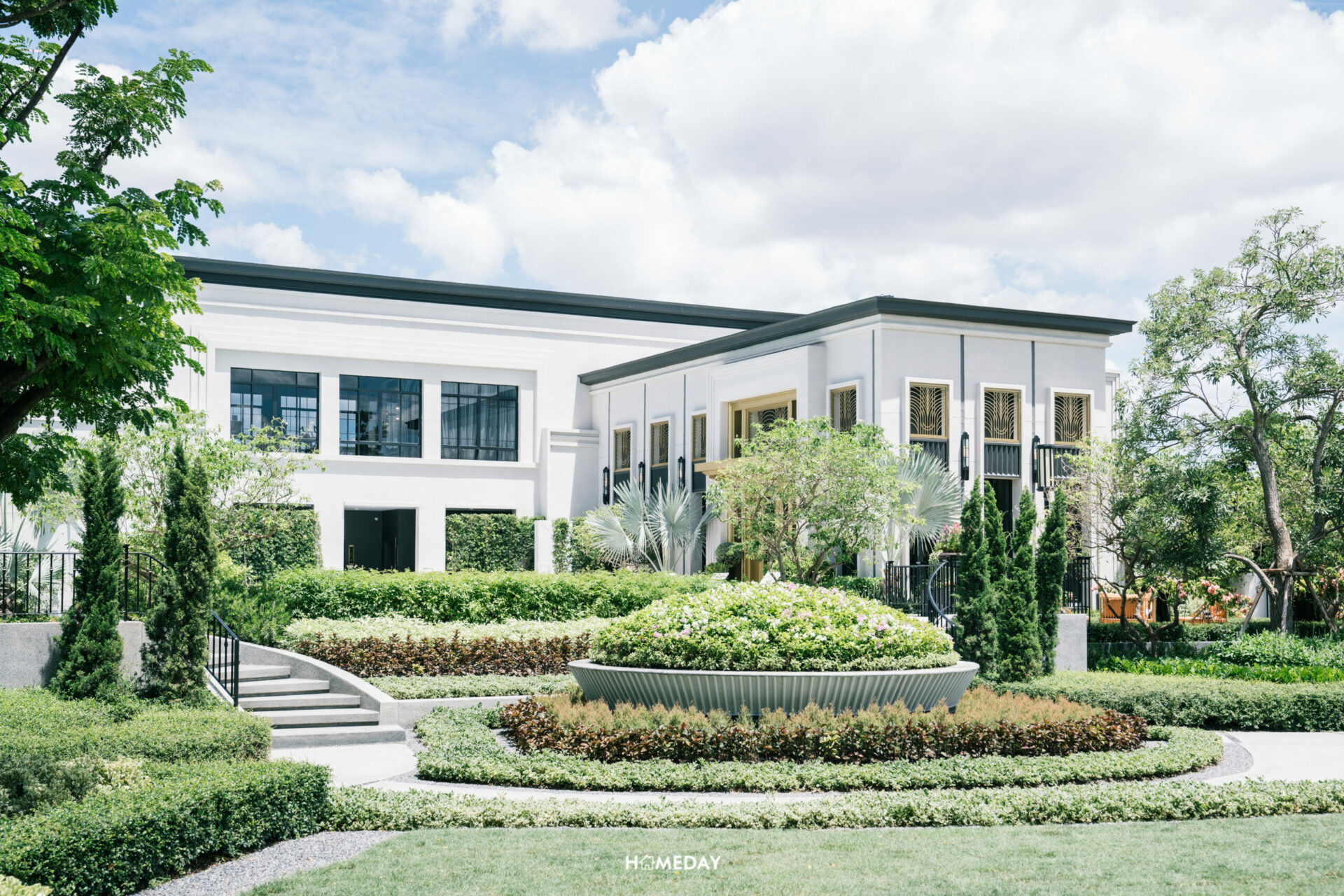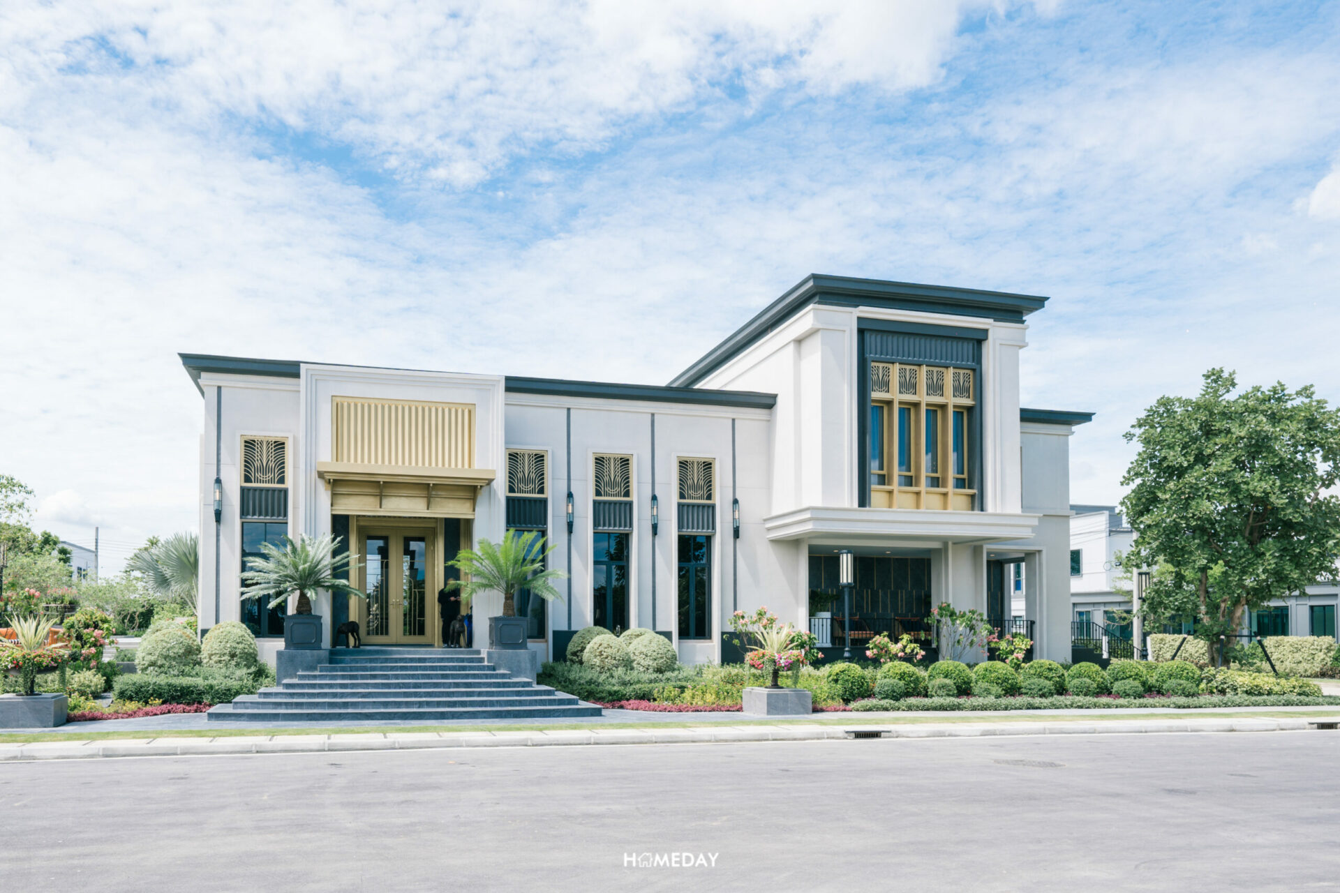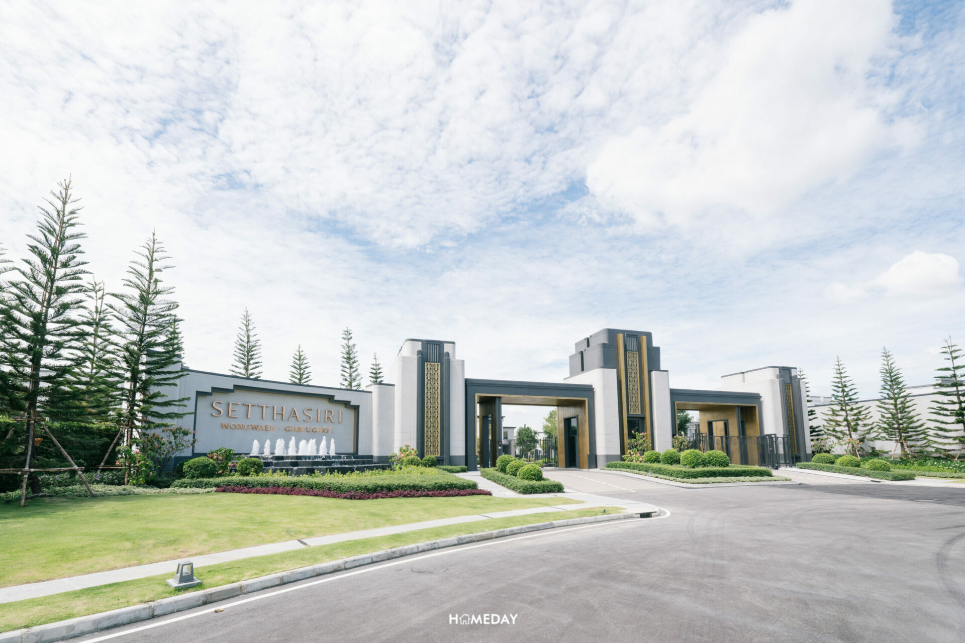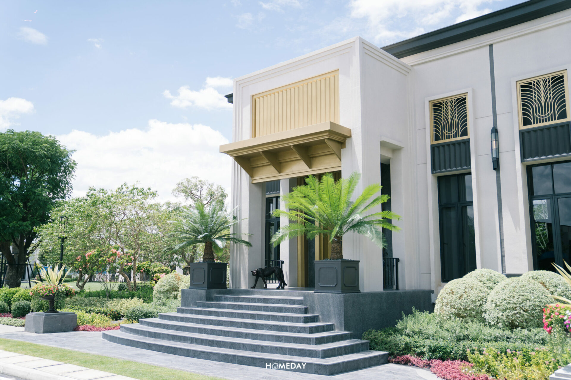 ซุ้มทางเข้าโครงการ สดชื่น ร่มรื่น ด้วยไม้นานาพรรณ ดีไซน์แบบ Modern Art Deco ที่เป็นตำนานของโลก ตกแต่งด้วยลวดลาย และเส้นสายสีทอง สลับ ขาว ดำ รูปทรงเรขาคณิต หรือการย่อมุมด้วยเส้นสายที่อ่อนช้อย สะท้อนความภาคภูมิของผู้อยู่อาศัยได้อย่างเต็มเปี่ยม