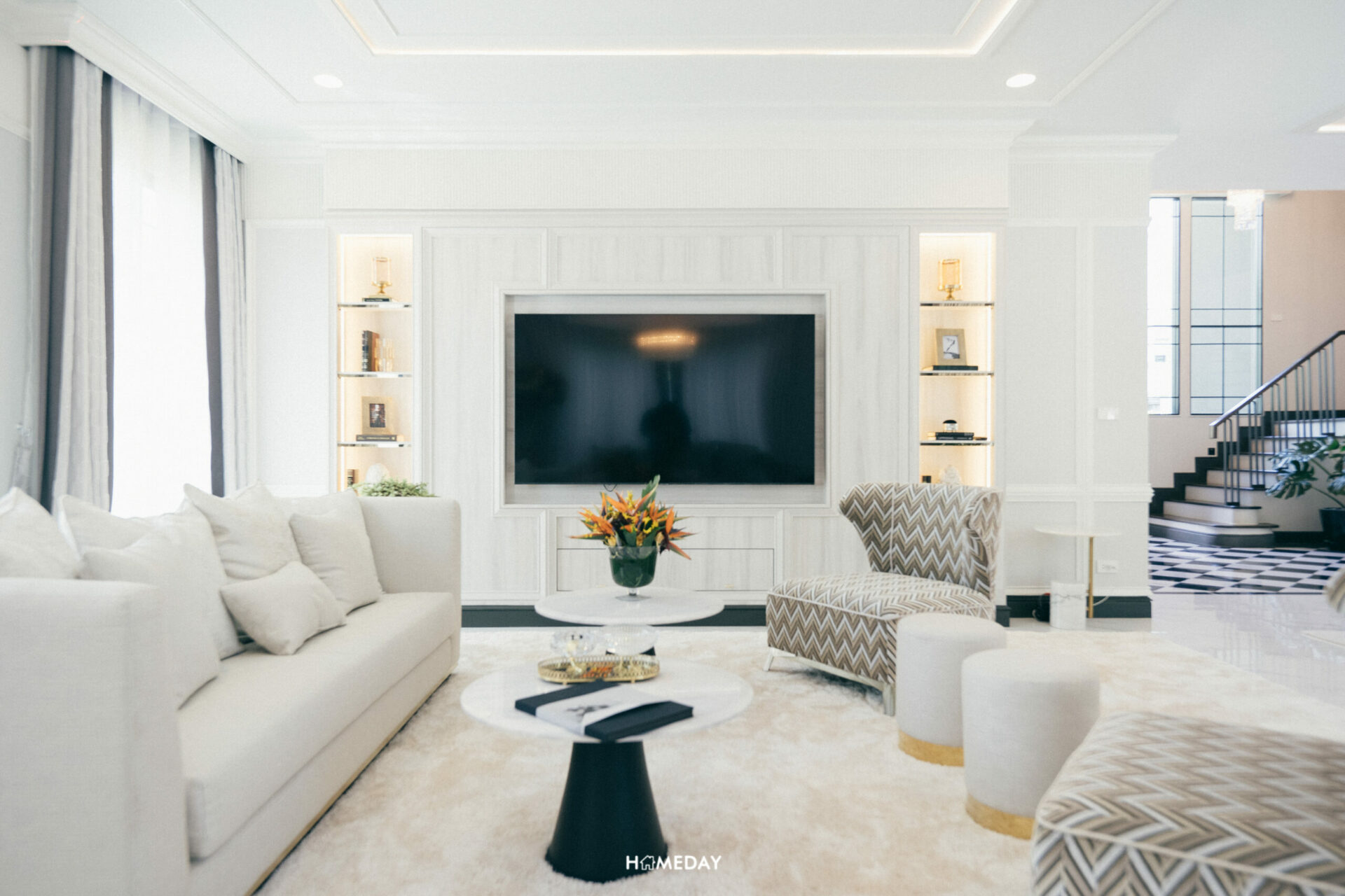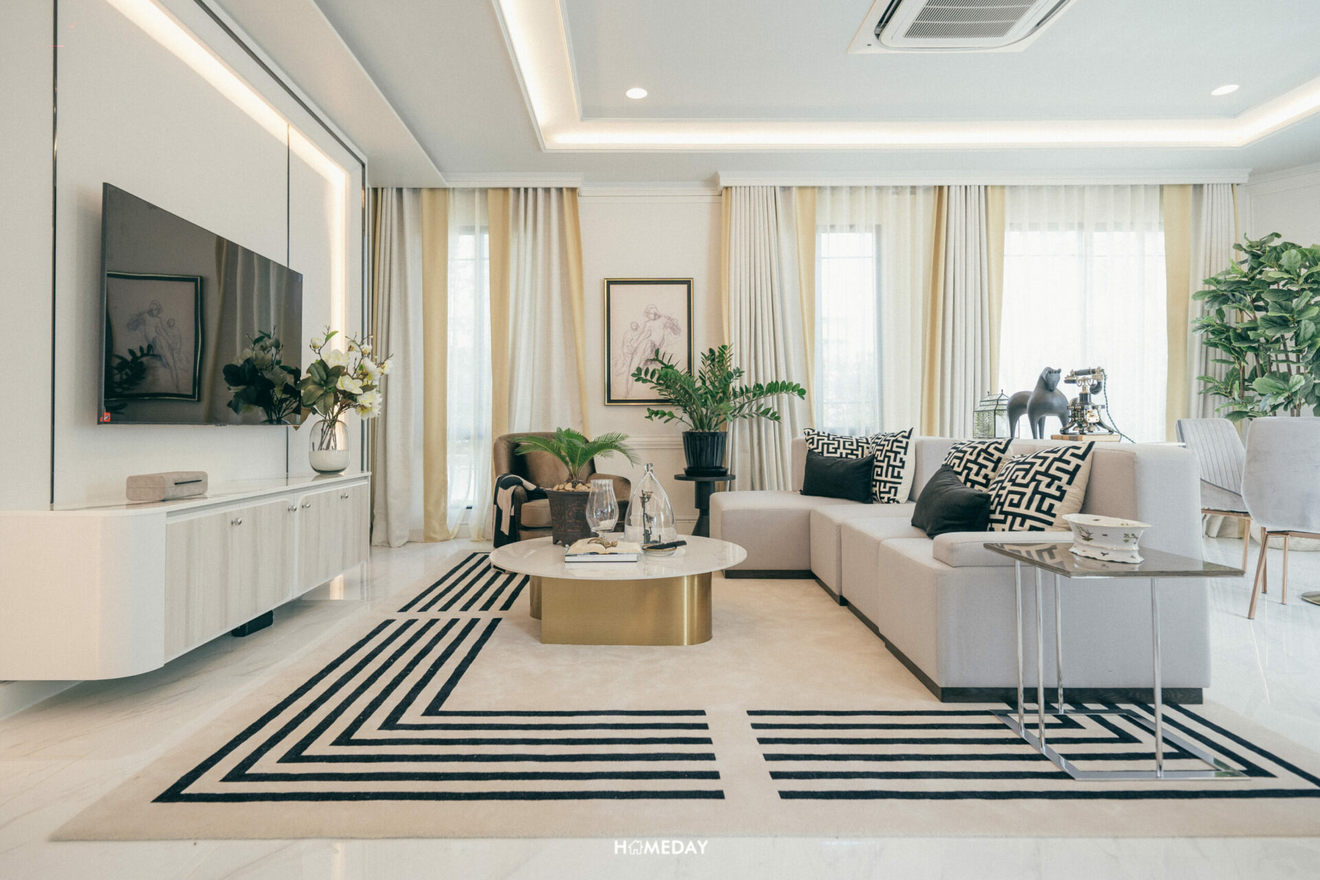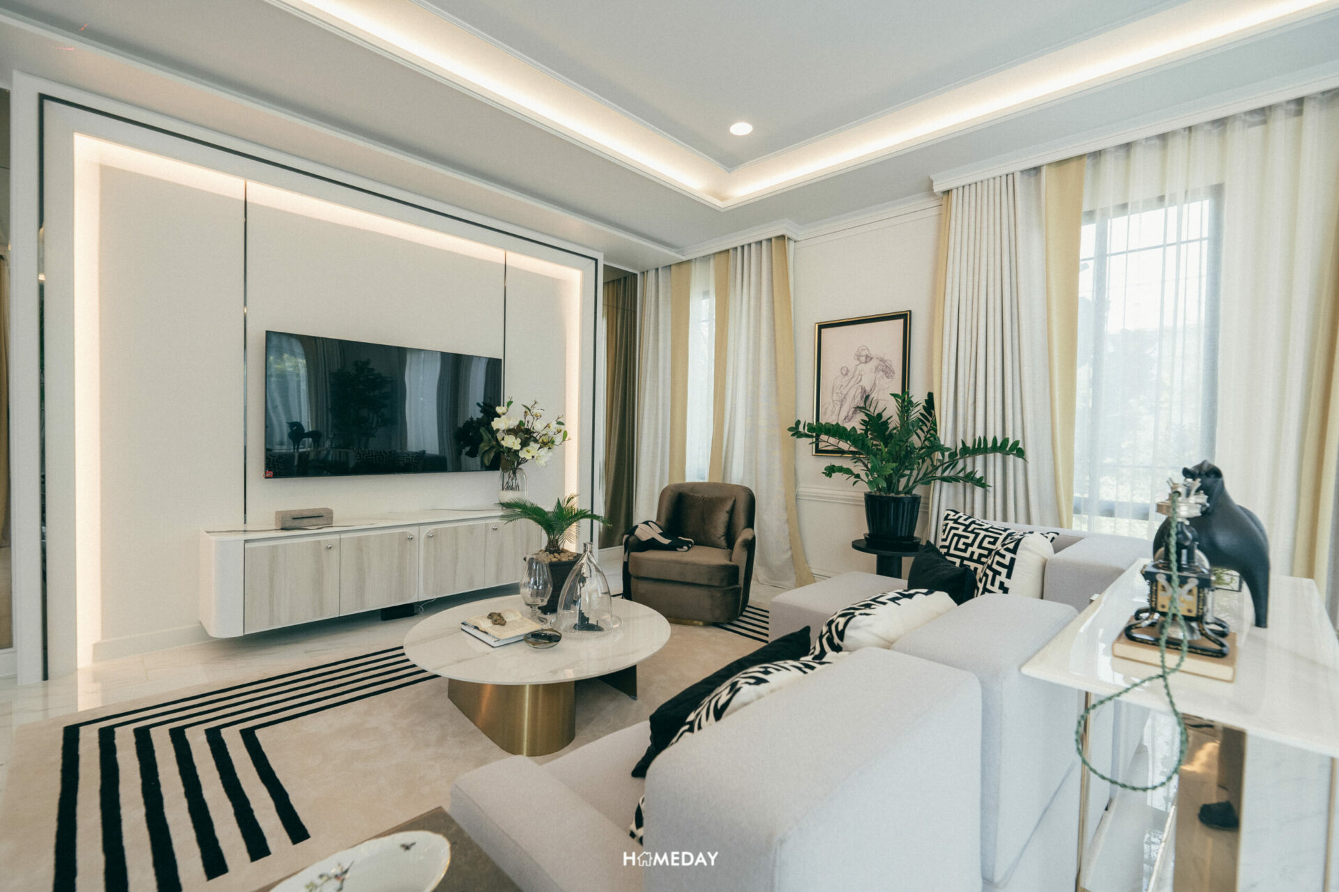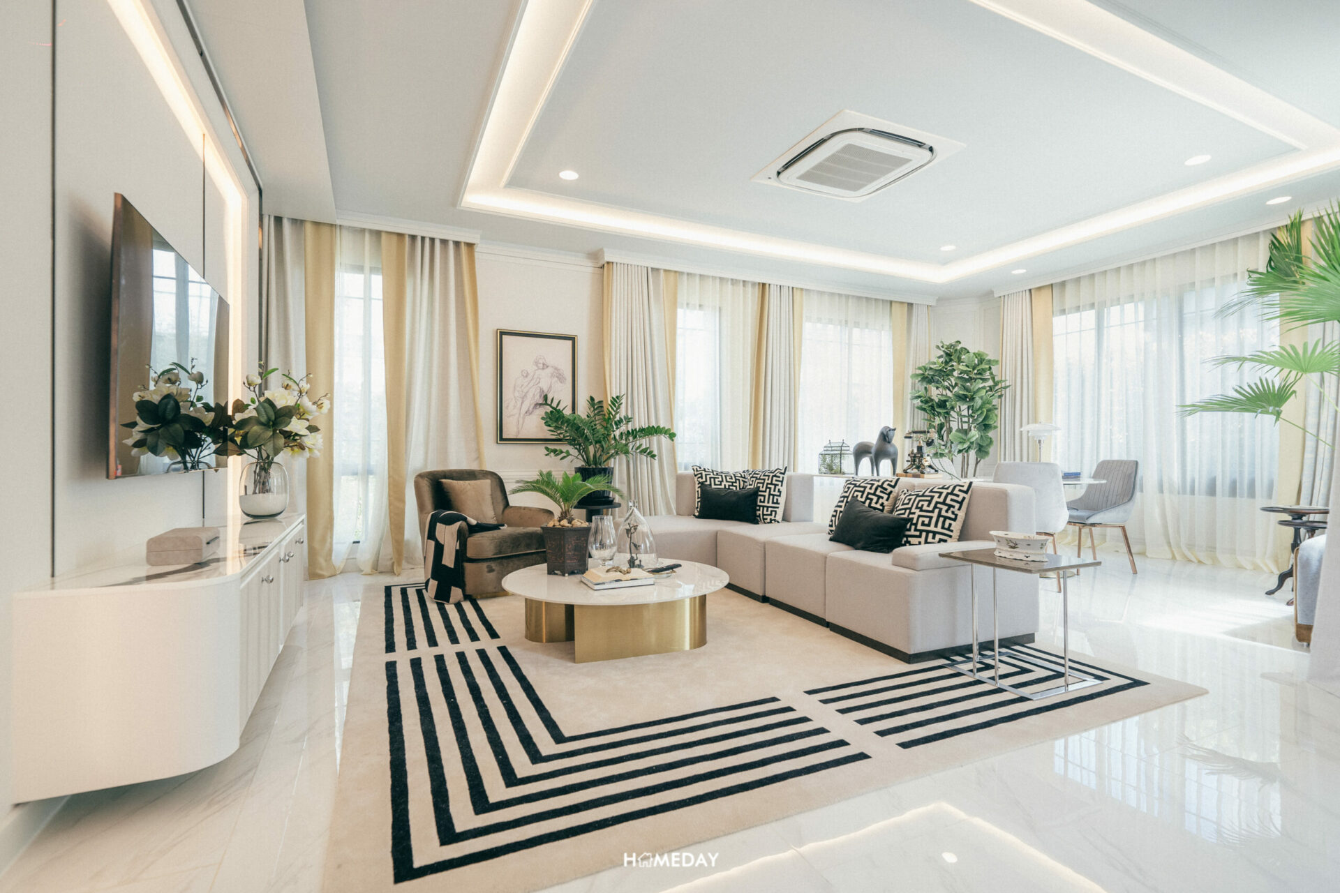 สำหรับพื้นที่แขวนทีวี ตรงนี้มีผนังฝั่งทึบมาให้หนึ่งจุด สามารถบิลต์อินชั้นวางทีวี ชั้นวางของต่าง ๆ ได้ตามดีไซน์ที่ชื่นชอบเลยครับ ส่วนขนาดของทีวีก็เลือกขนาดใหญ่ได้เต็มที่ ไม่มีปัญหากับระยะในการรับชมอย่างแน่นอน