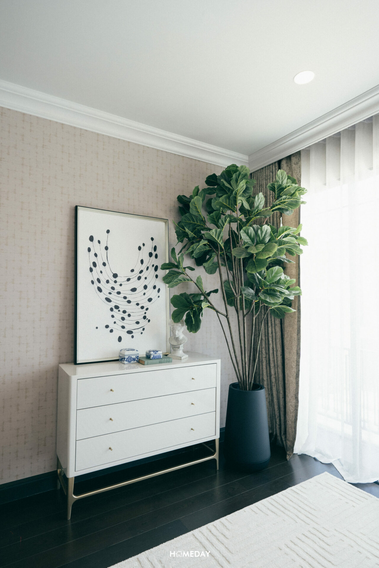ฝั่งผนังปลายเตียงวางต้นไม้ตกแต่งพร้อมด้วยตู้เก็บของ ยังเหลือพื้นที่ให้สามารถเดินเข้า-ออก ได้ไม่สะดุด ไม่อึดอัดเลยครับ
