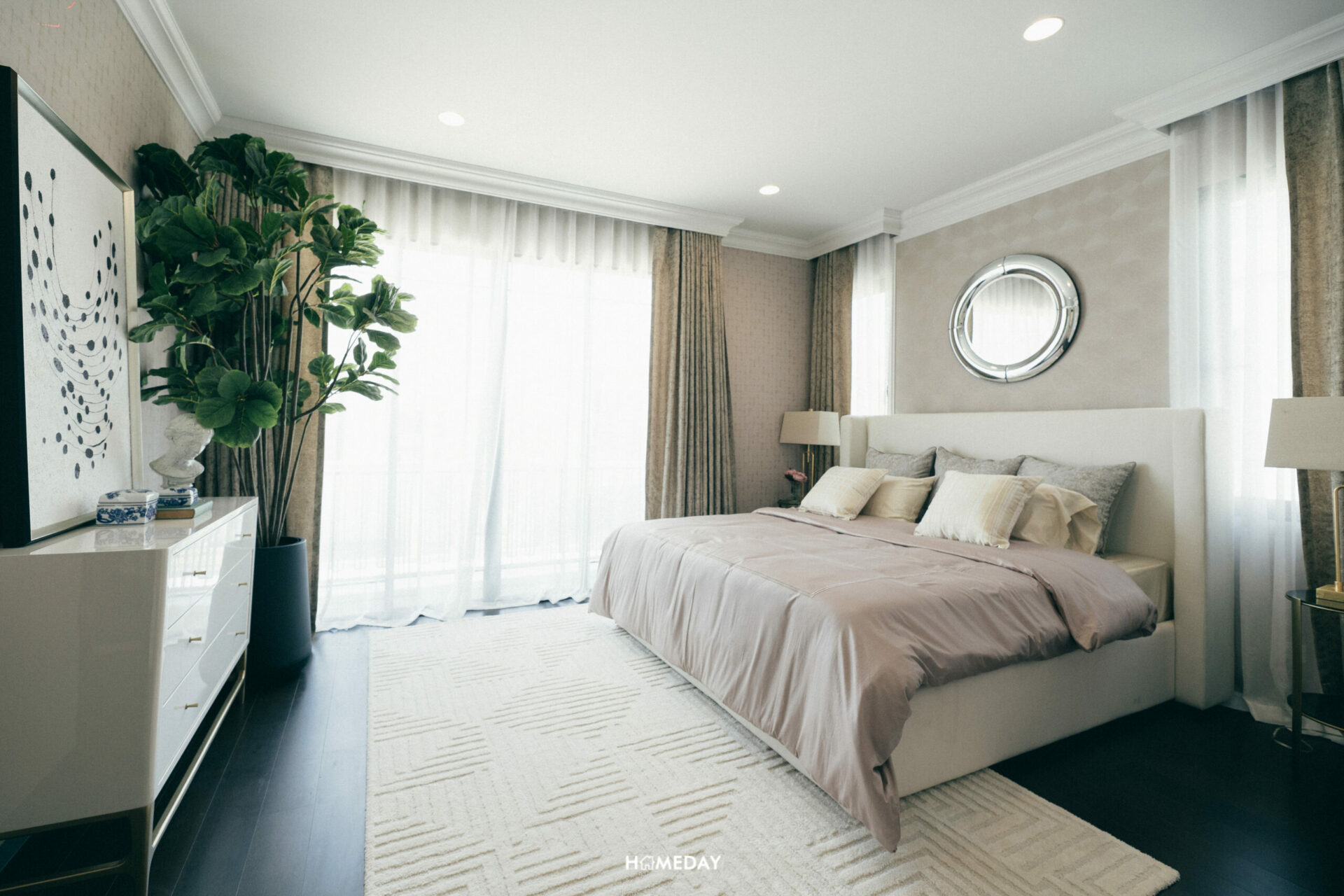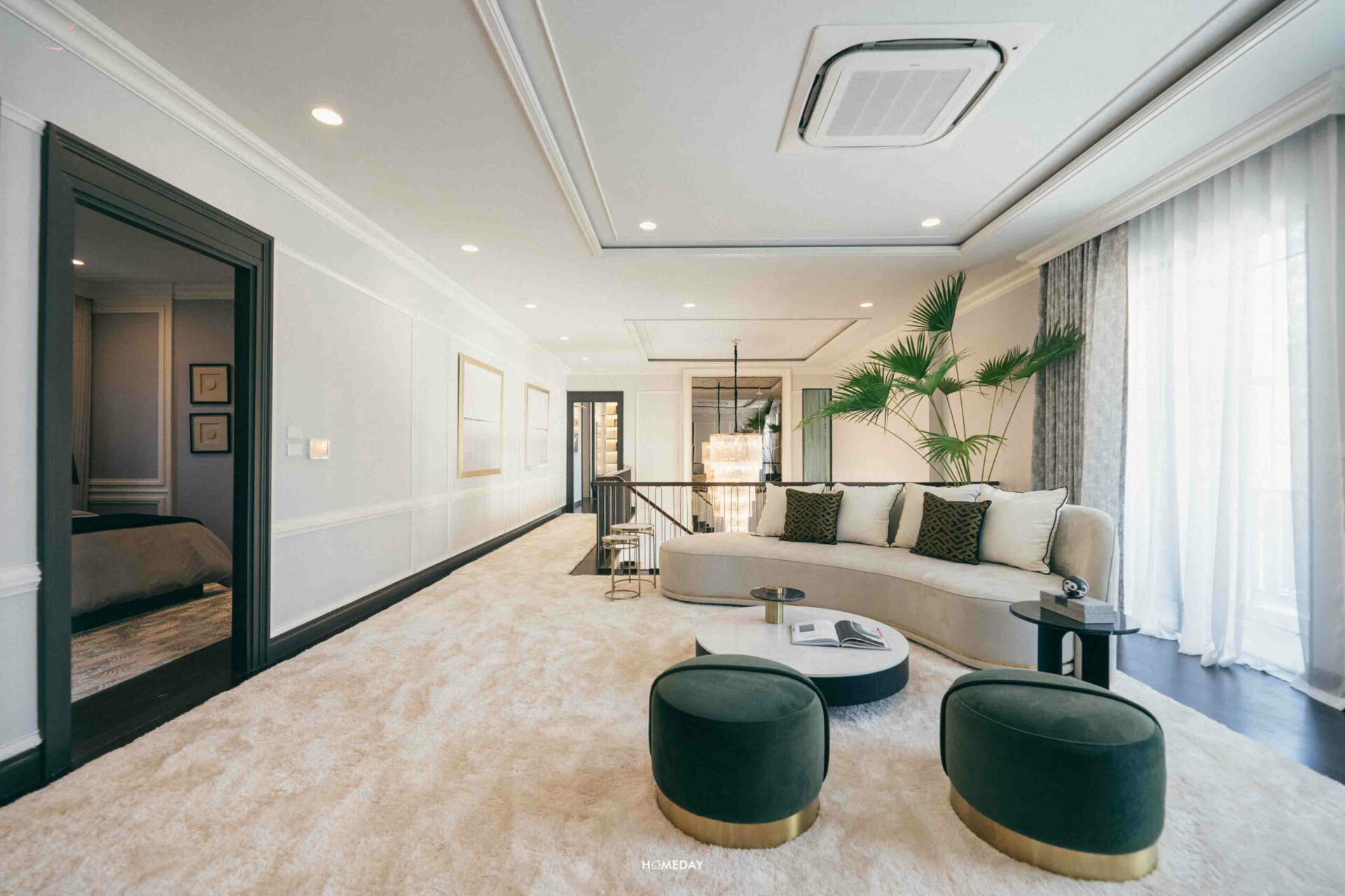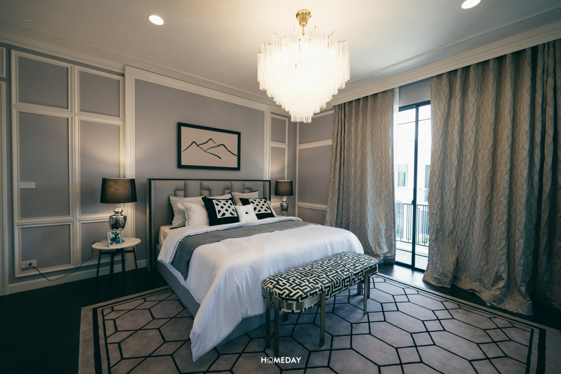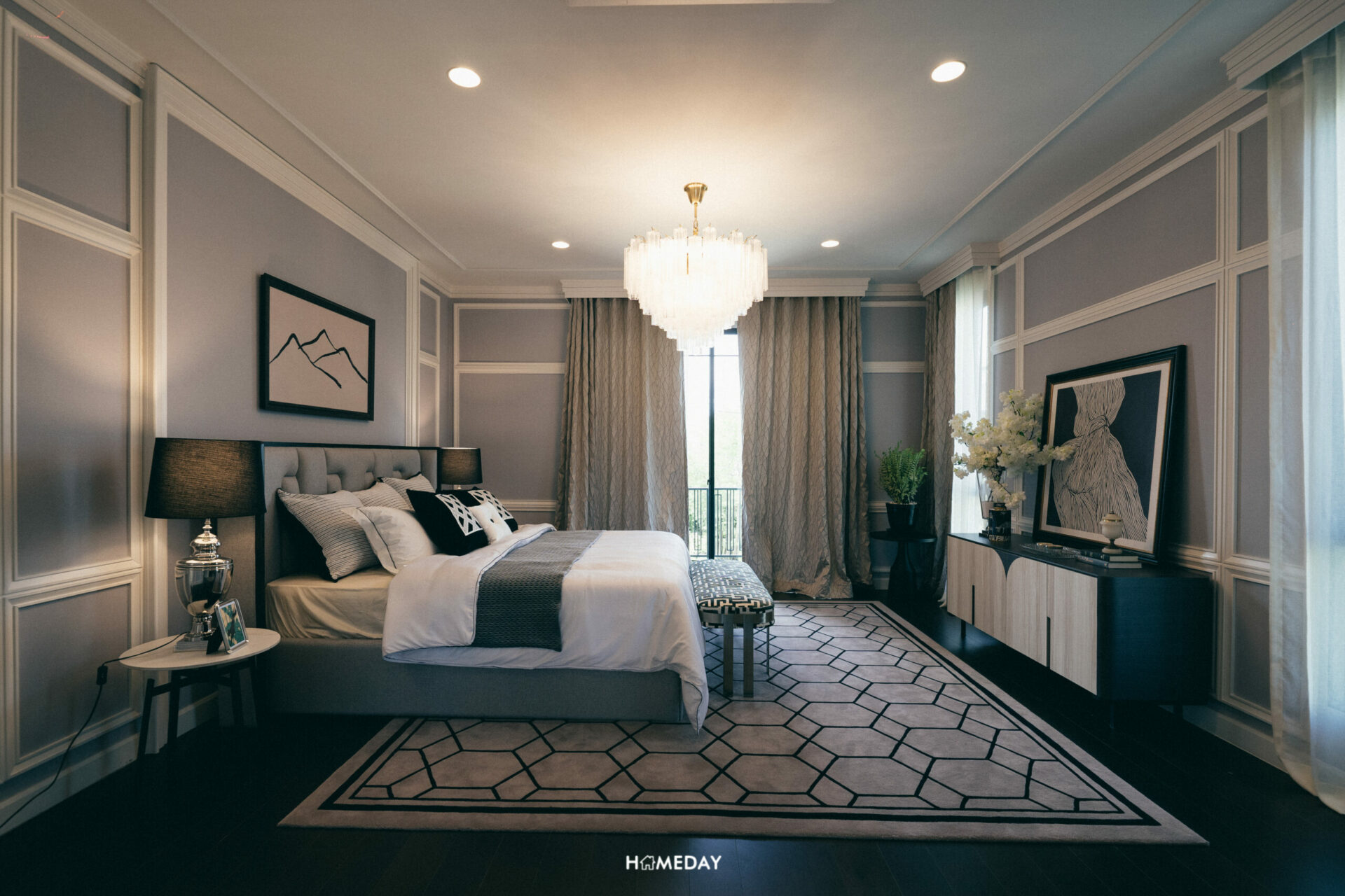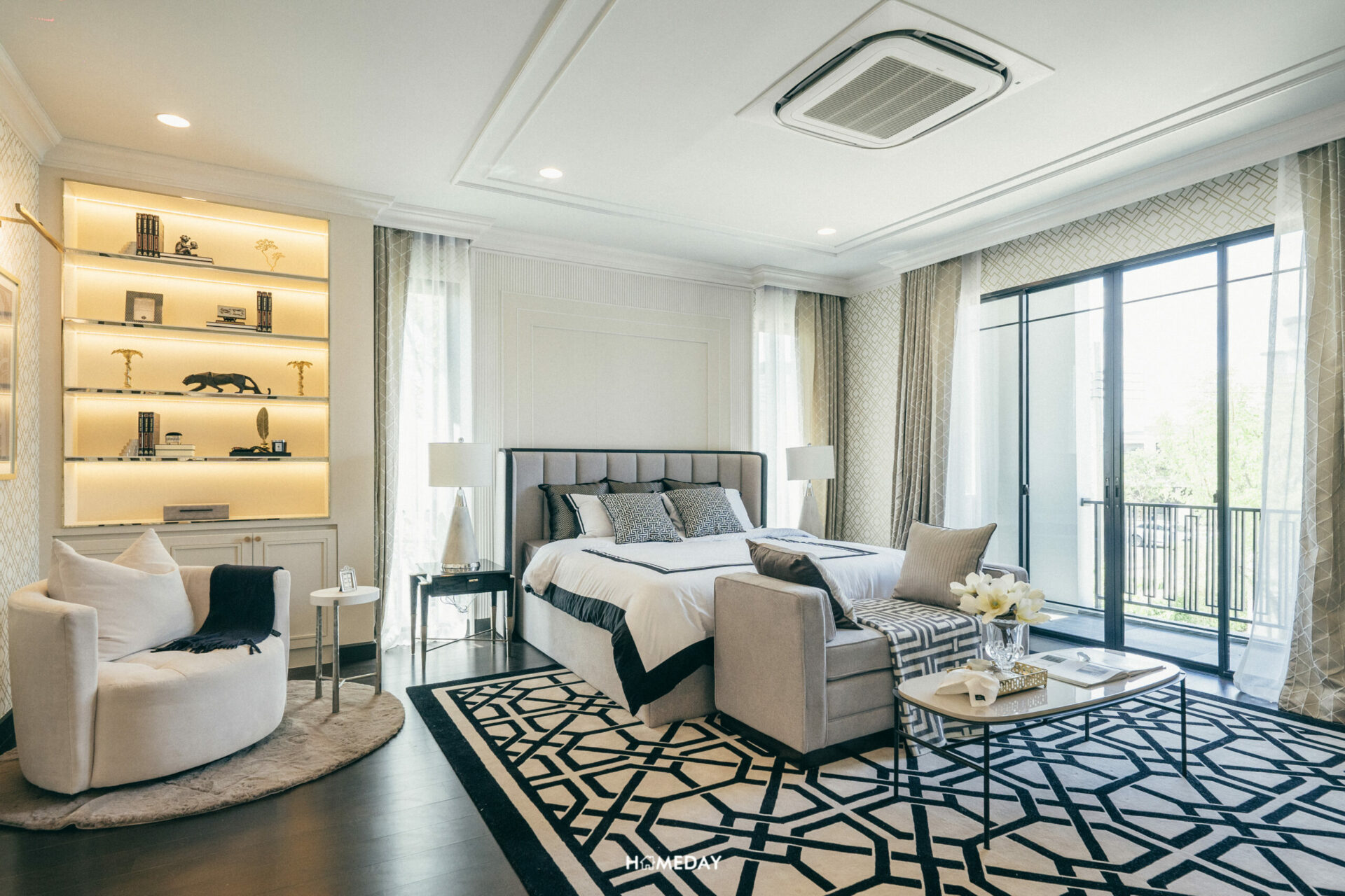 สำหรับพื้นที่พักผ่อนส่วนตัว มาเริ่มจากห้องที่ใหญ่ที่สุดอย่าง Grand Master Bedroom กันก่อนเลยครับ สำหรับห้องนอนห้องนี้ จะเป็นห้องนอนที่มีขนาดใหญ่ที่สุดของตัวบ้าน อยู่เชื่อมกับระเบียงของห้องที่สามารถเปิดออกเพื่อใช้งานได้จริง ขนาดของห้องสามารถวางเตียง King Size ได้