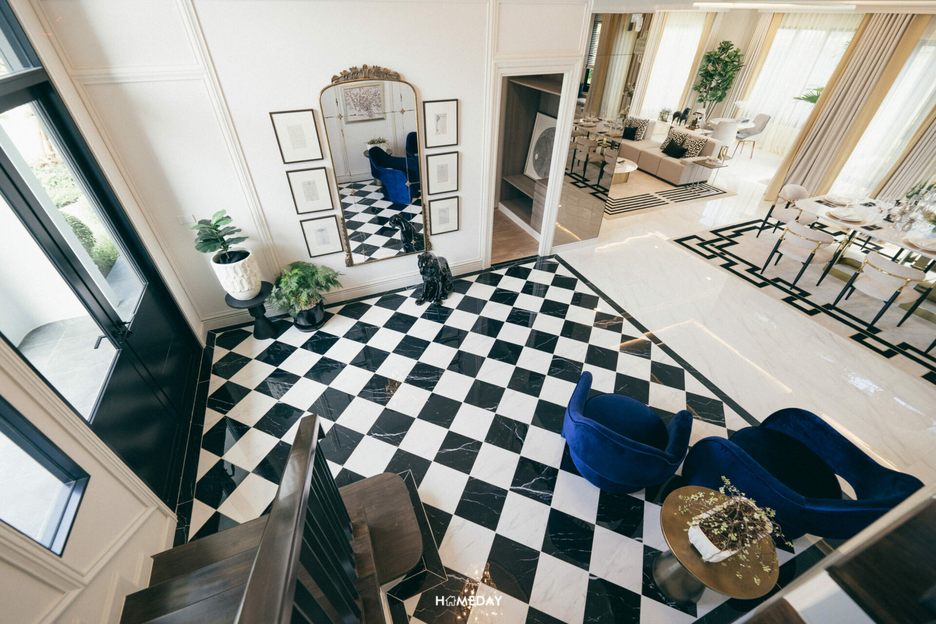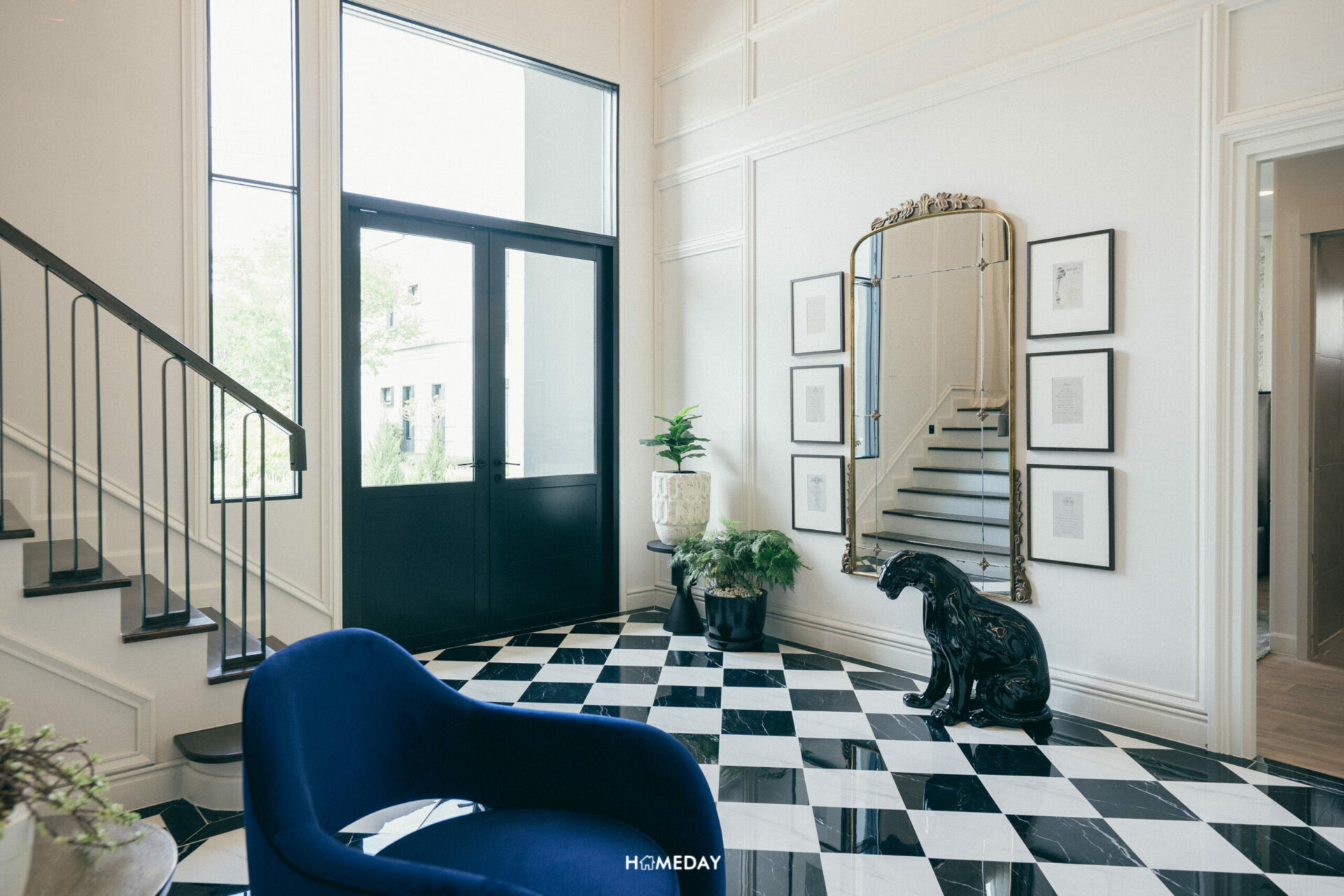 ทางเข้าหลัก เมื่อเปิดประตูเข้ามา จะถูกต้อนรับด้วย Double Volume Foyer สูง 6.3 เมตรก่อนเลยครับ ด้วยความสูงระดับนี้ บวกกับช่องแสงขนาดใหญ่ ช่วยส่งเสริมให้ตัวบ้านมีความโอ่โถง สง่างาม ปลอดโปร่งมากเป็นพิเศษ ซ้ายมือติดทางเข้าจะเป็นบันไดทางขึ้นชั้น 2 ครับ ด้านข้างเหลือพื้นที่ให้สามารถประดับของตกแต่งต้อนรับแขก หรือจะใส่ฟังก์ชันการใช้งานอื่น ๆ ก็ได้เช่นกันครับ