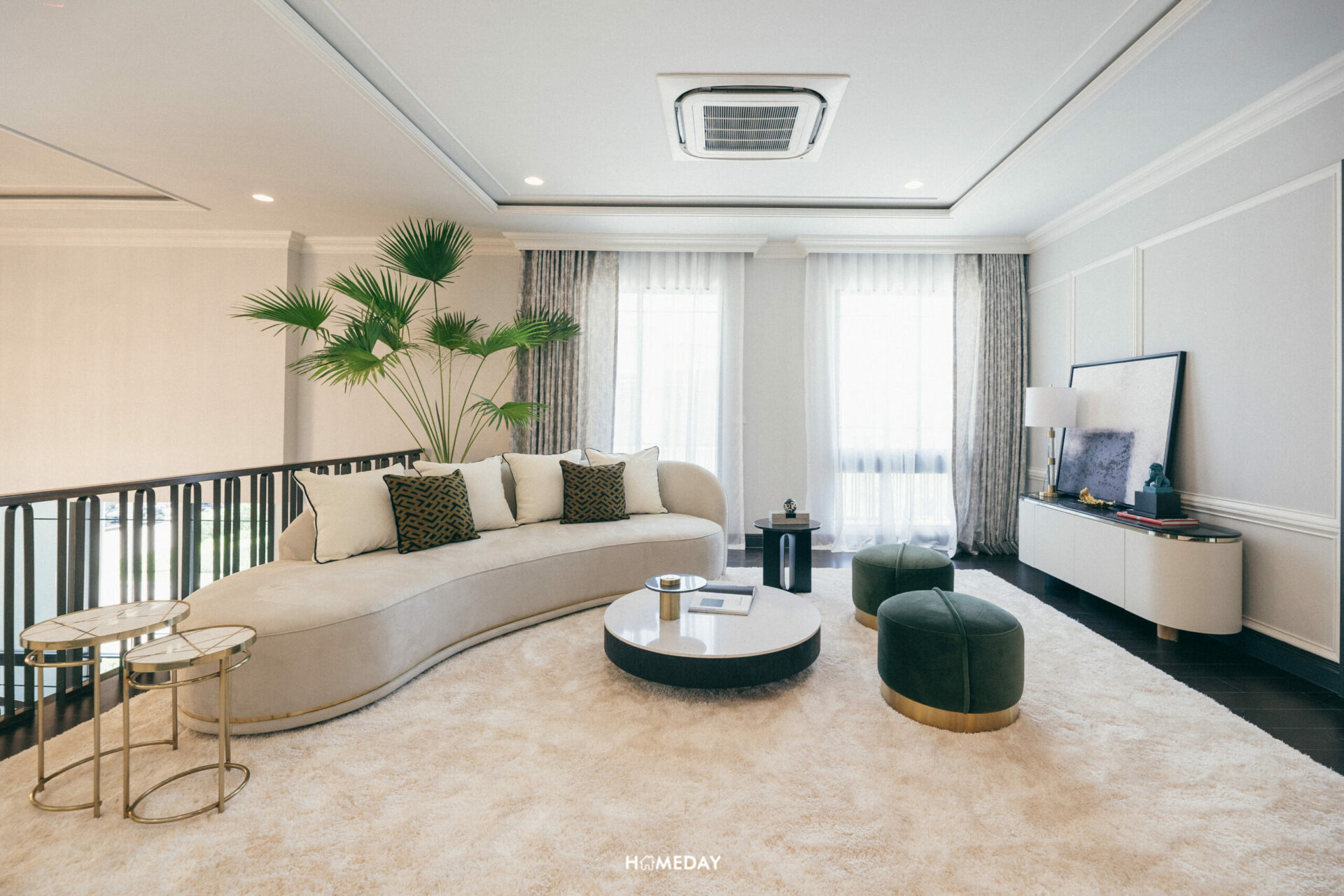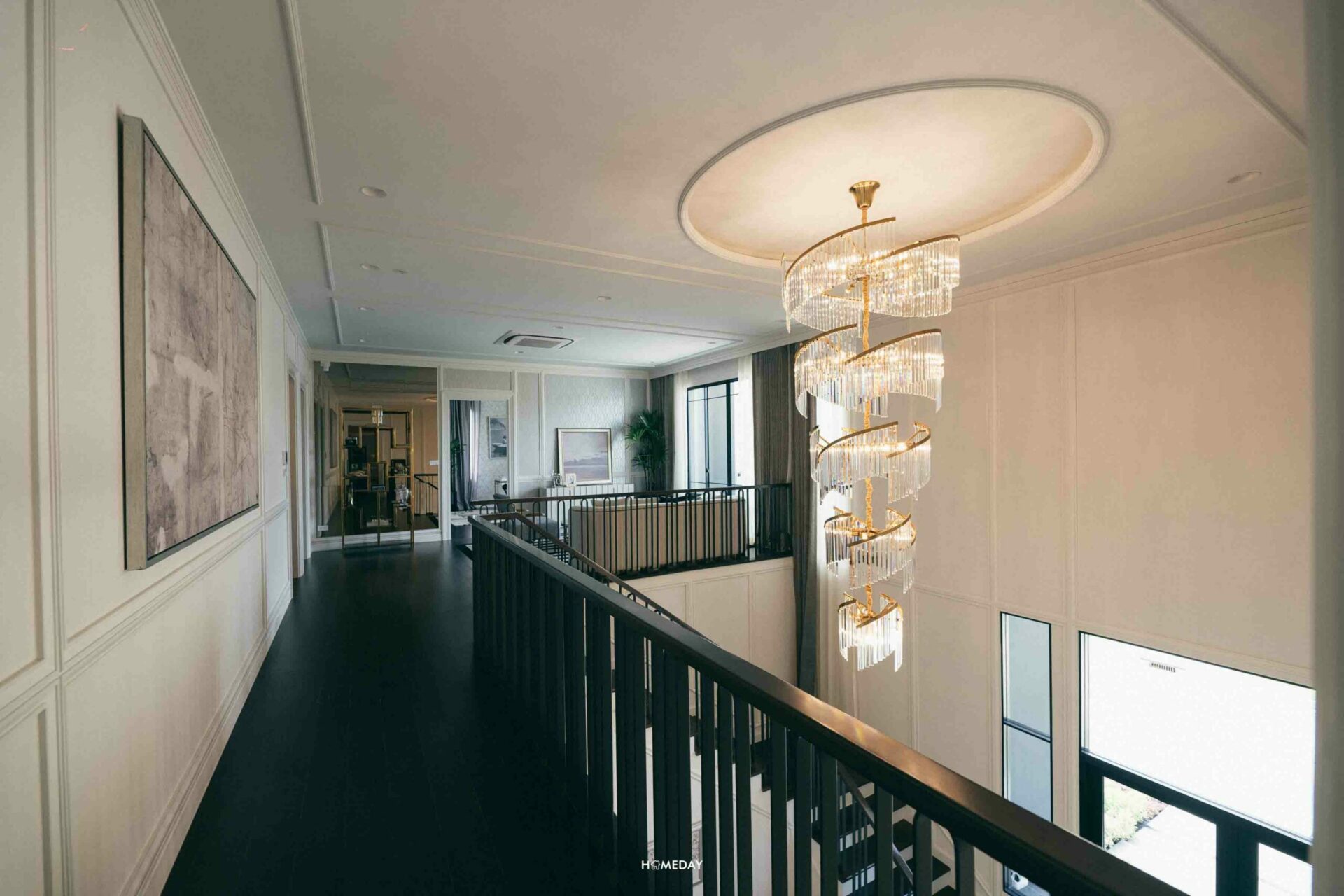มาดูที่ชั้น 2 กันบ้างดีกว่าครับ ขึ้นมาถึงเราก็จะเจอกับมุมพักผ่อนขนาดใหญ่อีกหนึ่งจุดแบบนี้เลย ซึ่งก็เปรียบเสมือน Living Room อีกหนึ่งจุดของตัวบ้าน ที่มีความเป็นส่วนตัวมากยิ่งขึ้น ขนาดของโถงกลางส่วนนี้ สามารถวางชุดโซฟาขนาดใหญ่และบิลต์อินชั้นวางทีวีที่ผนังอีกด้านหนึ่งได้เลยครับ ตรงนี้ได้ช่องแสงขนาดใหญ่ที่ด้านข้าง และพื้นที่โดยรอบไม่ถูกปิดกั้นด้วยกำแพง ให้ความรู้สึกโล่งสบาย ผ่อนคลายไปอีกแบบครับ หรือใครจะปรับพื้นที่ตรงนี้เป็นส่วนใช้งานอื่น ๆ ก็สามารถทำได้เช่นกัน