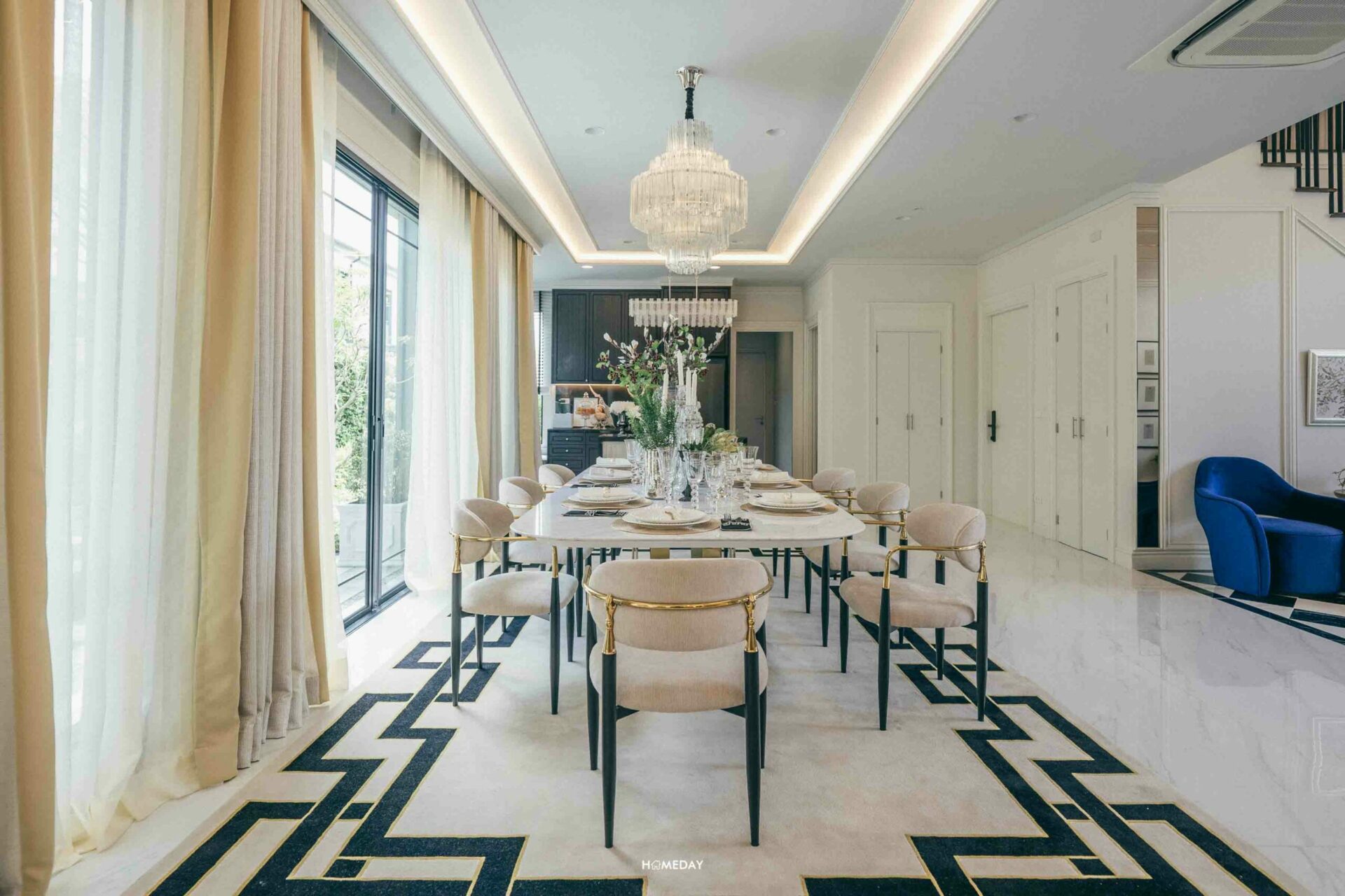 ถัดเข้าไปด้านใน ตรงนี้จะเป็นพื้นที่ Open Space หน้ากว้าง ขนาดใหญ่ ตรงกลางของพื้นที่ โครงการตกแต่งวางเป็นชุดโต๊ะเก้าอี้นั่งรับประทานอาหารขนาด 8 ที่นั่งเอาไว้ให้ดูเป็นแนวทาง ด้านหลังเป็นบานกระจกขนาดใหญ่ มองเห็นสวนด้านนอกของตัวบ้าน ซึ่งสามารถเปิดออกเพื่อเชื่อมพื้นที่ถึงกันได้ ซ้ายมือตกแต่งให้ดูเป็น Pantry ส่วนขวามือจะเป็น Living Room ครับ