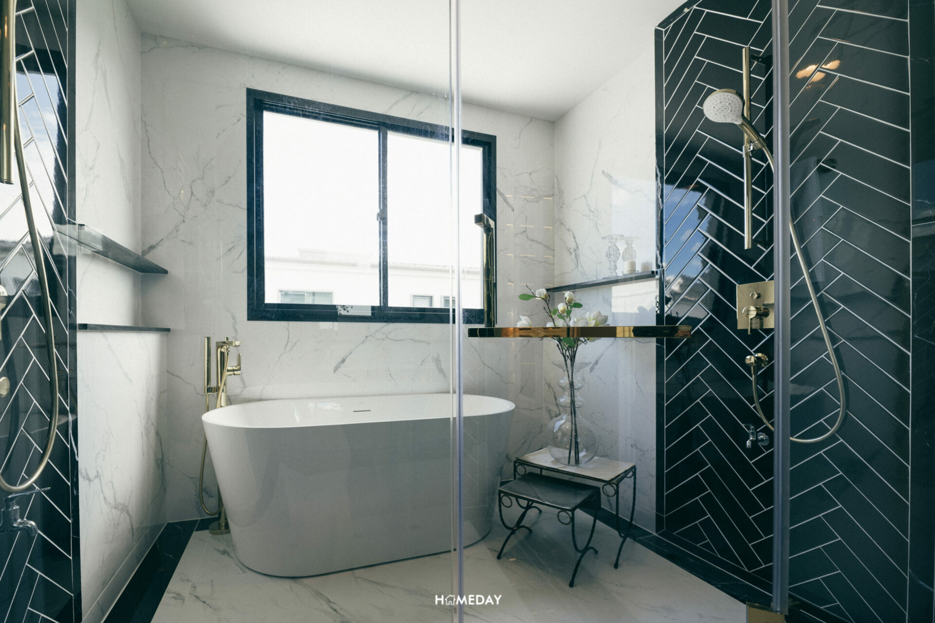 ทางด้านของโซนเปียก จุดเด่นที่เห็นได้ชัดเลยคือบานกระจกขนาดใหญ่ รับแสงเข้ามาในห้องได้อย่างเต็มที่ ช่วยให้ห้องน้ำโปร่ง ระบายความชื้นได้ดีอีกด้วยครับ ส่วนนี้จะกั้นแยกจากโซนแห้งด้วย Partition กระจกใส ด้านในมี Rain Shower, Hand Shower และ Drop Wall สำหรับวางของ 2 จุด ซ้ายและขวา ตรงกลางจะเป็นอ่างอาบน้ำ ซึ่งการออกแบบนี้ไม่ค่อยได้เห็นบ่อยนัก ถือเป็นการคิดเพื่อผู้อยู่อาศัยอย่างแท้จริง ยิ่งในช่วงเวลาเร่งด่วนยามเช้า ก็สามารถใช้งานห้องน้ำไปพร้อมกันได้เลย ตอบโจทย์คู่รักได้เป็นอย่างดีครับ