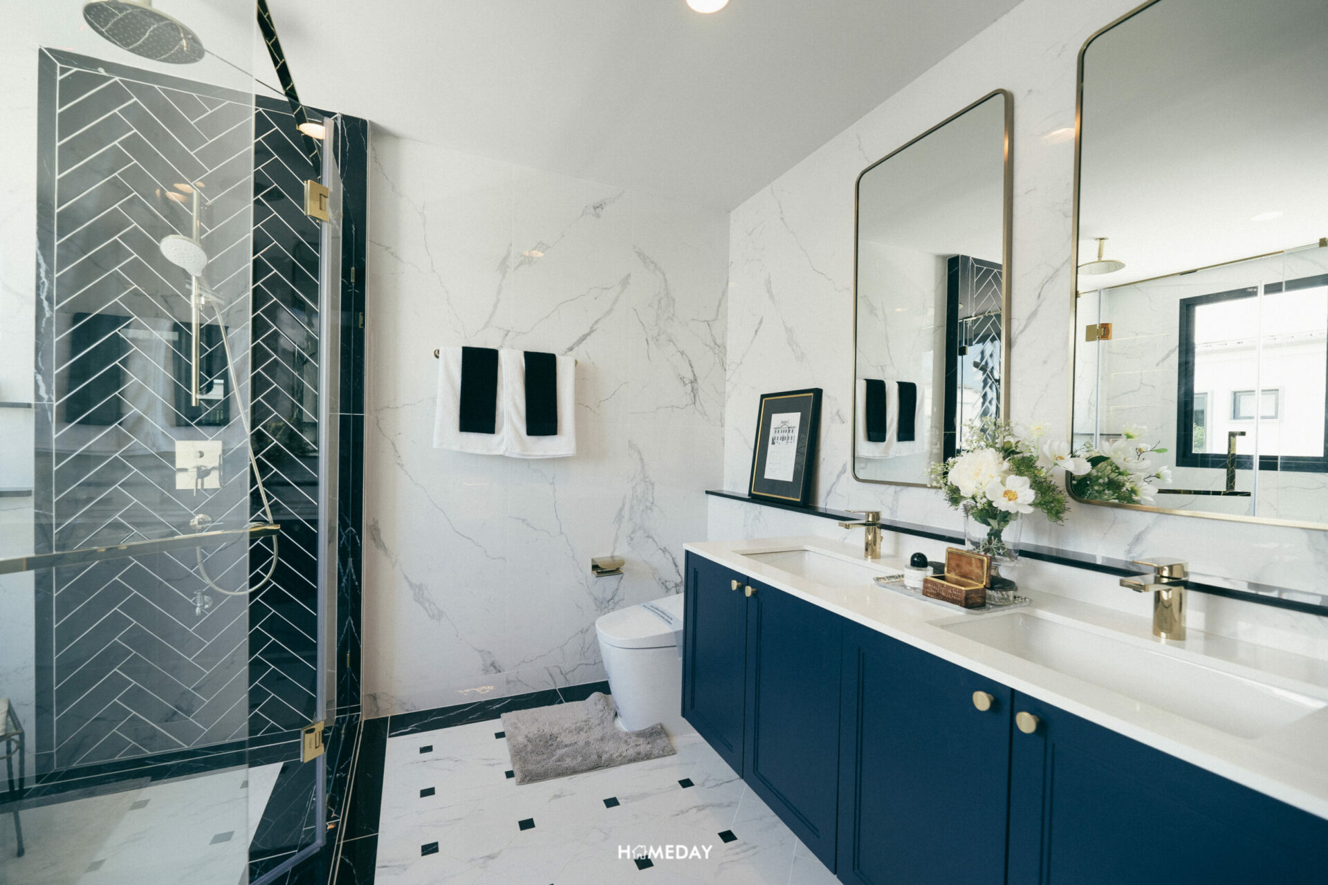ซ้ายมือถัดจาก Walk-in Closet จะเป็นห้องน้ำภายในตัวของห้องนี้นั่นเองครับ ทางโครงการออกแบบตกแต่งมาให้สวยงามมาก ๆ แบ่งพื้นที่ใช้งานโซนเปียกและแห้งออกจากกันอย่างชัดเจน ซ้ายมือสุดจะเป็นเคาน์เตอร์อ่างล้างหน้าแบบ Double Sink พร้อมบานกระจก และ Low Wall ความยาวจรดไปถึงบริเวณโถสุขภัณฑ์ สามารถวางผลิตภัณฑ์ต่าง ๆ รวมไปถึงของตกแต่งได้อย่างเต็มที่ ดูแลและเช็ดทำความสะอาดได้อย่างง่ายดาย
