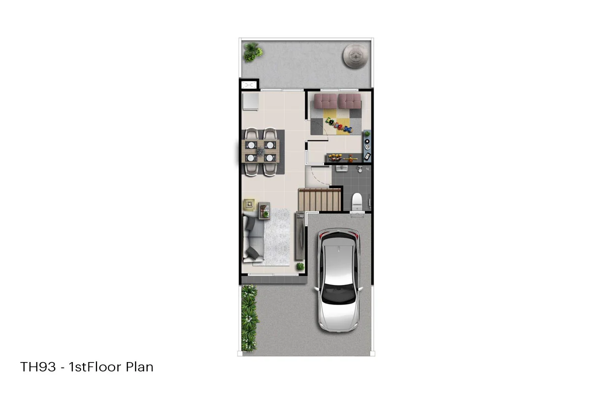 พื้นที่ใช้สอย 93 ตร.ม. หน้ากว้าง 5.2 เมตร 2 ห้องนอน 3 ห้องน้ำ ส่วนรับประทานอาหาร ห้องอเนกประสงค์ 1 ห้องรับแขก ที่จอดรถ 1 คัน
