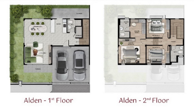 • แบบบ้าน ALDEN | บ้านแฝด 2 ชั้น ที่ดินเริ่มต้น 36 ตร.ว. พื้นที่ใช้สอย 162 ตร.ม. ฟังก์ชันบ้าน 3 ห้องนอน, 3 ห้องน้ำ, 1 ห้องรับแขก, 1 ห้องครัว, 1 ห้องเก็บของ และ 2 ที่จอดรถ