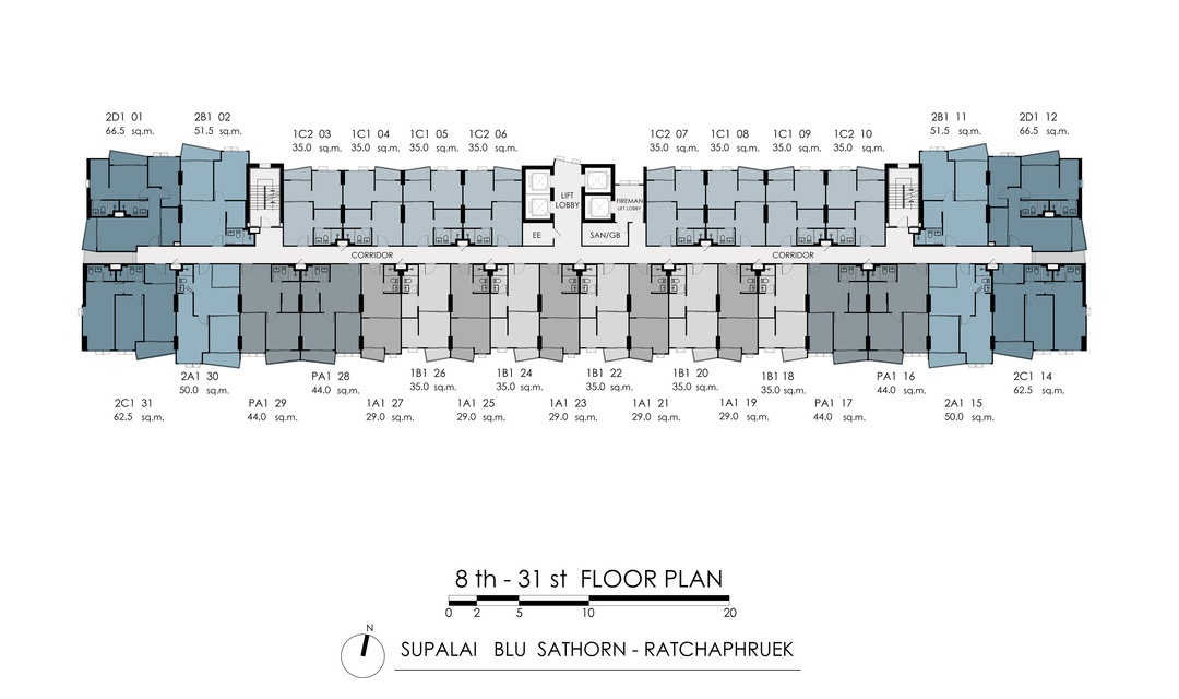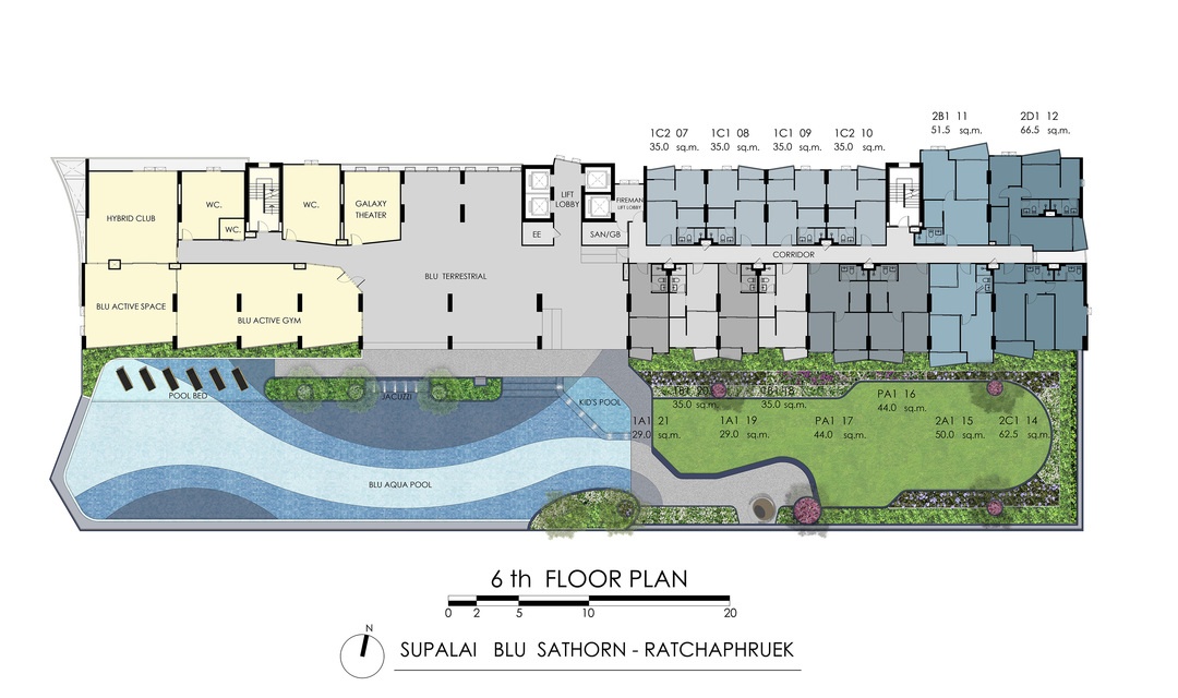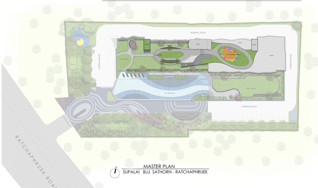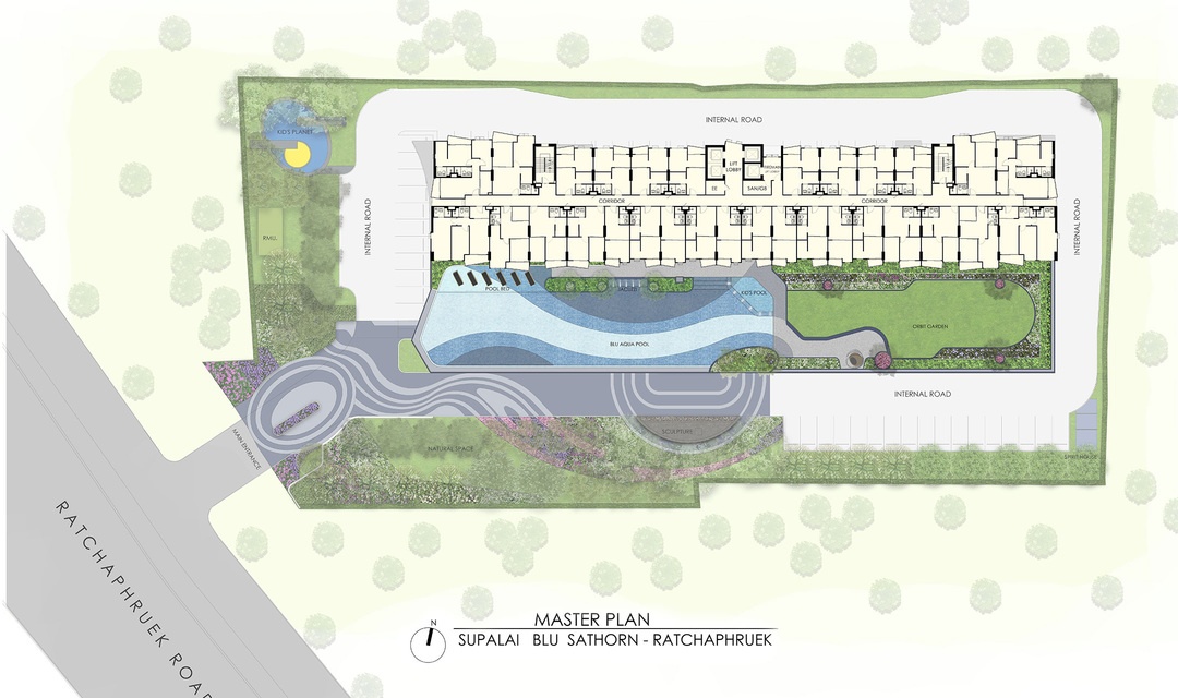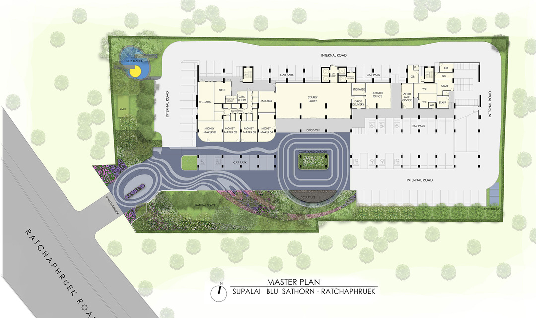 ผังโครงการ ชั้นล่าง : โถงทางเข้าอาคาร, สวนรวมใจ, ฟิตเนสโซน(สระว่ายน้ำ, ห้องออกกำลังกาย)ห้องเรียนรู้, ห้องคุณหนู, ห้องชุดพักอาศัย, ห้องเครื่อง และที่จอดรถชั้น 2-4