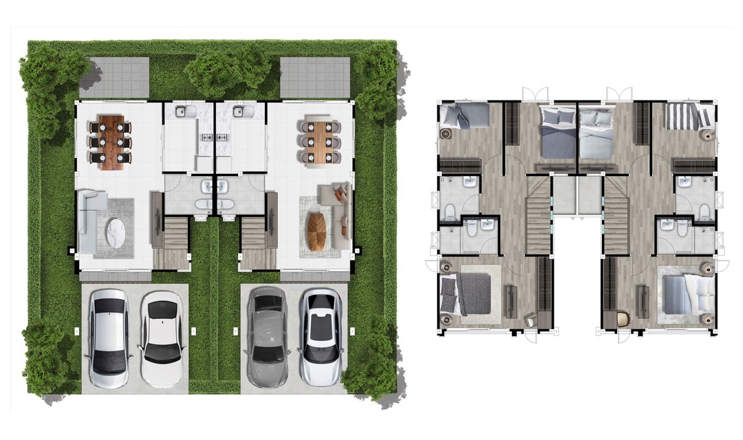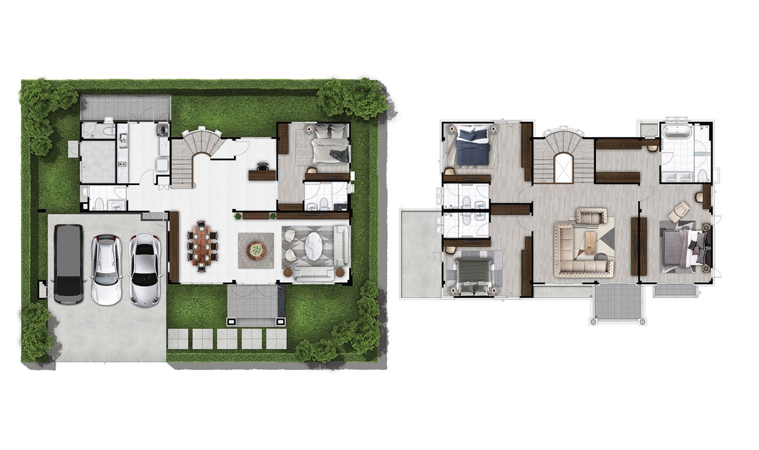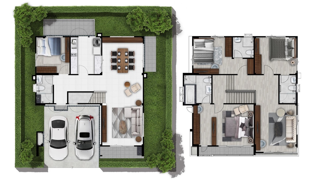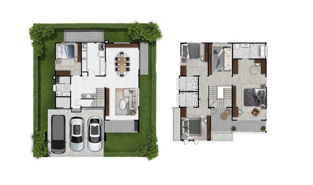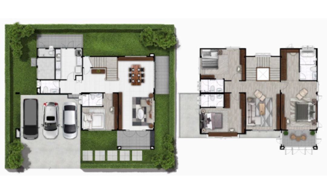 บ้านเดี่ยว 2 ชั้น พื้นที่ใช้สอย 295 ตร.ม. 4 ห้องนอน 6 ห้องน้ำ 3 ที่จอดรถ