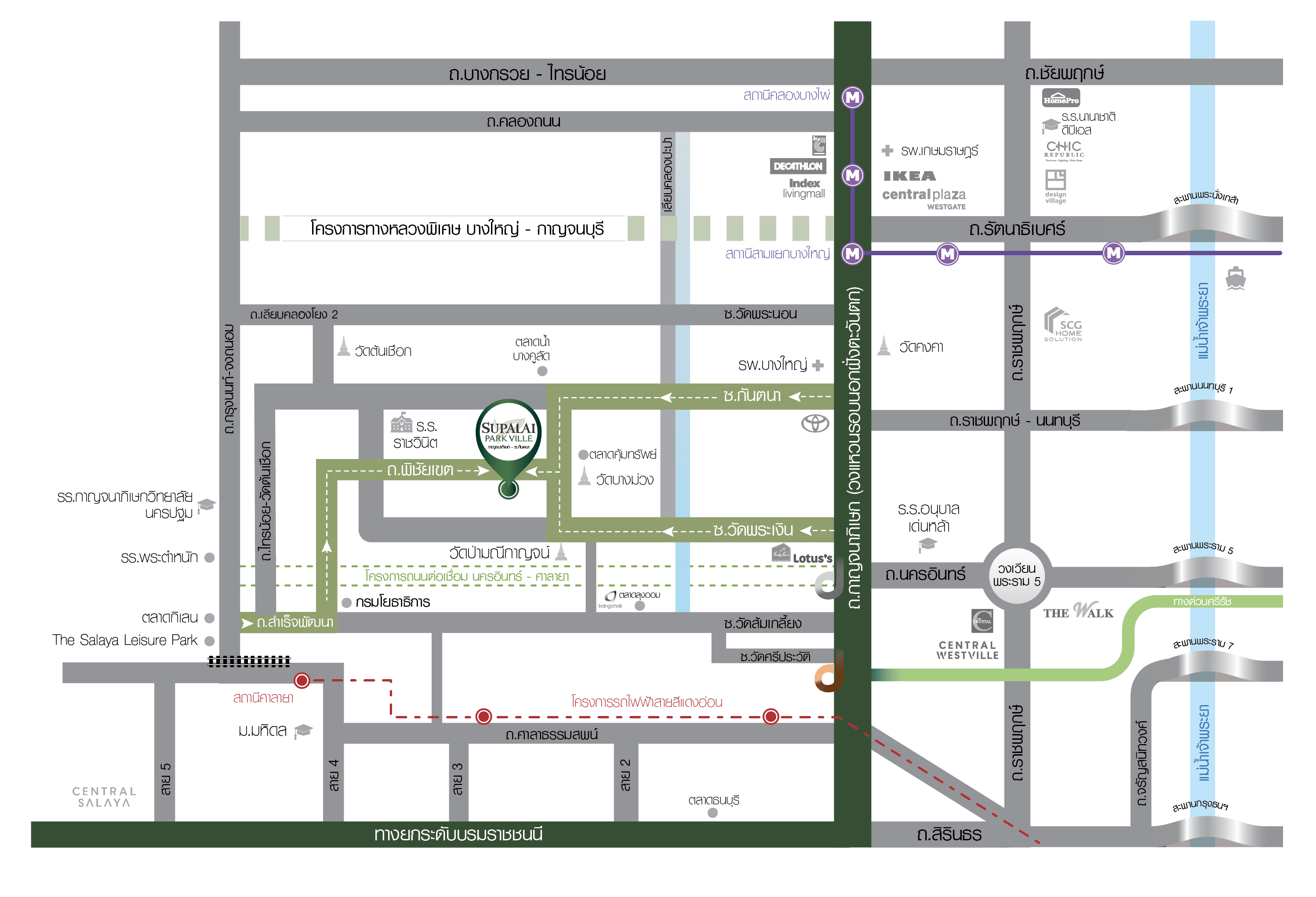 การเดินทางถนนกาญจนาภิเษกถนนพุทธมณฑล สาย 3ถนนพุทธมณฑล สาย 4ทางด่วนพิเศษศรีรัชรถไฟฟ้าสายสีแดงอ่อน สถานีศาลายา (โครงการในอนาคต)