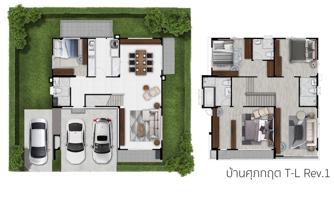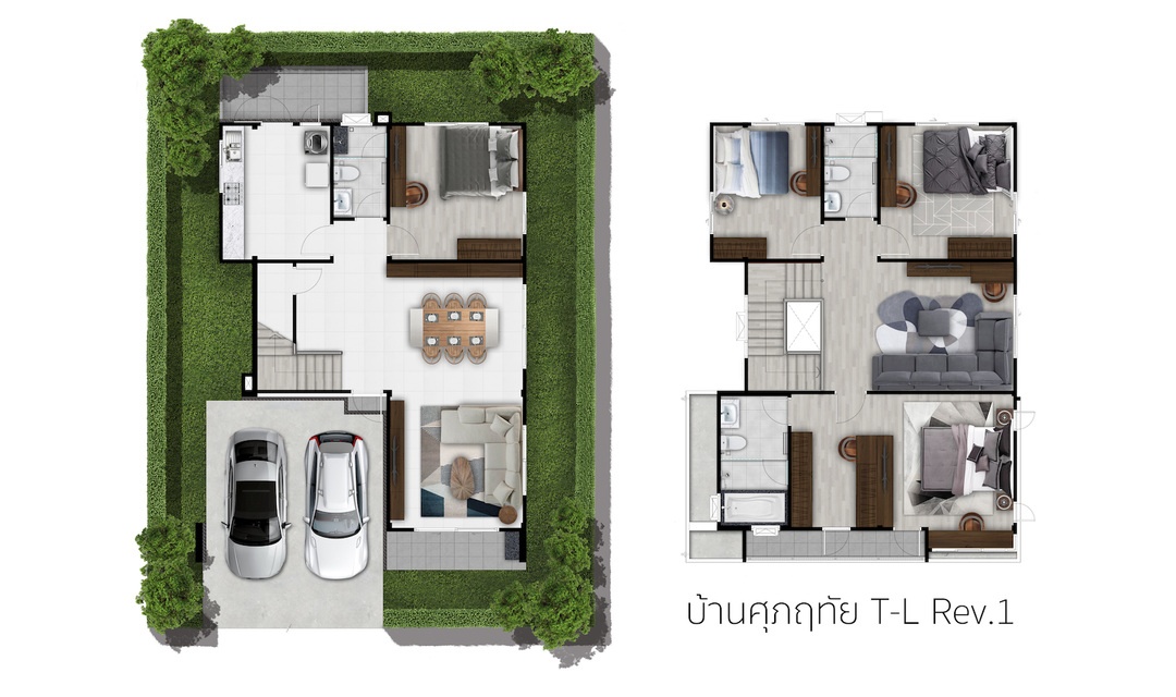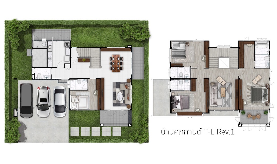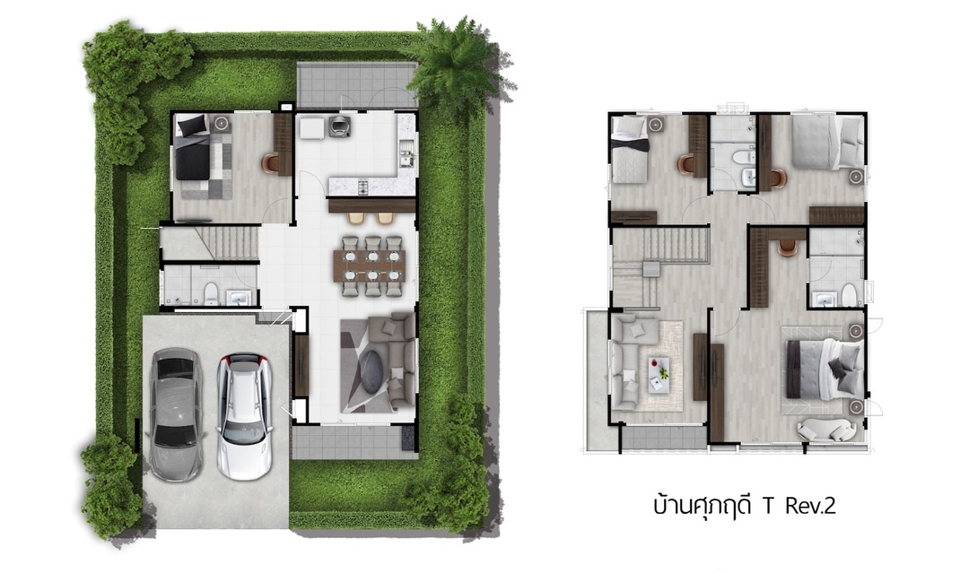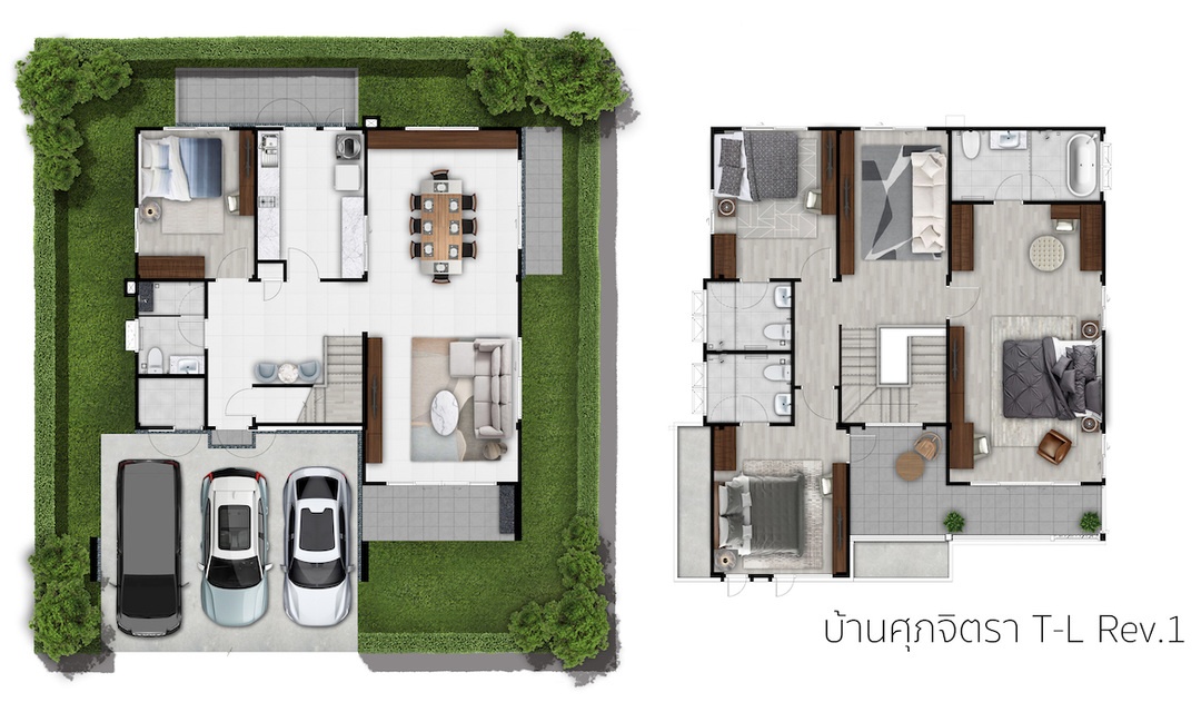 เป็นบ้านที่แบ่งพื้นที่ใช้สอยได้ลงตัว พื้นที่ใช้สอยแต่ละส่วนกว้างขวาง ใช้ประโยชน์ได้คุ้มค่า พื้นที่ห้องรับแขก ห้องรับประทานอาหารและโถง เปิดโล่งเชื่อมถึงกันให้ความรู้สึกโปร่งสบายกว่า ห้องรับประทานอาหารมีประตูกระจกเปิดออกสู่พื้นที่พักผ่อนด้านข้าง สัมผัสกับบรรยากาศภานนอกได้ ห้องนอนชั้นล่างใช้เป็นห้องนอนผู้สูงอายุได้ ห้องมีขนาดใหญ่ ห้องนอน 1 มีขนาดใหญ่พร้อมห้องน้ำในตัว และฝ้าเพดานสูงให้ความรู้สึกที่โอ่โถง พร้อมด้วยระเบียง ชั้นบนออกแบบให้เล่นระดับพื้นระหว่างห้องนอนใหญ่กับห้องอื่น ให้ความรู้สึกเป็นสัดส่วน ห้องนั่งเล่น มีหน้าต่างเข้ามุมเพิ่มพื้นที่การใช้งาน และมุมมองจากภายในสู่ภายนอก สามารถเปลี่ยนเป็นห้องนอน เหมาะกับครอบครัวที่ต้องการห้องนอนเพิ่ม หรือเปลี่ยนเป็นห้องทำงานได้ จอดรถในร่ม 2 คัน กลางแจ้ง 1คัน การออกแบบเน้นการอนุรักษ์พลังงาน