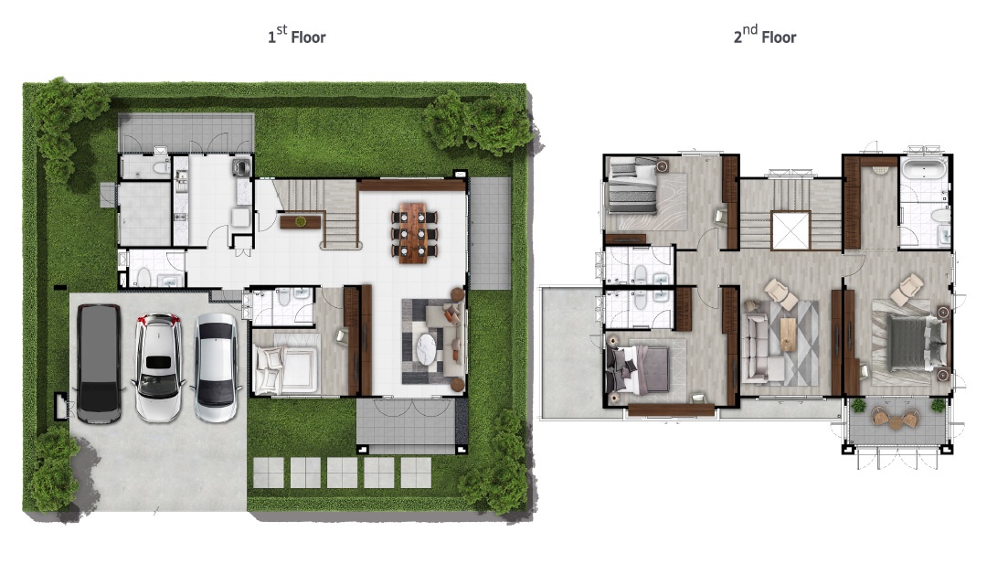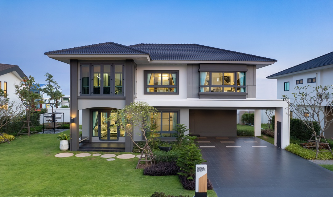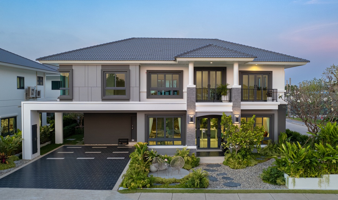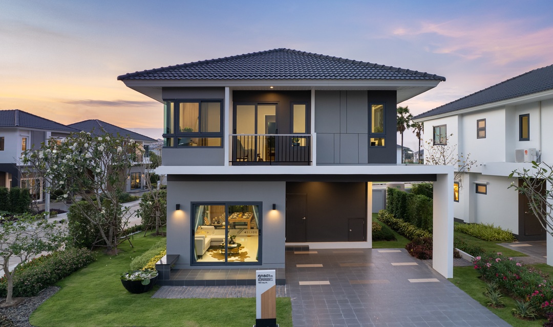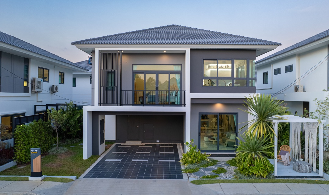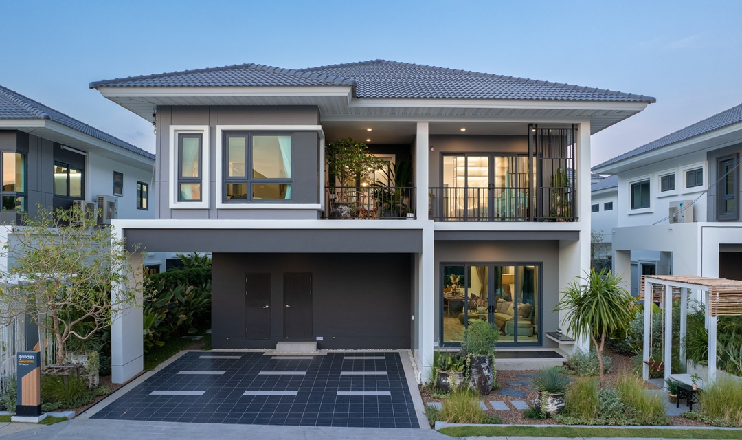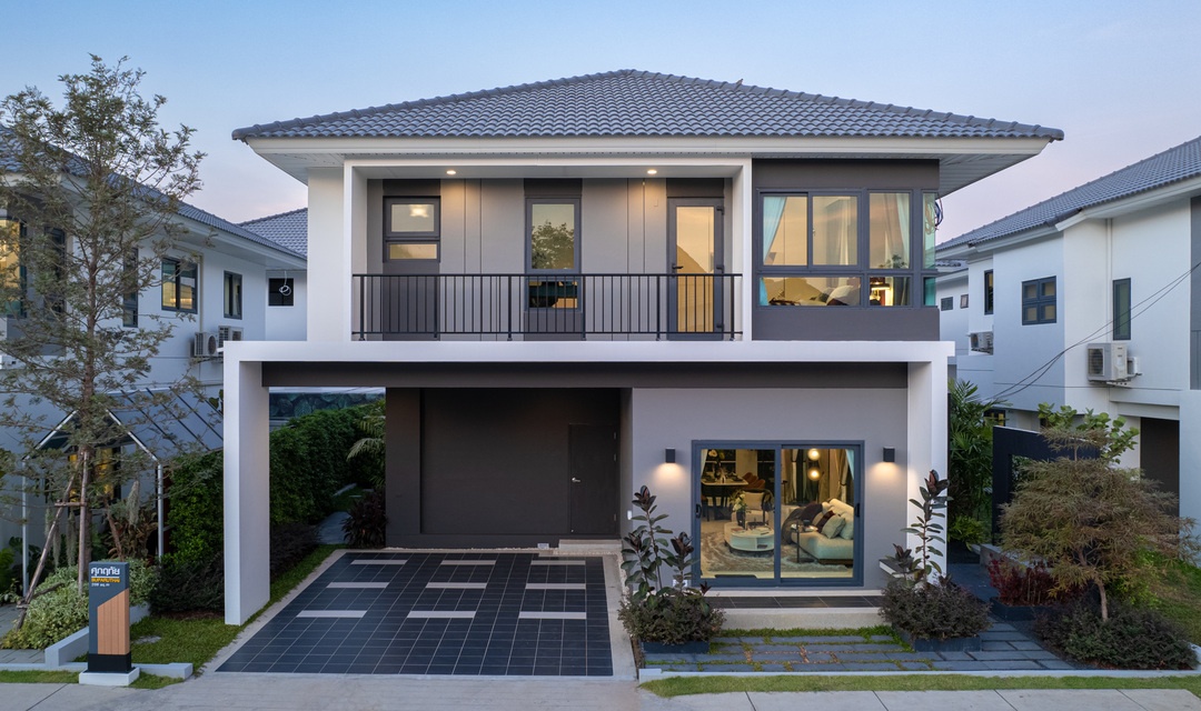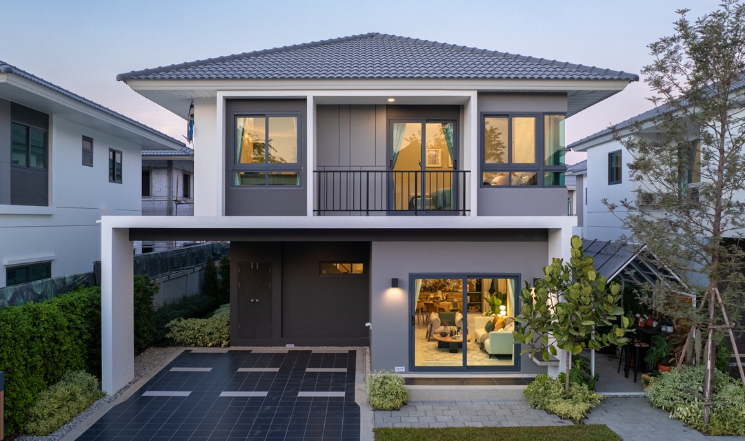 บ้านที่เราพามาชมกันวันนี้ เป็นแบบบ้านเดี่ยวของทางโครงการค่ะ ด้านหน้าบ้านได้พื้นที่จอดรถ 2 คัน ติดกับลานจอดรถจะมีห้องเก็บของพร้อมทางเข้ารองอยู่ค่ะ สะดว