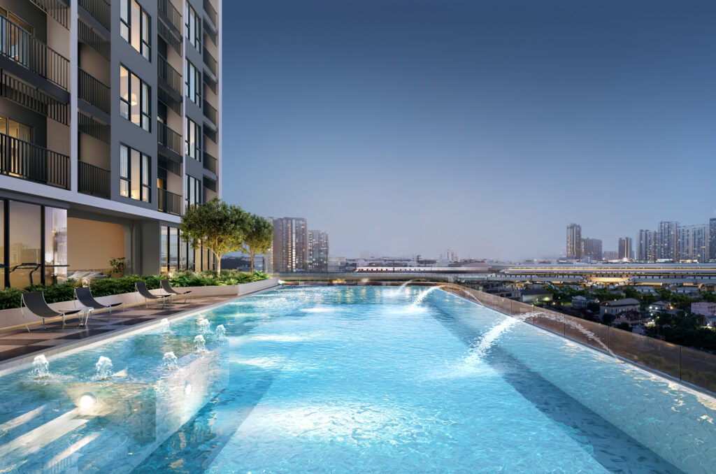 • ชั้นสระว่ายน้ำ สวนบริเวณชั้นสระว่ายน้ำได้รับการออกแบบในแนวคิด Modern Classic ที่ผสมผสานความหรูหราร่วมสมัยกับความสง่างามเหนือกาลเวลาอย่างลงตัว พื้นระเบียงสระตกแต่งด้วยลวดลายตาราง (CheckeredPattern) ซึ่งช่วยเสริมความรู้สึกเป็นระเบียบและให้บรรยากาศที่สะท้อนความคลาสสิกได้อย่างชัดเจน บริเวณพื้นสระว่ายน้ำมีการออกแบบเส้นขอบ (Border) ด้วยลวดลายแบบคลาสสิก เพิ่มมิติให้พื้นที่ดูประณีต พิถีพิถัน และยกระดับภาพลักษณ์ของโครงการให้หรูหราน่าประทับใจ พื้นที่นี้ยังครบครันด้วยฟังก์ชันการใช้งานที่หลากหลาย ทั้งสระว่ายน้ำผู้ใหญ่ สระเด็ก จากุชซี เตียงพักผ่อนริมสระ และที่นั่งชมวิวรอบสระว่ายน้ำ รองรับทั้งการพักผ่อนส่วนตัวและกิจกรรมกลางแจ้งอย่างมีระดับ