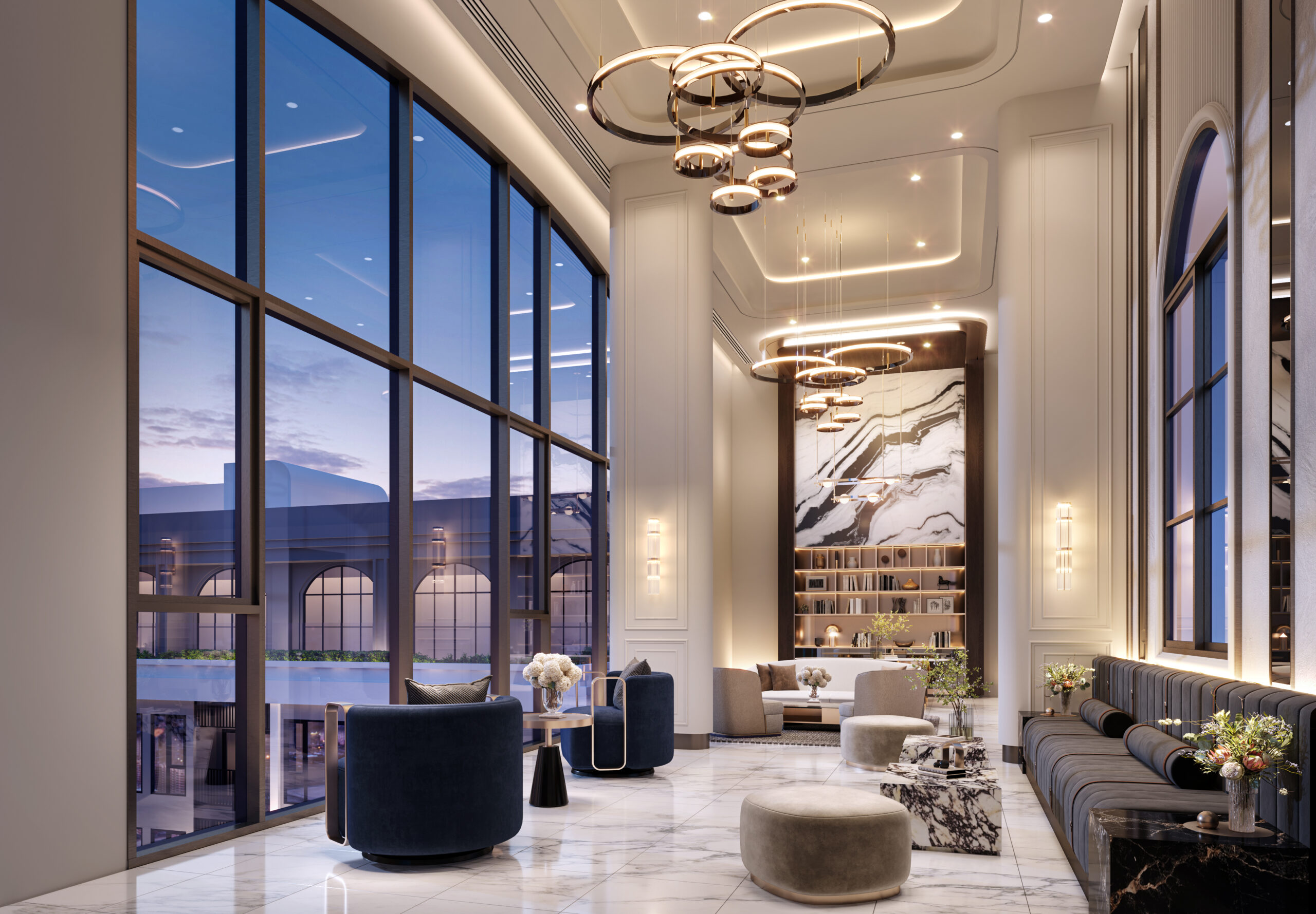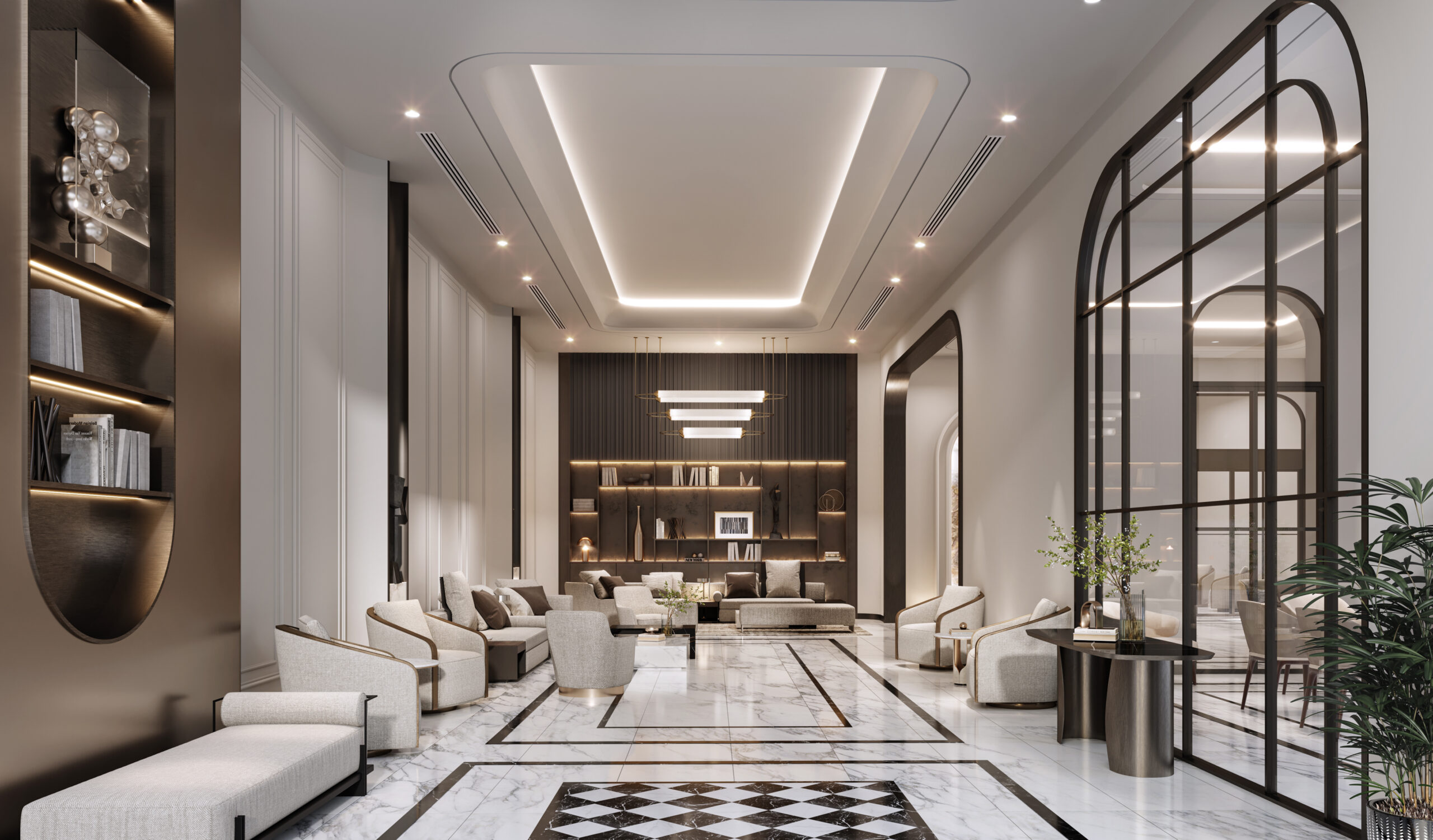 • Lobby สไตล์โมเดิร์นคลาสสิคผสมผสานความทันสมัยของสไตล์โมเดิร์นเข้ากับความหรูหราและสง่างามของสไตล์คลาสสิค โดยเน้นความเรียบง่ายแต่มีระดับ ที่มีความต่อเนื่องกัน จาก ซุ่มโค้งของอาคาร และลักษณะของคิ้วบัว ที่มีความต่อเนื่องกัน และมีการใช้ Pattern ที่ มีความ symmatry มาใช้ในงานออกแบบ