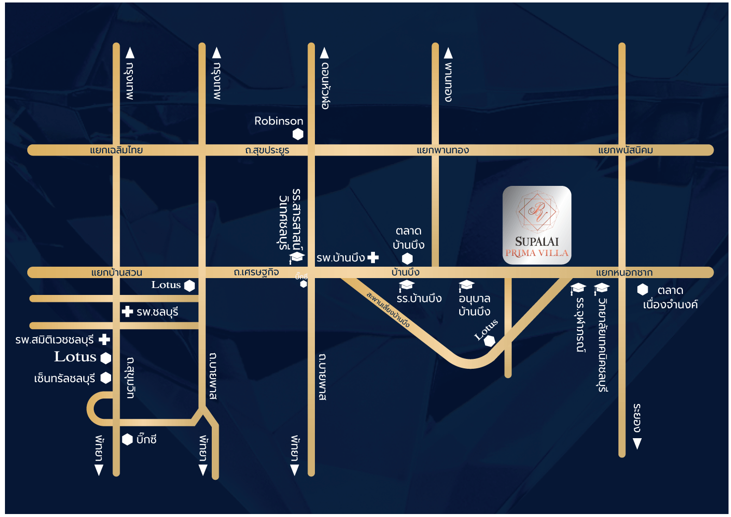 จุดเด่น ทำเลใจกลางบ้านบึงเชื่อมต่อทุกๆการเดินทาง ใช้ชีวิตอย่างเหนือระดับ