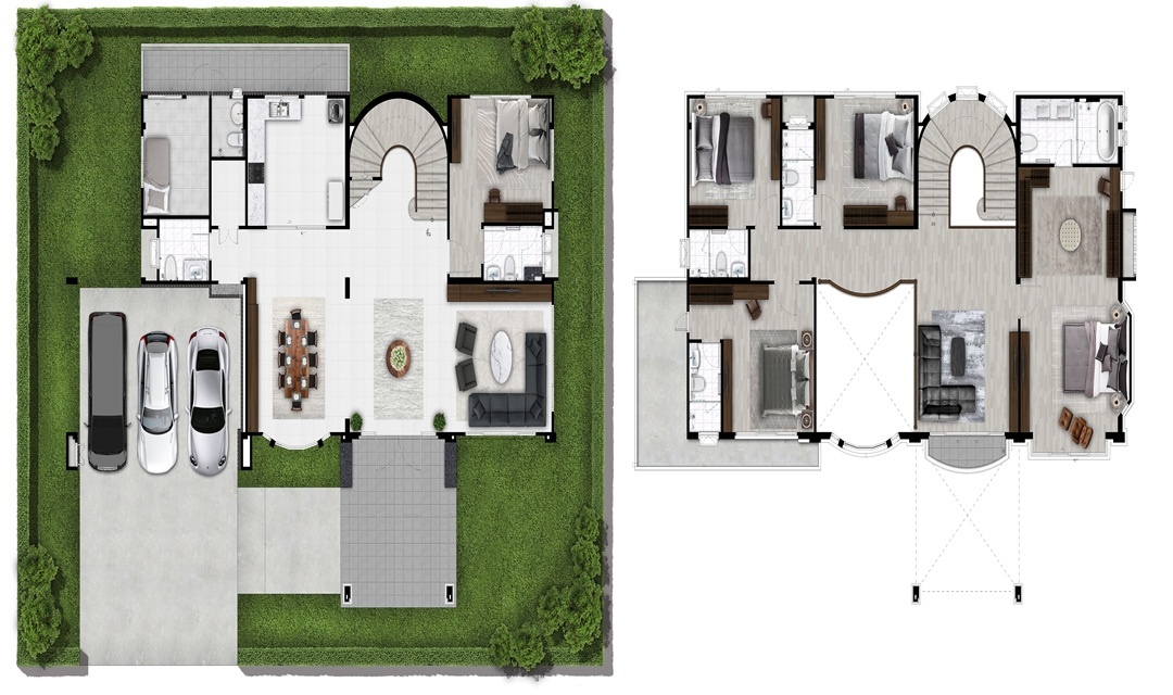 แบบบ้าน : ศุภราช บ้านเดี่ยวขนาดใหญ่ 2 ชั้น พื้นที่ใช้สอย 330 ตร.ม. 4 ห้องนอน 6 ห้องน้ำ ที่จอดรถ 3 คัน