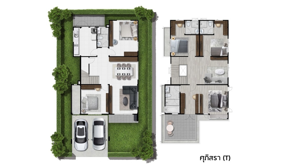 แบบบ้าน : ศุภมัณฑิรา บ้านเดี่ยว 2 ชั้น พื้นที่ใช้สอย 417 ตร.ม. 5 ห้องนอน 6 ห้องน้ำ ที่จอดรถ 3 คัน