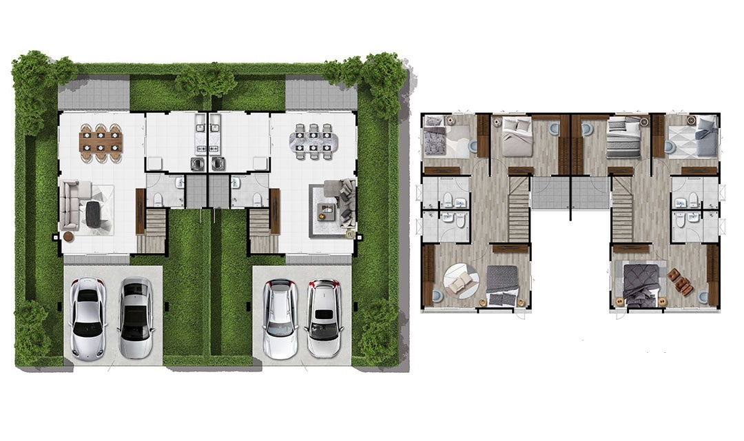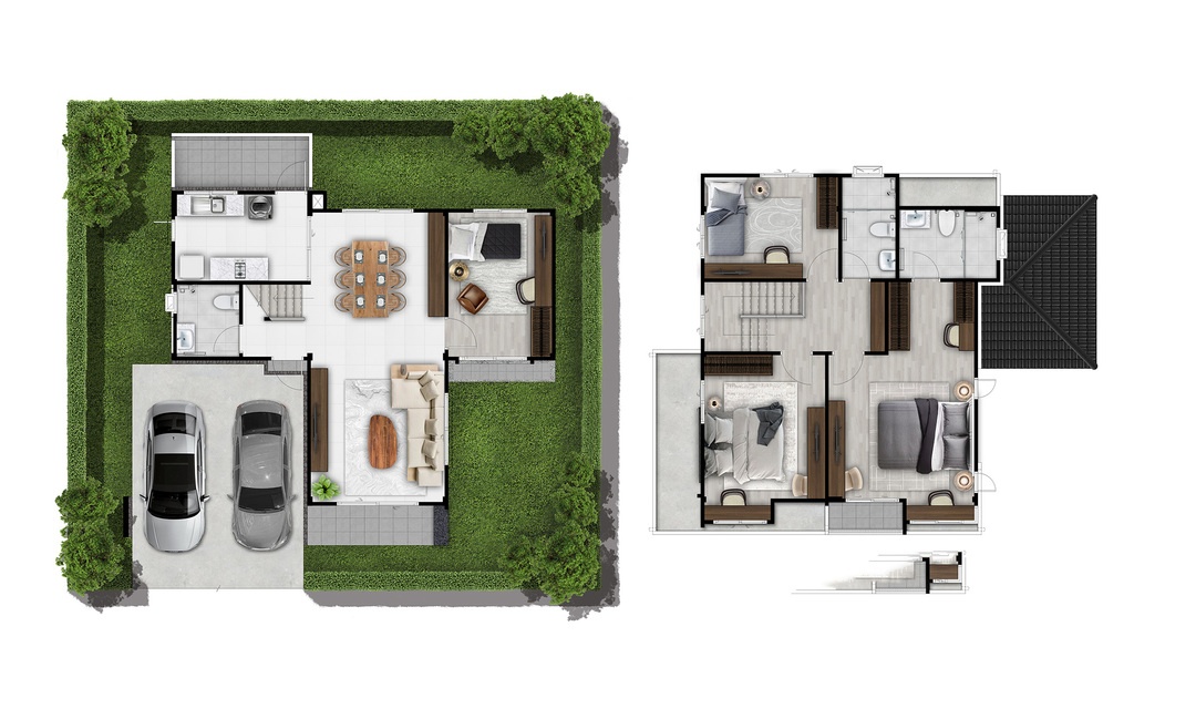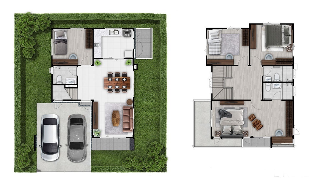 แบบบ้าน : ศุภรดา บ้านเดี่ยว 2 ชั้น พื้นที่ใช้สอย 162 ตร.ม. 4 ห้องนอน 3 มีห้องนอนขนาดเล็กด้านล่าง ที่จอดรถ 2 คัน