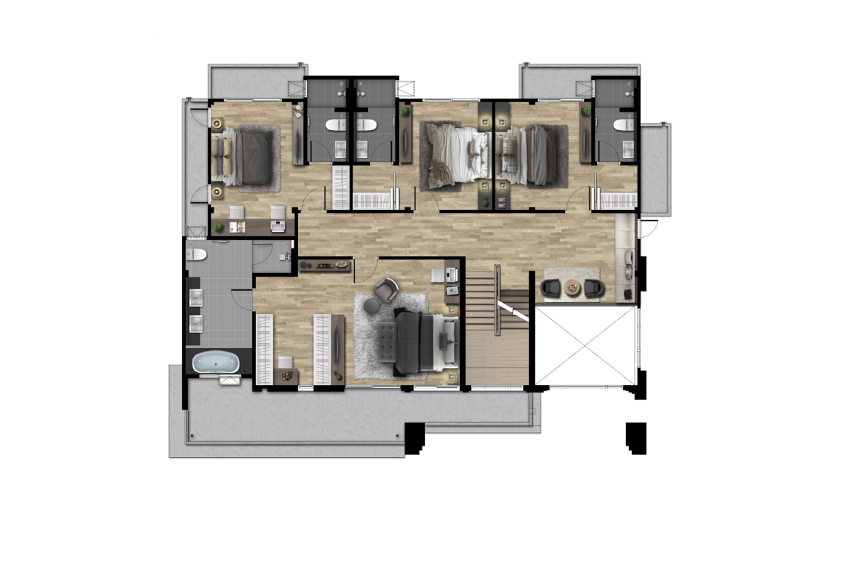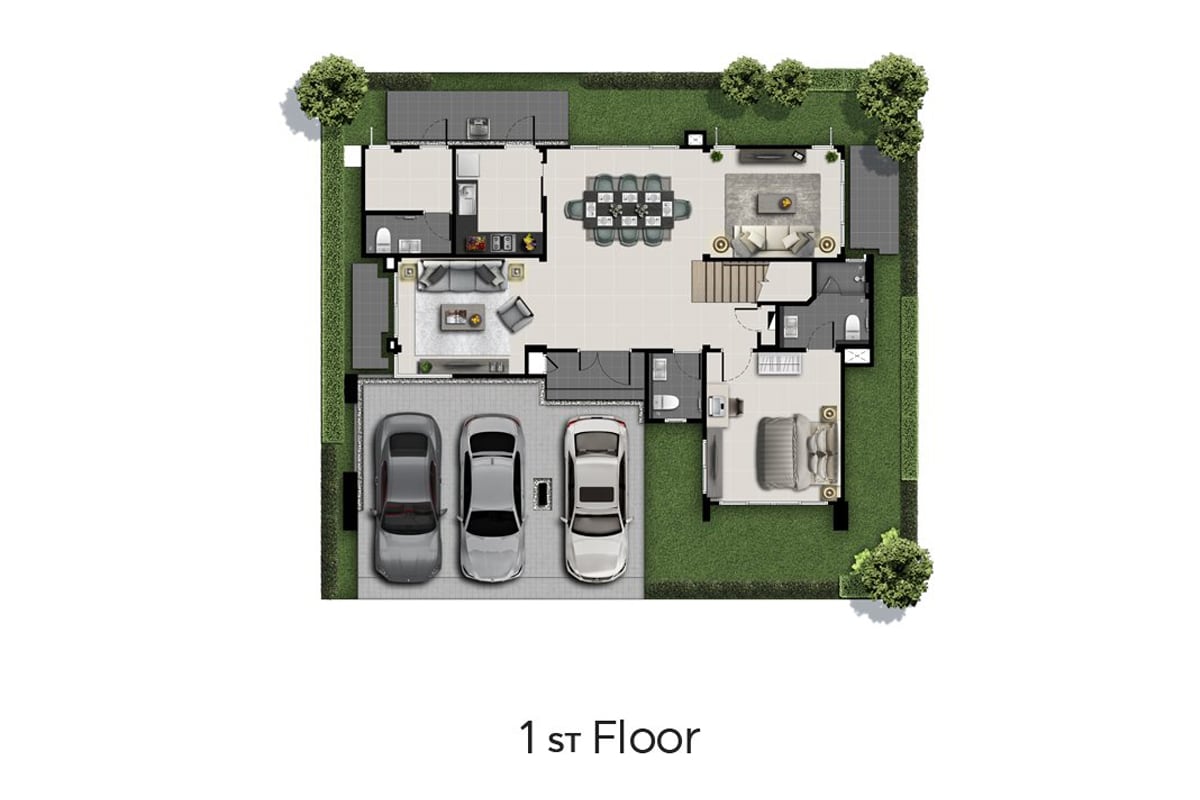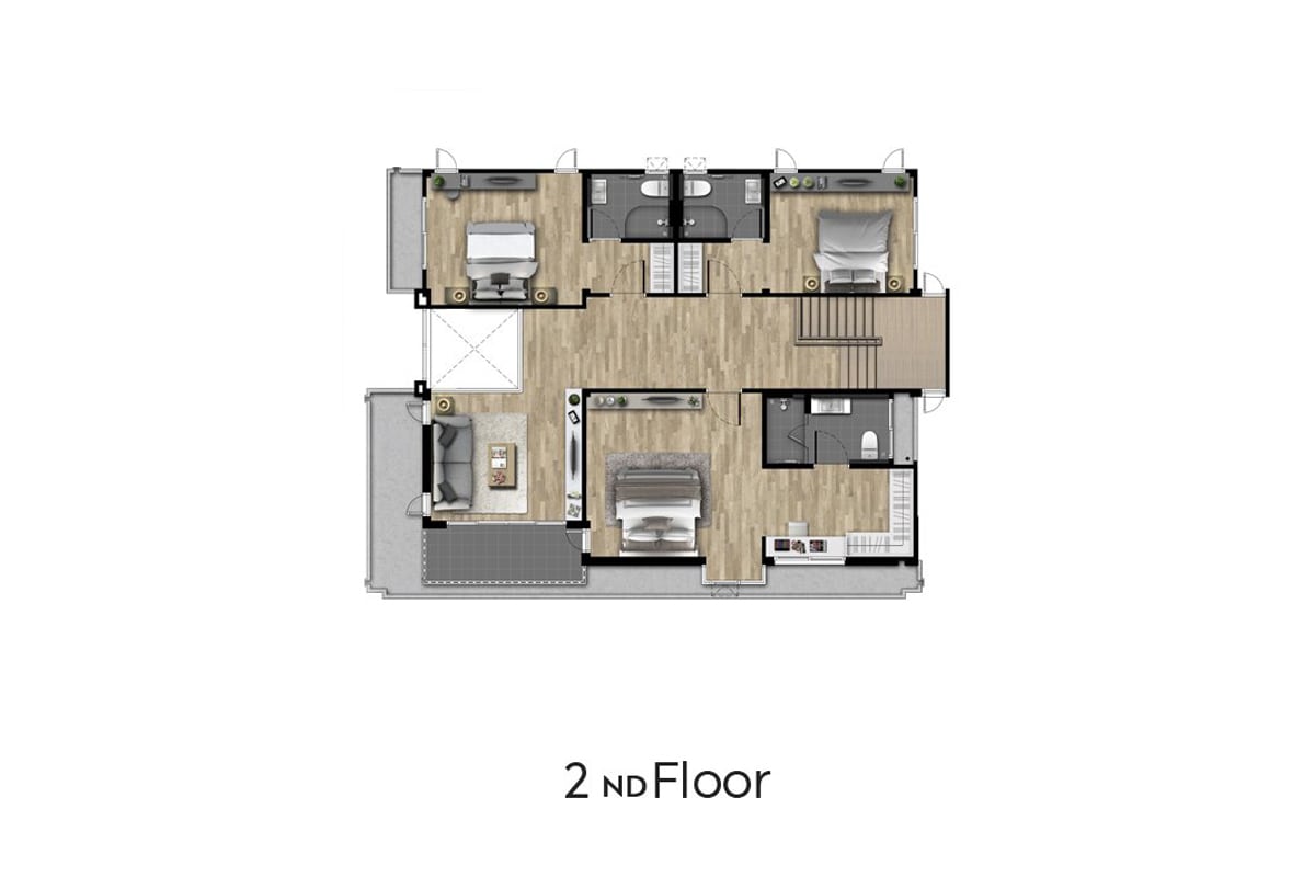 พื้นที่ใช้สอย 275 ตารางเมตร 4 ห้องนอน 5 ห้องน้ำ 1 ห้องรับแขก (Double Volume) 2 ห้องนั่งเล่น 1 ห้องรับประทานอาหาร 1 ห้องครัว 1 ห้องเก็บของ 1 ห้องนั่งเล่น+ห้องน้ำ ที่จอดรถ 3 คัน (ในร่ม)