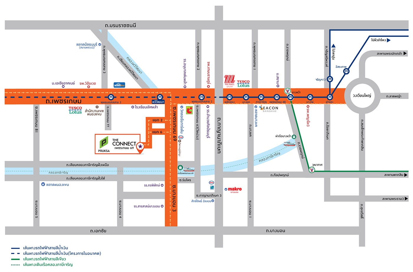 การเดินทางท่าเรือ เพชรเกษม 69 2 กม.รถไฟฟ้าสายสีนำเงิน MRTหลักสอง 5 กม.