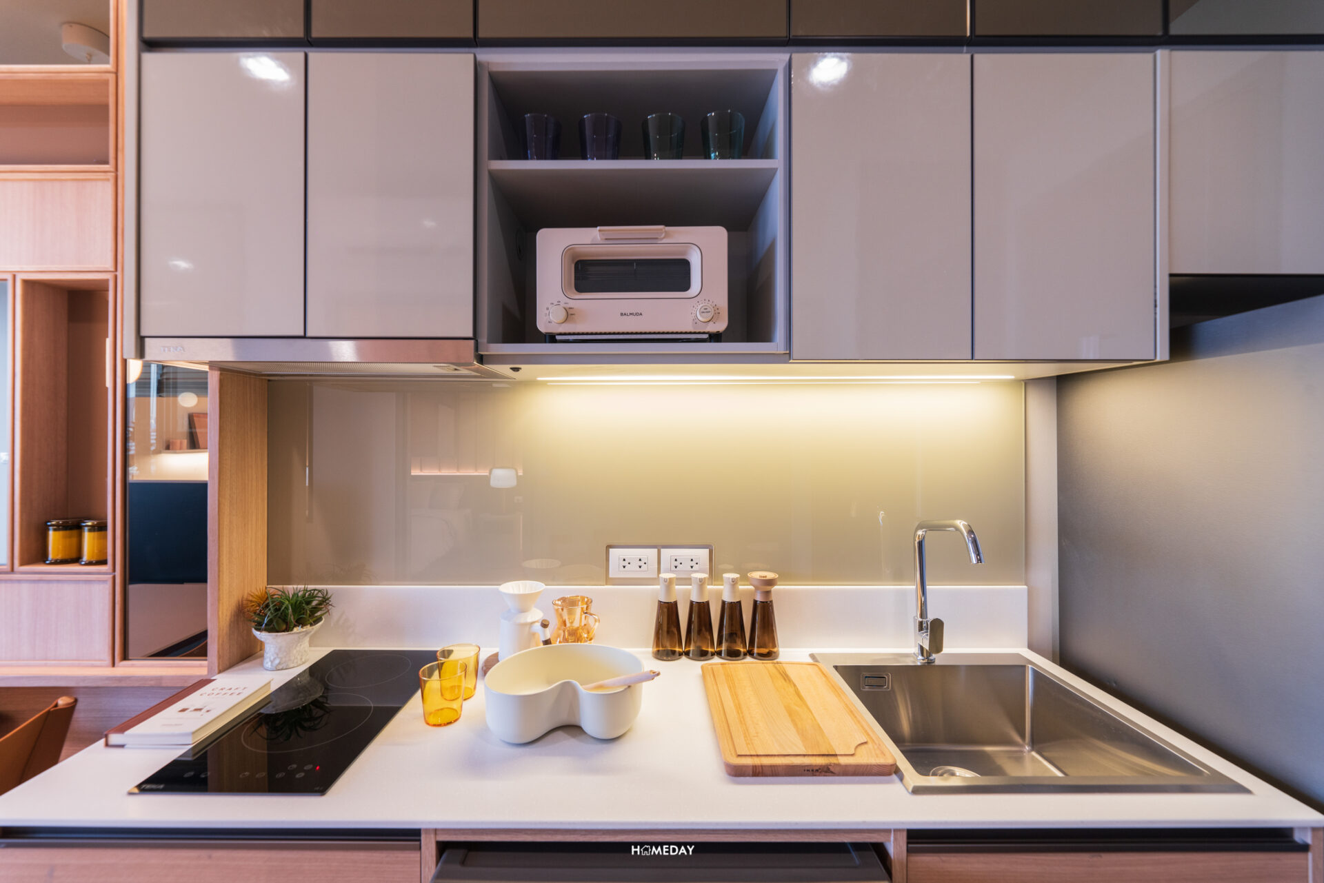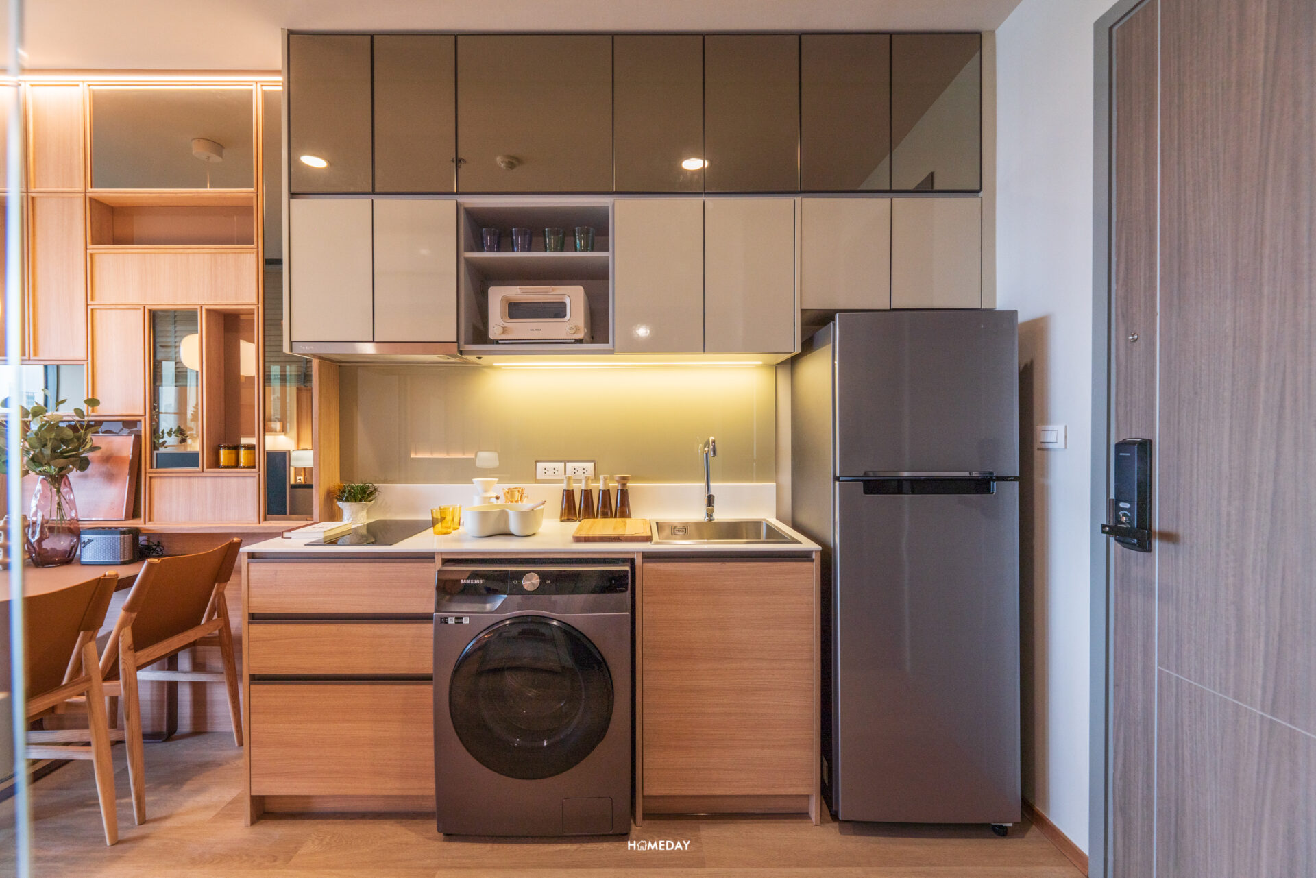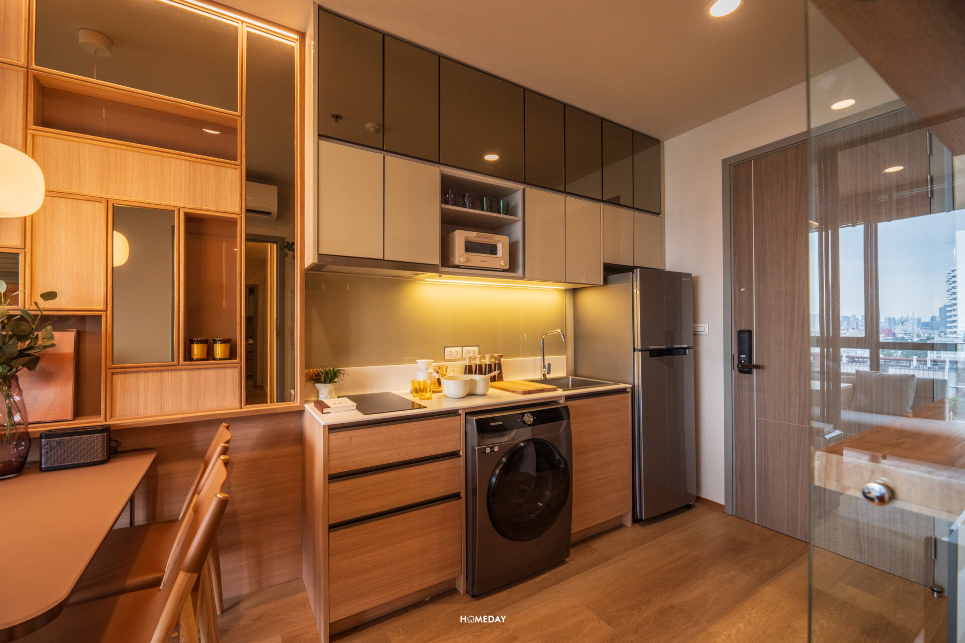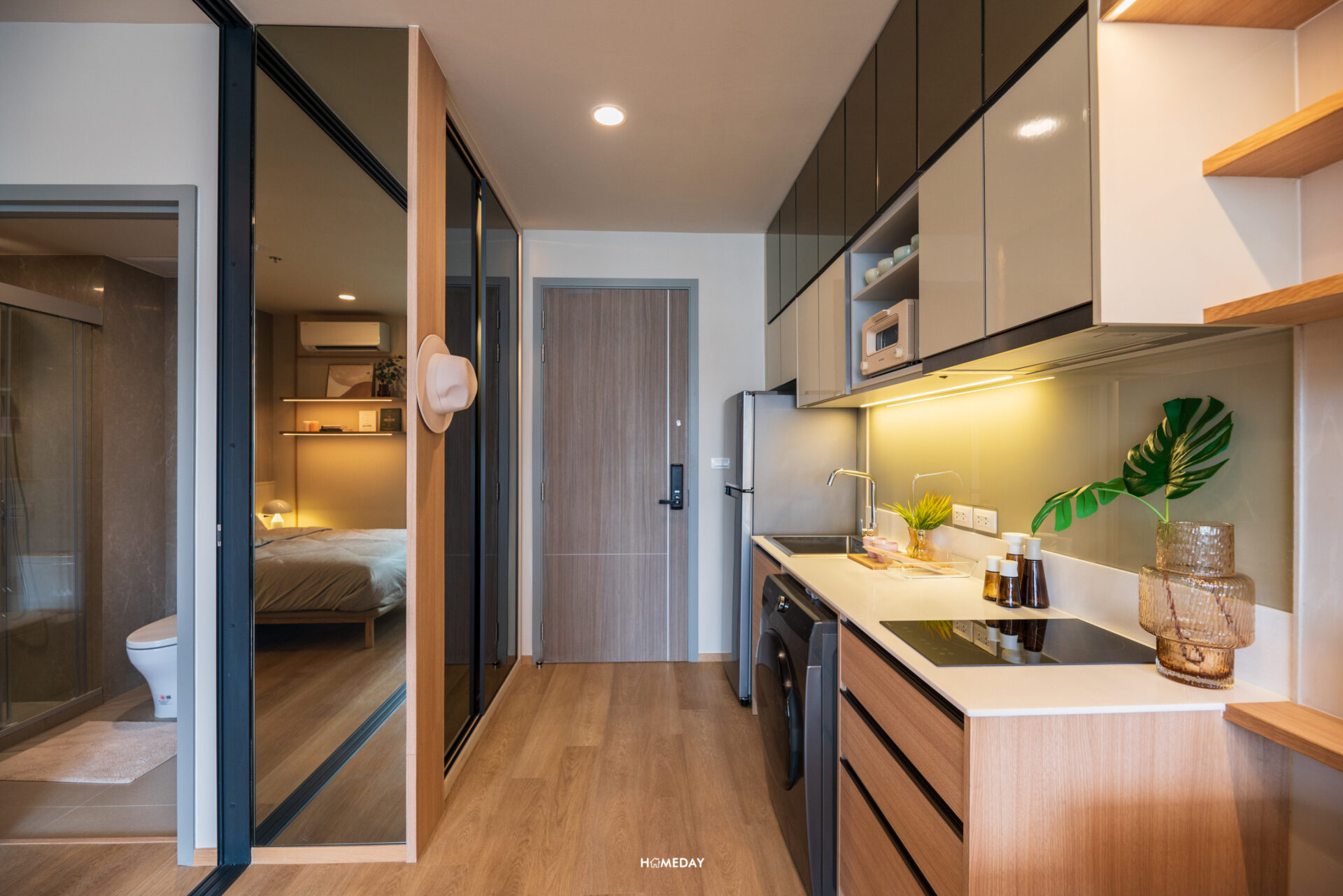 ตรงข้ามห้องน้ำหรือฝั่งขวามือติดประตูทางเข้า พื้นที่บริเวณนี้จะเป็นส่วนครัวเปิด ที่ทางโครงการให้ชุดเคาน์เตอร์ครัวพร้อมบานตู้เก็บของต่าง ๆ มาตามแบบในห้องตัวอย่างนี้เลยครับ ออกแบบให้มีทั้งช่องสำหรับใส่ตู้เย็น เครื่องซักผ้า และไมโครเวฟ รวมไปถึงได้ซิงก์ล้างจานและ Hob & Hood ด้วยครับ ผนังยังคงออกแบบใส่ Backsplash มาให้เหมือนเคย รองรับการใช้งานปลั๊กไฟเอาไว้ให้พร้อม ตรงกลางเหลือพื้นที่สำหรับเตรียมอาหารได้กำลังพอดี