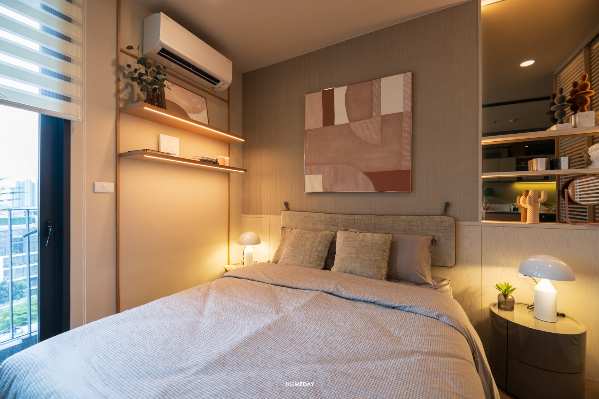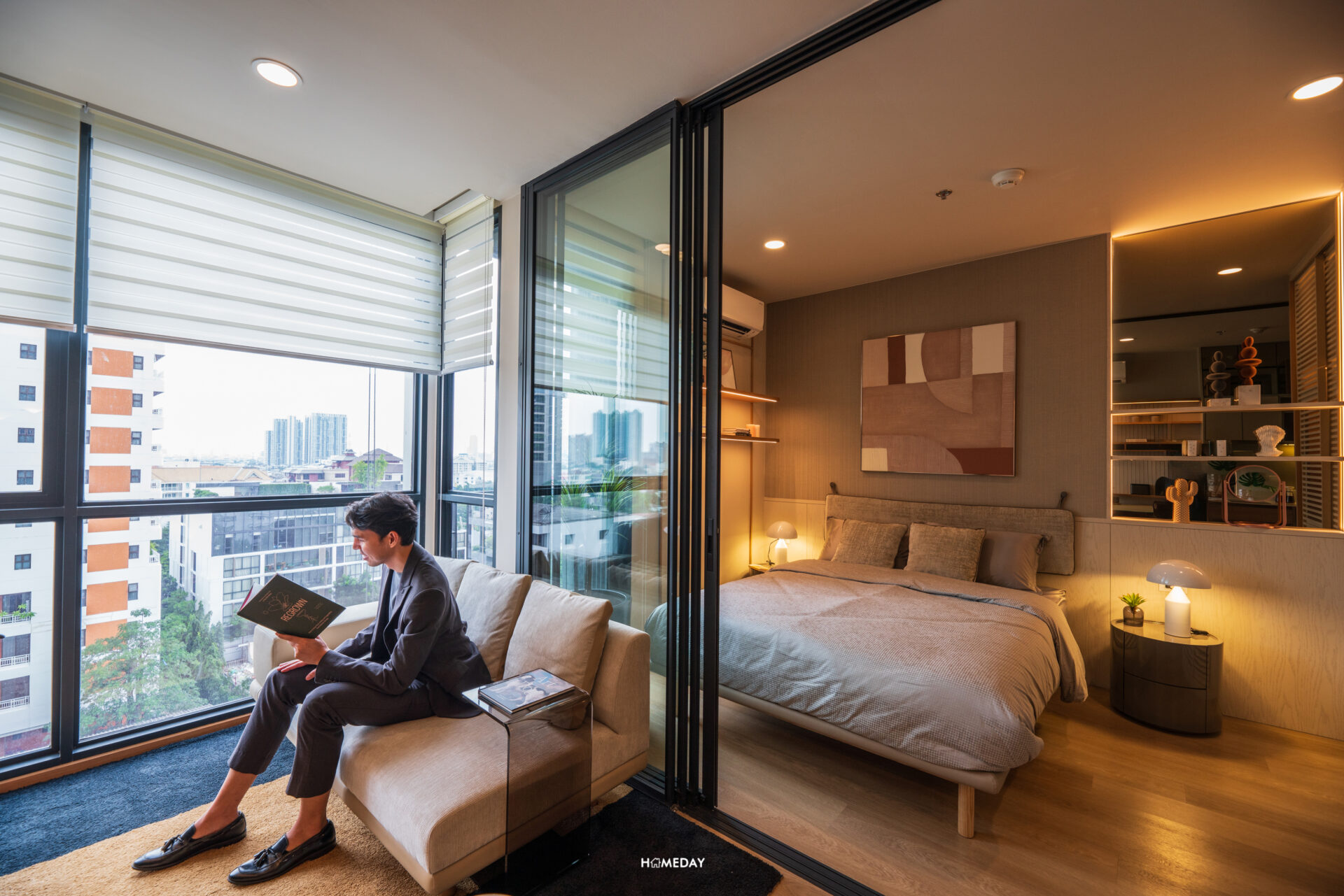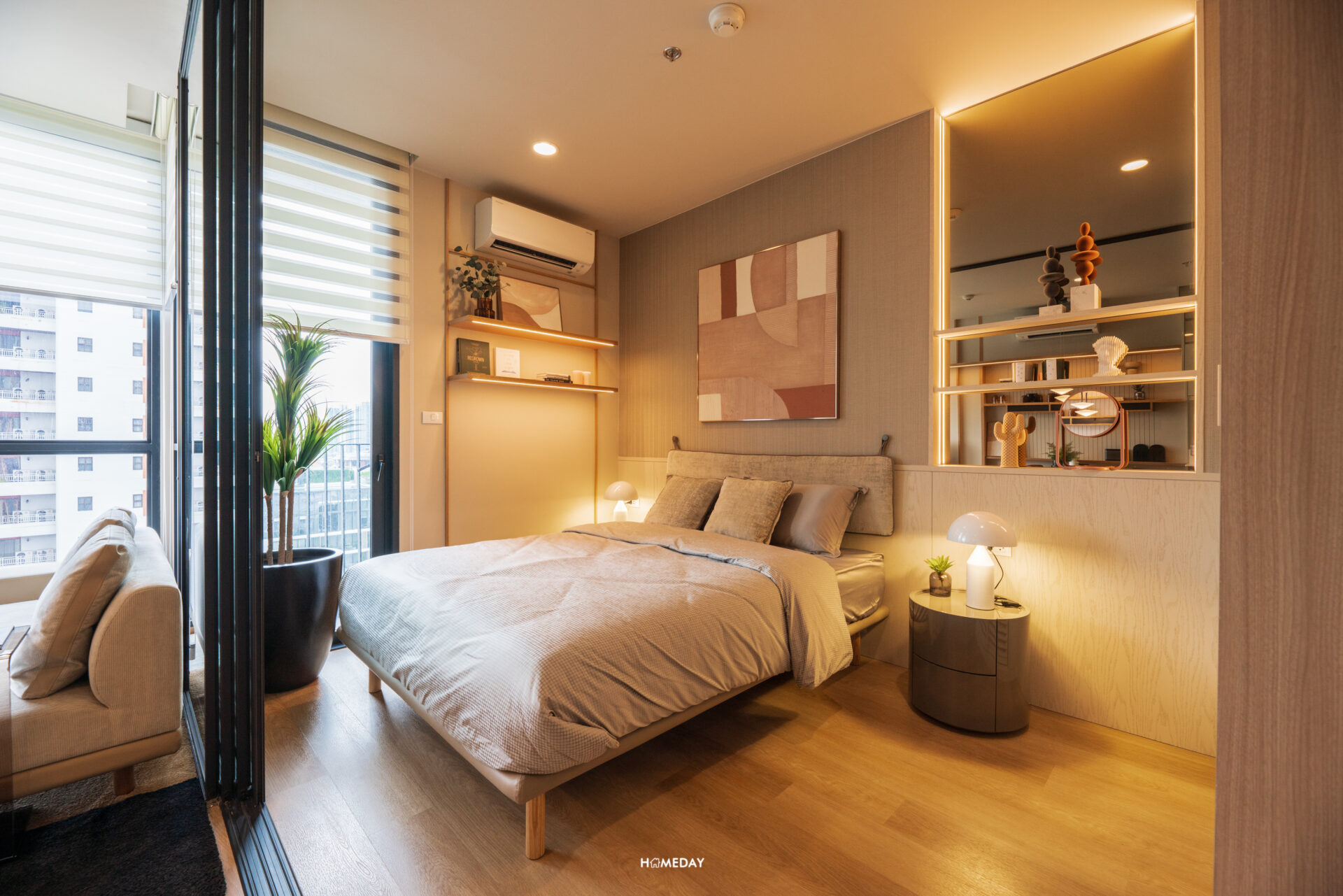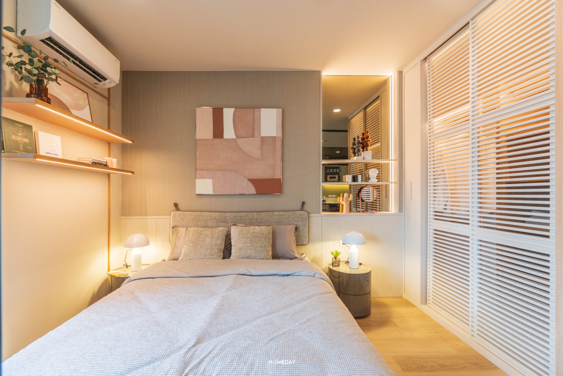 จุดเด่นของห้องนอนสำหรับแบบห้องนี้ คือประตูกระจกบานสไลด์นี่แหละครับ สำหรับคนที่ชอบความโปร่ง ไม่อยากได้ห้องที่ดูทึบ แต่ก็ยังอยากให้มีความเป็นสัดส่วนอยู่ ห้องนี้ตอบโจทย์ได้ดีเลยครับ ในเวลากลางวันที่เราไม่ได้ต้องการการพักผ่อน การเปิดห้องเอาไว้แบบนี้ ก็ช่วยทำให้แสงธรรมชาติจากหน้าต่างฝั่งห้องนั่งเล่น ส่องสว่าง ให้ความสดใสแก่ห้องนอนของเราได้ สามารถเดินเชื่อมต่อพื้นที่ทั้งห้องได้อย่างคล่องตัว มองเห็นพื้นที่ได้ทุกส่วนเลยครับ
