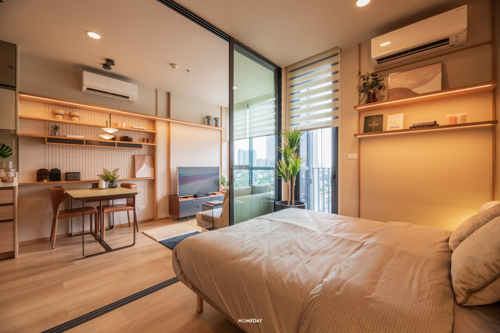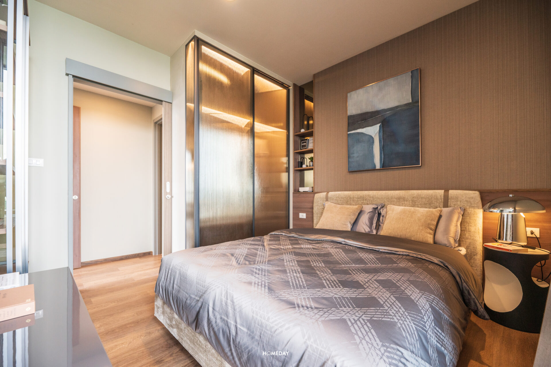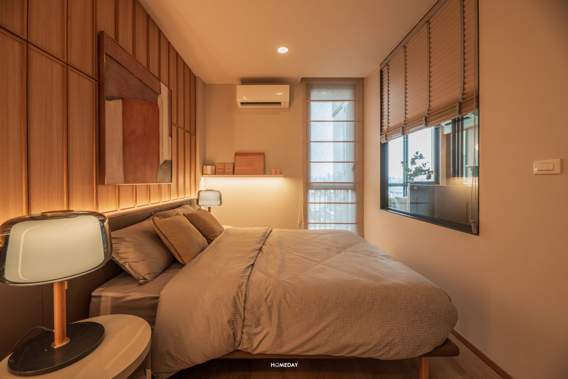 จุดเด่นของห้องนอนสำหรับแบบห้องนี้ คือประตูกระจกบานสไลด์นี่แหละครับ สำหรับคนที่ชอบความโปร่ง ไม่อยากได้ห้องที่ดูทึบ แต่ก็ยังอยากให้มีความเป็นสัดส่วนอยู่ ห้องนี้ตอบโจทย์ได้ดีเลยครับ ในเวลากลางวันที่เราไม่ได้ต้องการการพักผ่อน การเปิดห้องเอาไว้แบบนี้ ก็ช่วยทำให้แสงธรรมชาติจากหน้าต่างฝั่งห้องนั่งเล่น ส่องสว่าง ให้ความสดใสแก่ห้องนอนของเราได้ สามารถเดินเชื่อมต่อพื้นที่ทั้งห้องได้อย่างคล่องตัว มองเห็นพื้นที่ได้ทุกส่วนเลยครับ