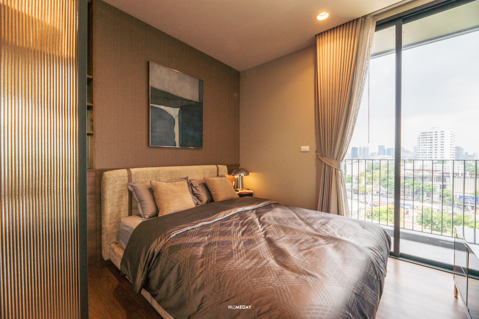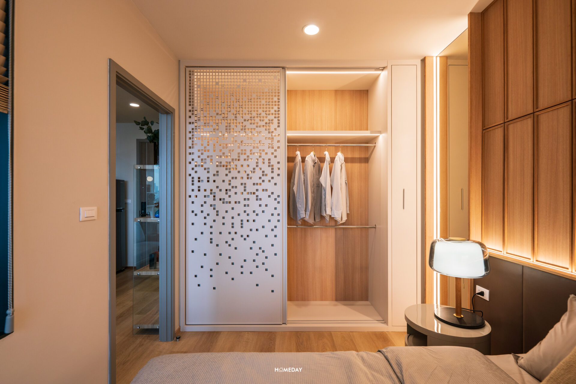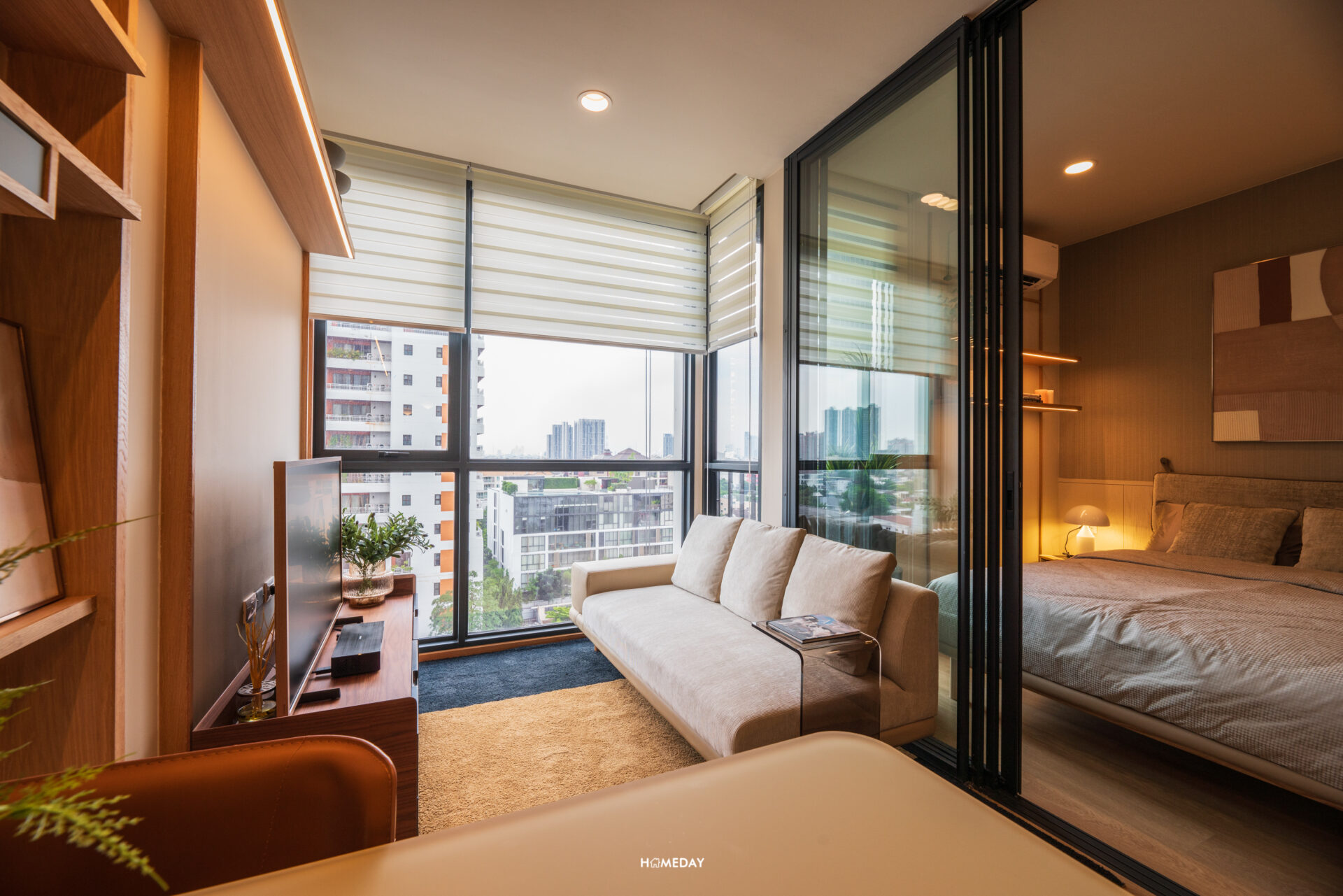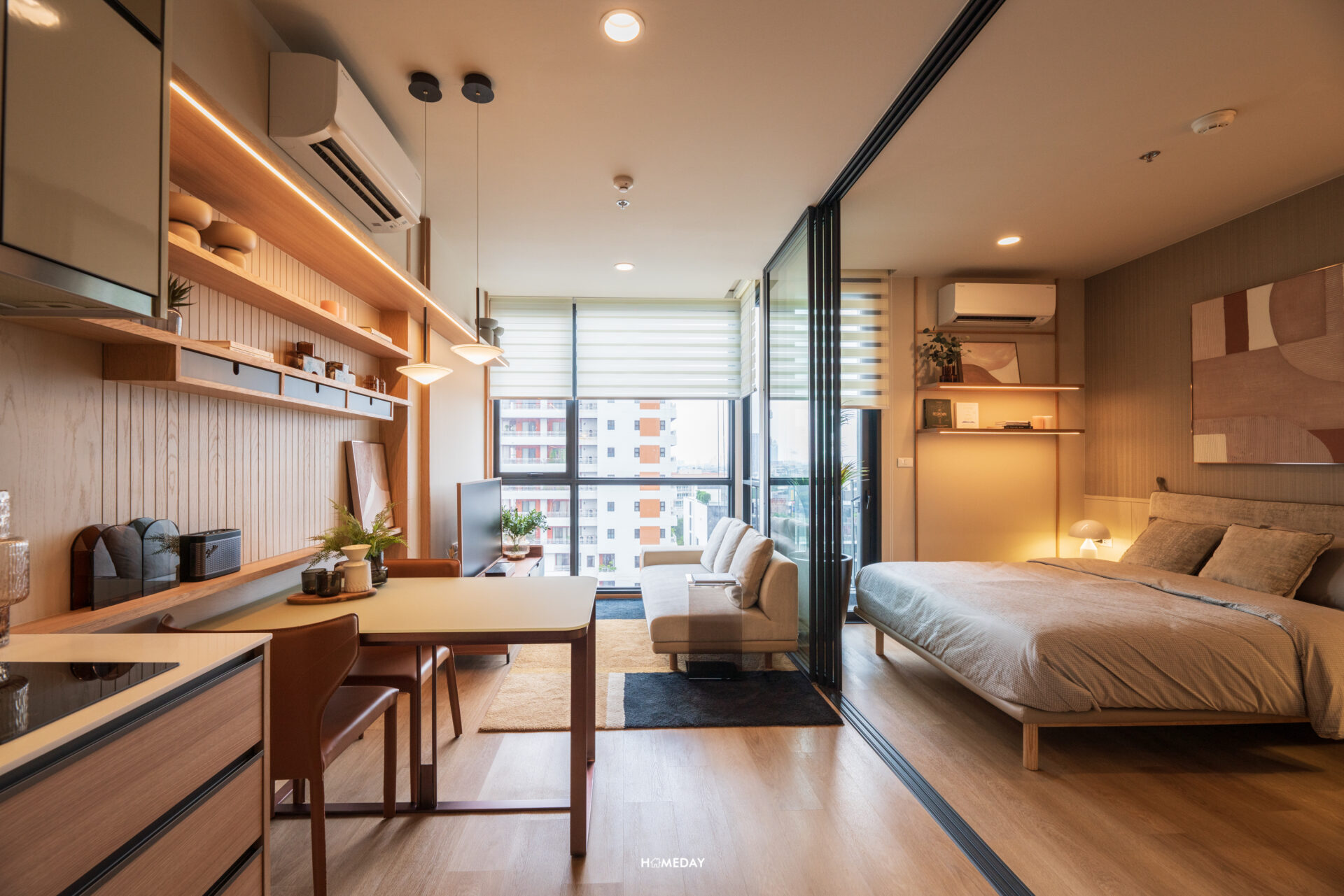จุดเด่นของห้องนอนสำหรับแบบห้องนี้ คือประตูกระจกบานสไลด์นี่แหละครับ สำหรับคนที่ชอบความโปร่ง ไม่อยากได้ห้องที่ดูทึบ แต่ก็ยังอยากให้มีความเป็นสัดส่วนอยู่ ห้องนี้ตอบโจทย์ได้ดีเลยครับ ในเวลากลางวันที่เราไม่ได้ต้องการการพักผ่อน การเปิดห้องเอาไว้แบบนี้ ก็ช่วยทำให้แสงธรรมชาติจากหน้าต่างฝั่งห้องนั่งเล่น ส่องสว่าง ให้ความสดใสแก่ห้องนอนของเราได้ สามารถเดินเชื่อมต่อพื้นที่ทั้งห้องได้อย่างคล่องตัว มองเห็นพื้นที่ได้ทุกส่วนเลยครับ