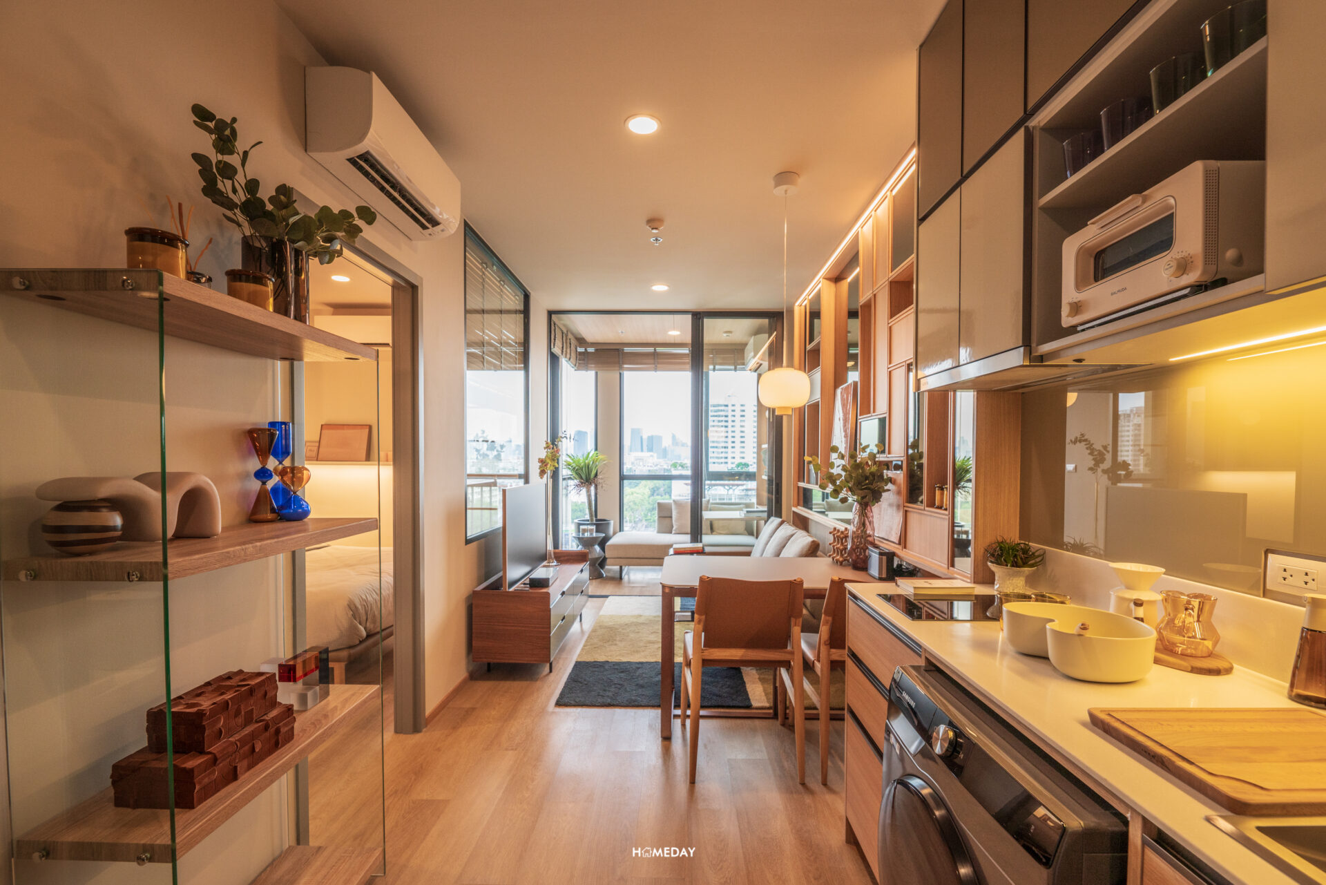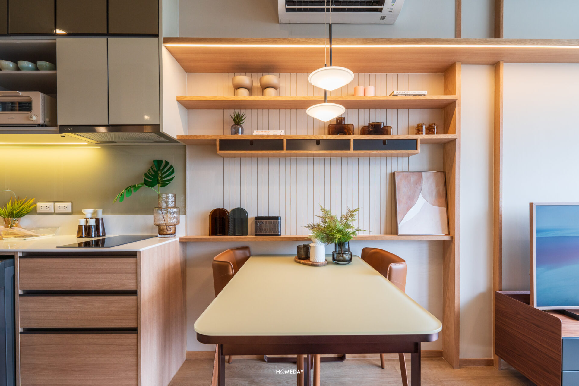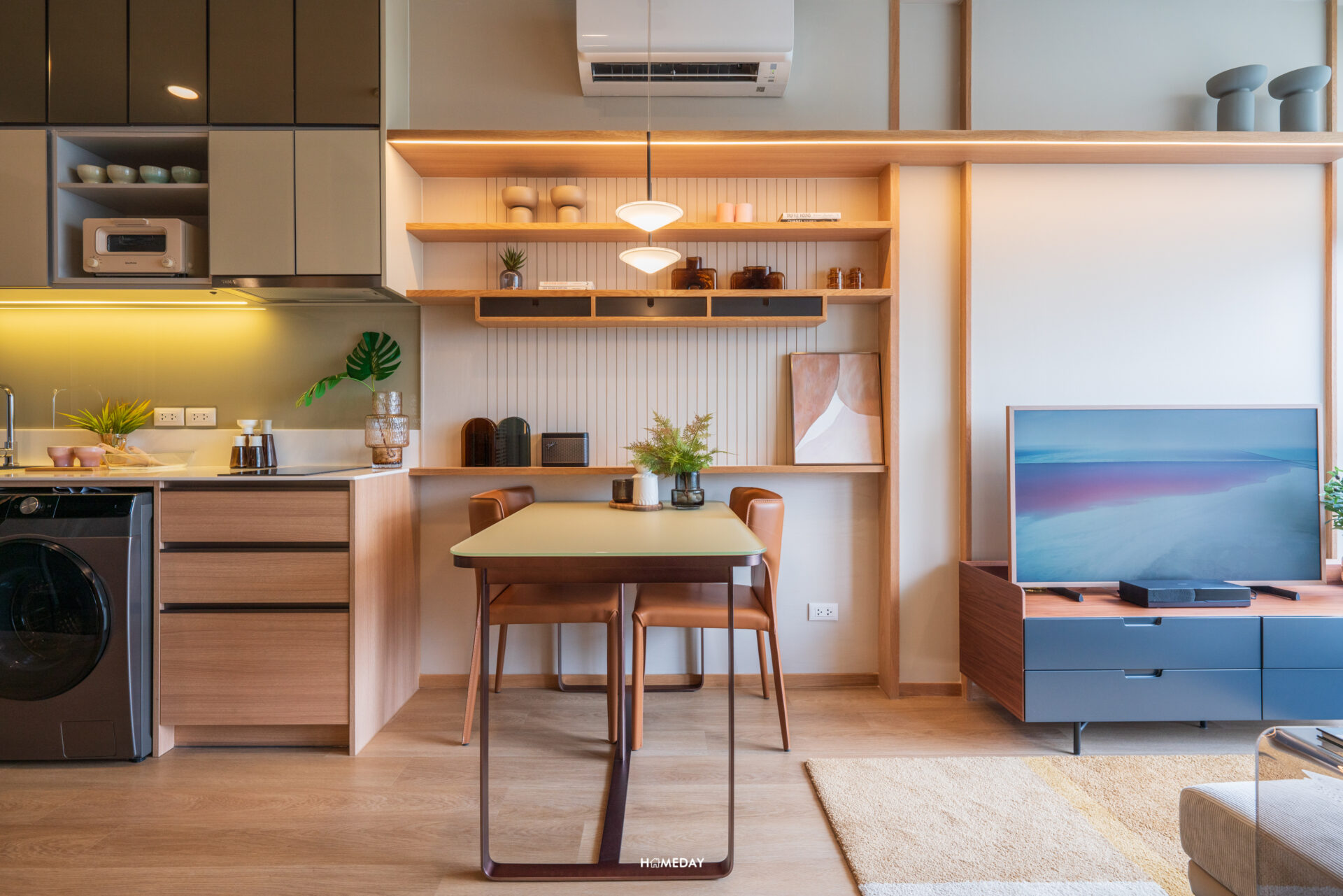 ตรงข้ามกันแน่นอนว่าเป็นพื้นที่ครัวเปิด ทุกอย่างได้ฟังก์ชันการใช้งานมาเหมือนกันกับ 1-Bedroom Plus ครับ พื้นที่ติดกันออกแบบรองรับไว้สำหรับการวางโต๊ะรับประทานอาหารเหมือนเช่นเคย ห้องตัวอย่างเลือกวางเป็นชุดสำหรับ 2 ที่นั่ง ฝั่งผนังบิลต์อินชั้นวางของไว้เพิ่มพื้นที่การจัดเก็บ ห้องจริงเราอาจจะติดตั้งเป็นโต๊ะแบบพับเก็บเข้าผนังได้ ก็จะช่วยเพิ่มพื้นที่การใช้งานห้องให้โปร่งและกว้างขึ้นได้มากไปอีกครับ