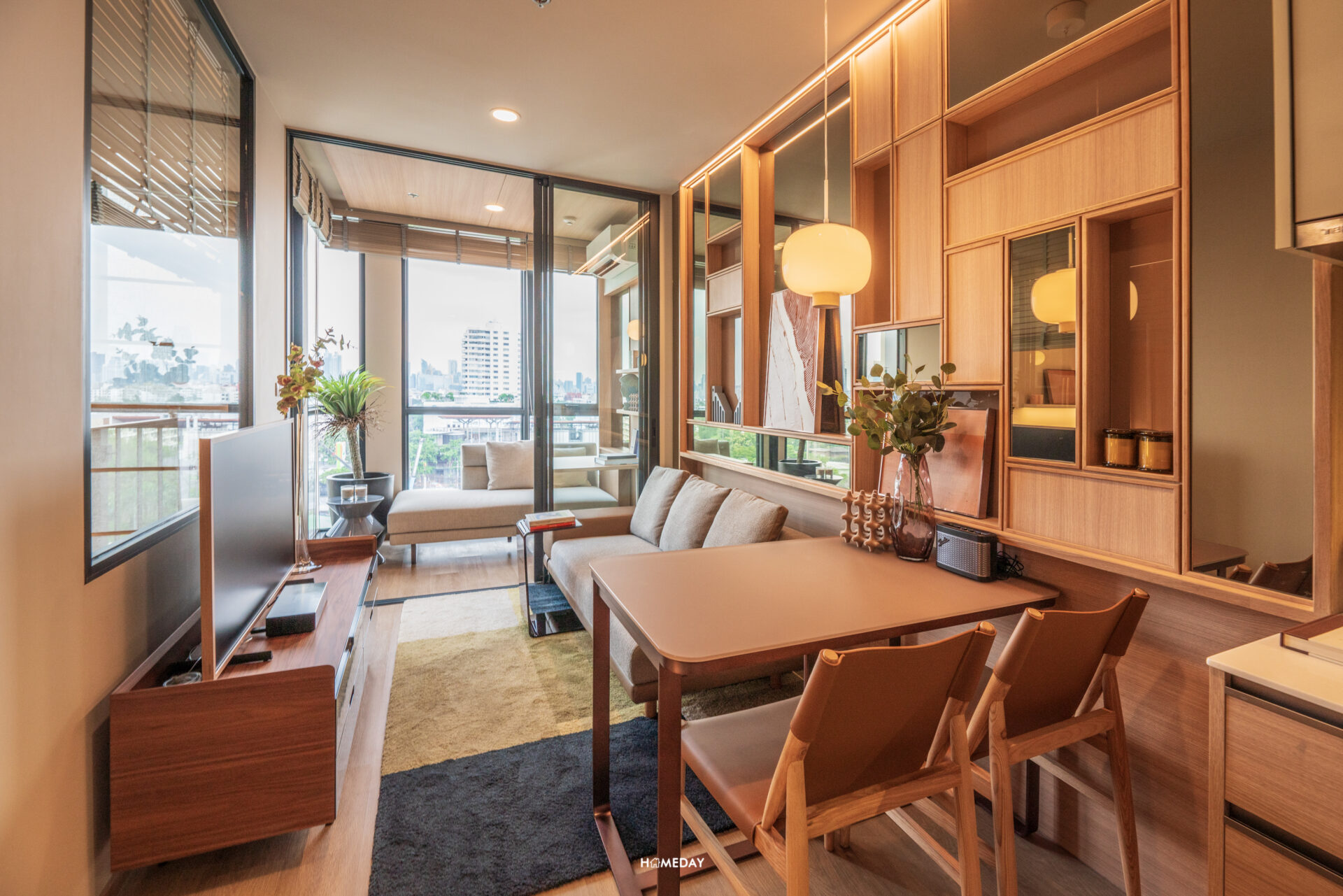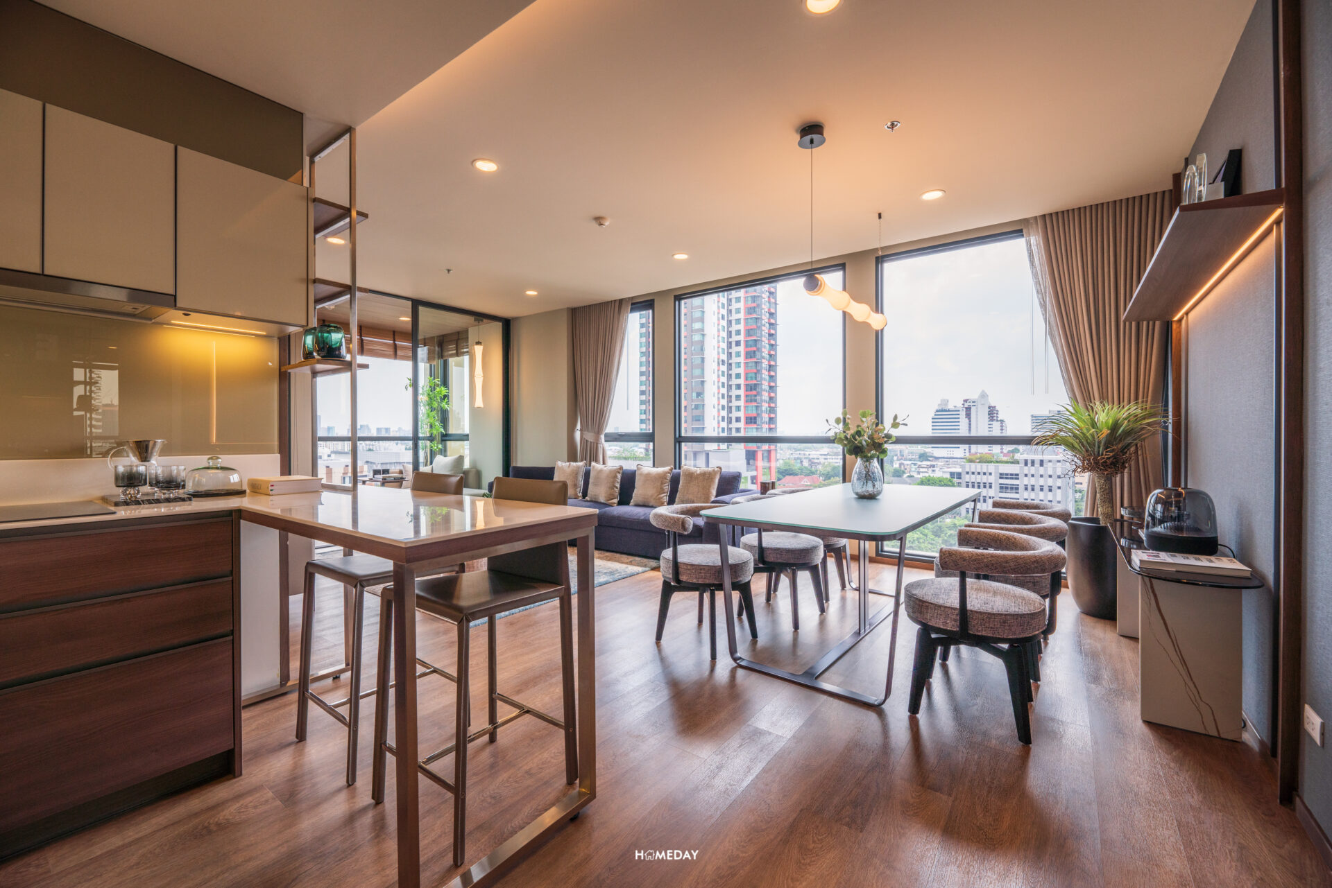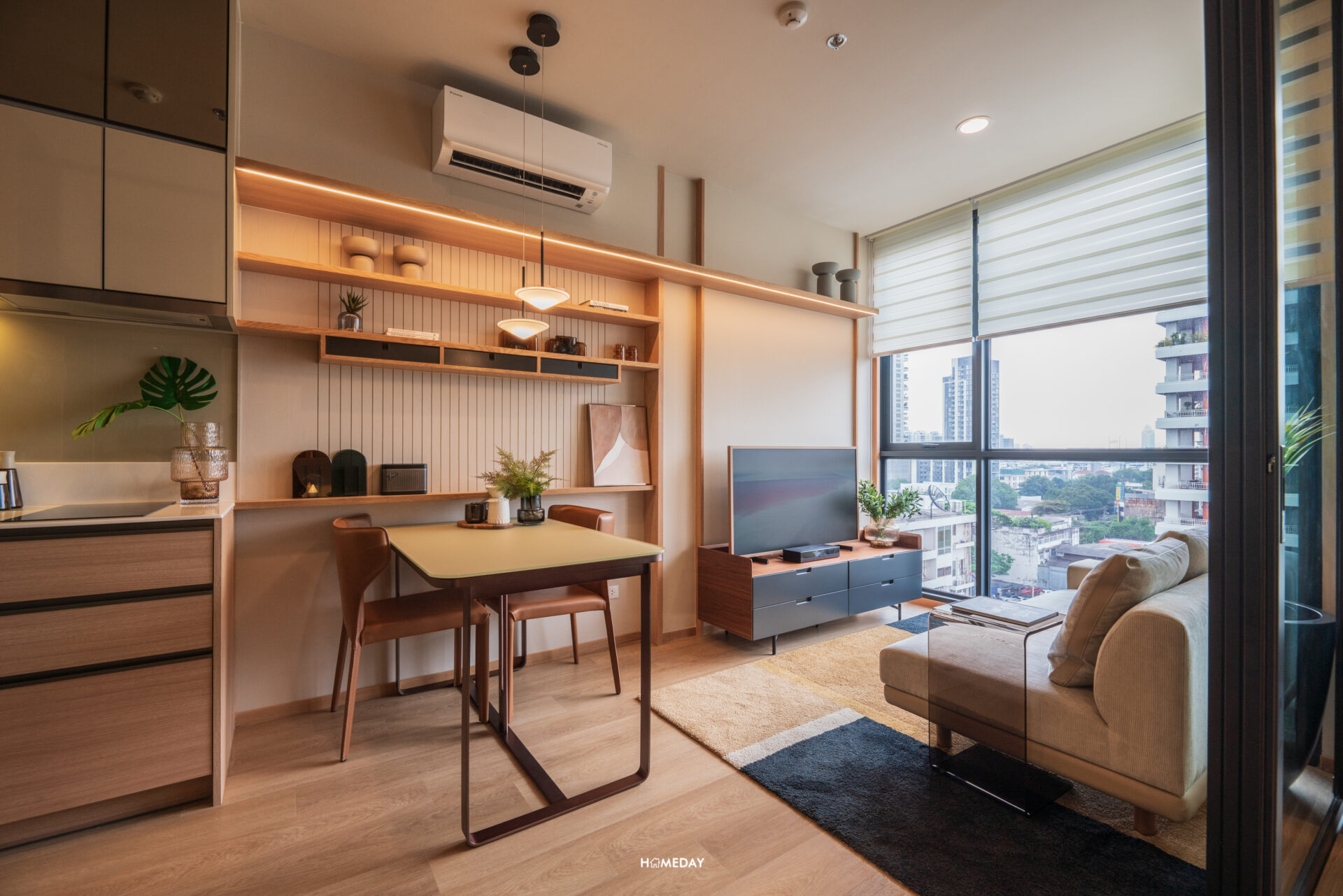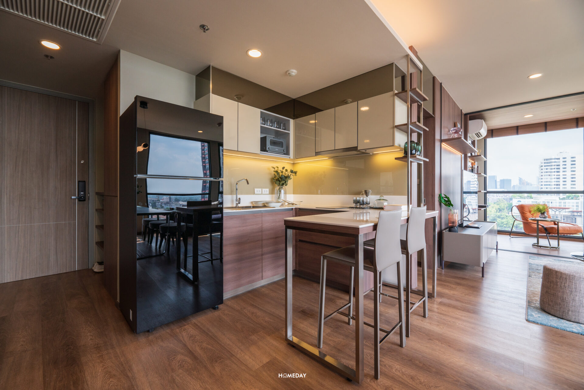 ตรงข้ามกันแน่นอนว่าเป็นพื้นที่ครัวเปิด ทุกอย่างได้ฟังก์ชันการใช้งานมาเหมือนกันกับ 1-Bedroom Plus ครับ พื้นที่ติดกันออกแบบรองรับไว้สำหรับการวางโต๊ะรับประทานอาหารเหมือนเช่นเคย ห้องตัวอย่างเลือกวางเป็นชุดสำหรับ 2 ที่นั่ง ฝั่งผนังบิลต์อินชั้นวางของไว้เพิ่มพื้นที่การจัดเก็บ ห้องจริงเราอาจจะติดตั้งเป็นโต๊ะแบบพับเก็บเข้าผนังได้ ก็จะช่วยเพิ่มพื้นที่การใช้งานห้องให้โปร่งและกว้างขึ้นได้มากไปอีกครับ