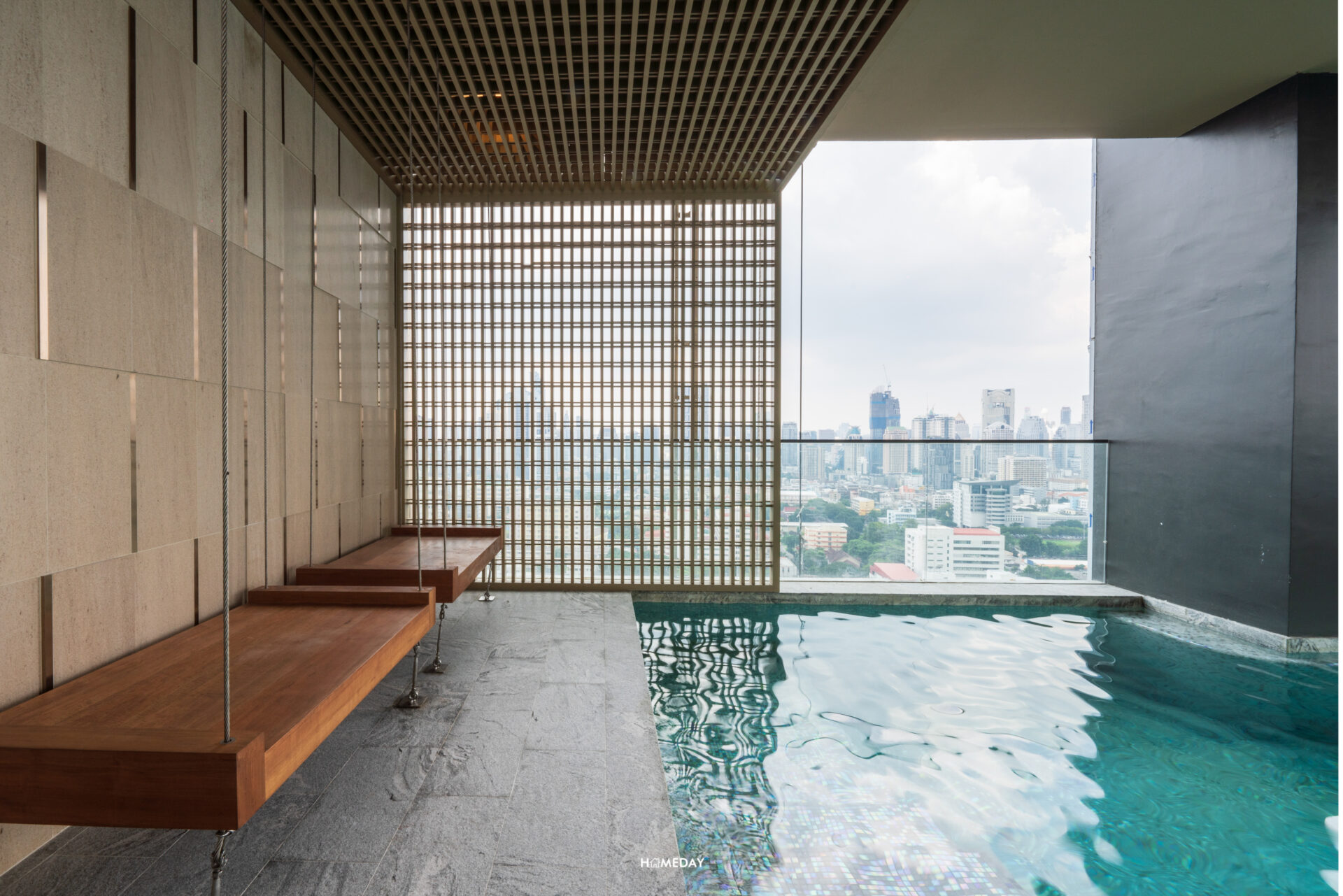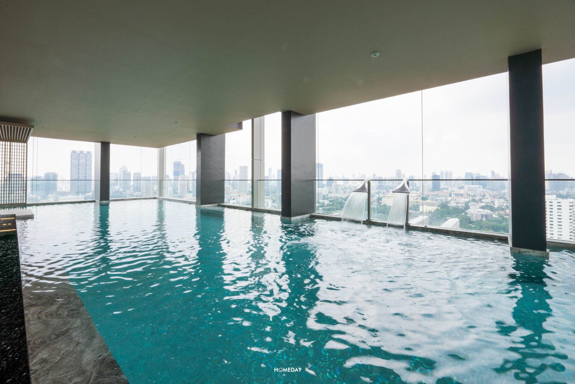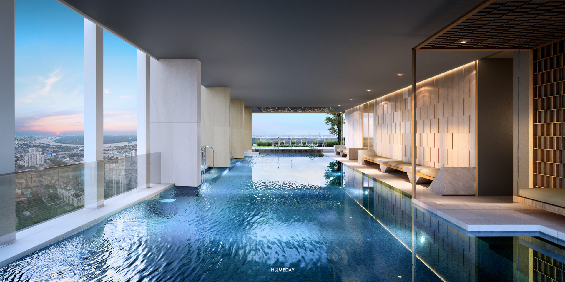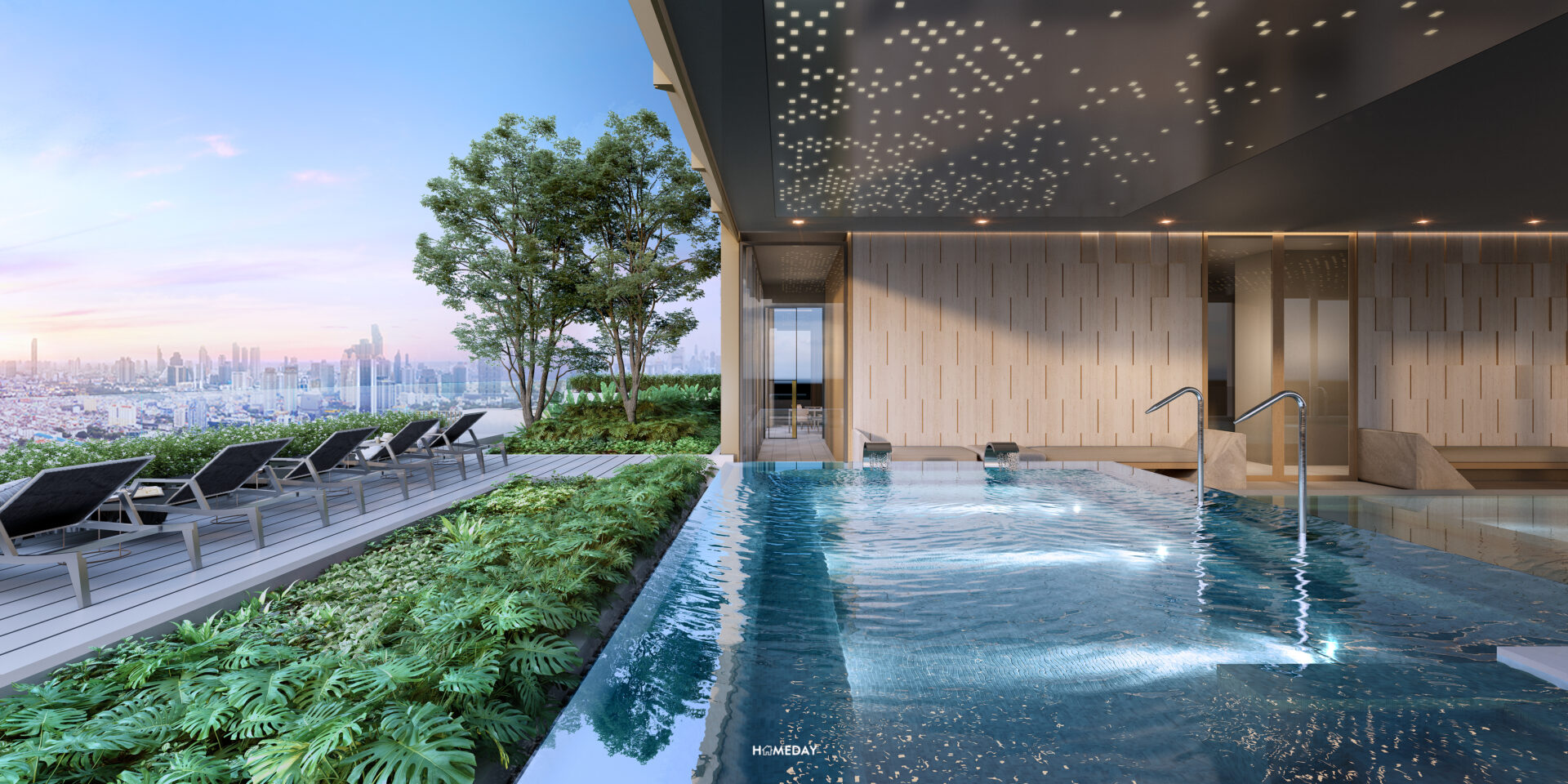 THE WATER ประกอบด้วยสระว่ายน้ำ 2 ส่วน โดยส่วนแรกเป็นสระว่ายน้ำยาว 22 เมตร ช่วยให้คุณได้ดื่มต่ำไปกับวิวแบบพาโนราม่า และยังมี Water jets, Water beds และมีโซนสำหรับเด็กอีกด้วย ส่วนสระที่ 2 เป็นสระน้ำร้อน Hydro Therapy ซึ่งออกแบบเป็นพิเศษ ให้มีน้ำพุและท่อน้ำแรงดันสูง เพื่อช่วยให้คุณได้ผ่อนคลายหลังจากวันที่วุ่นวายในเมือง สวนบนท้องฟ้าตั้งอยู่บริเวณทางทิศใต้ของโครงการ เป็นจุดเชื่อมโยงระหว่างพื้นที่ในส่วนของ The Space และ The Water ตกแต่งด้วยม้านั่งเก๋ ๆ เก้าอี้อาบแดดเท่ ๆ และภูมิทัศน์ ของแม่น้ำเจ้าพระยาและวิวของบางกะเจ้า ทั้งหมดคือบรรยากาศที่จะส่งมอบเพื่อช่วยให้คุณได้ผ่อนคลายกับทุกอิริยาบถที่อยู่ ณ ที่แห่งนี้
