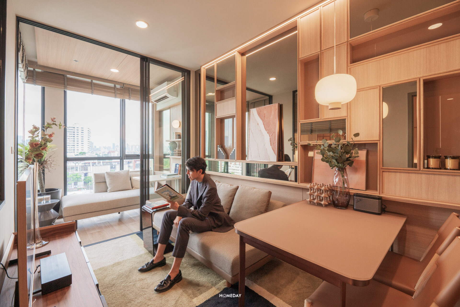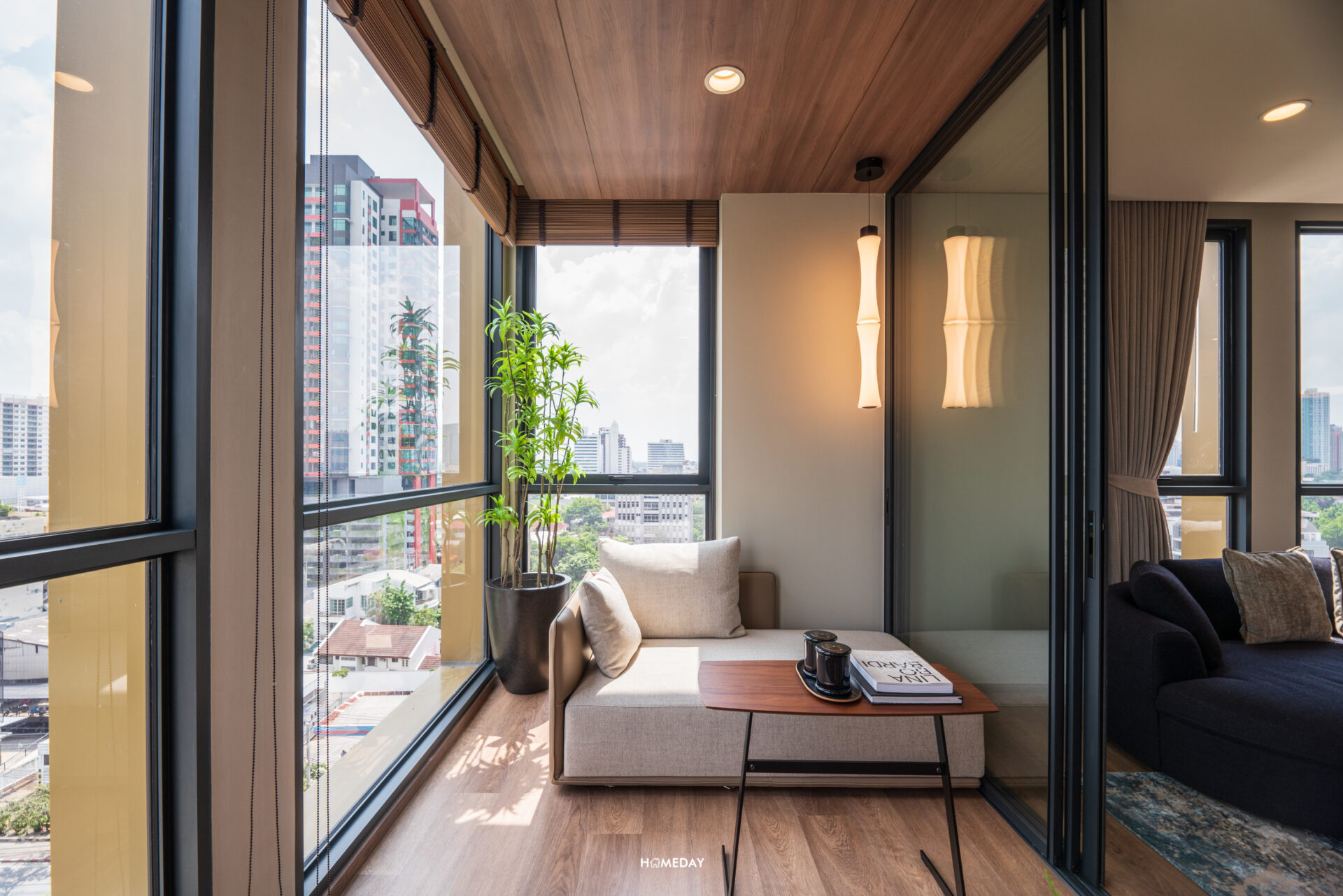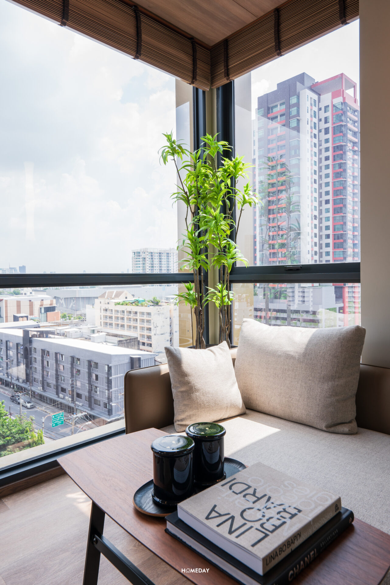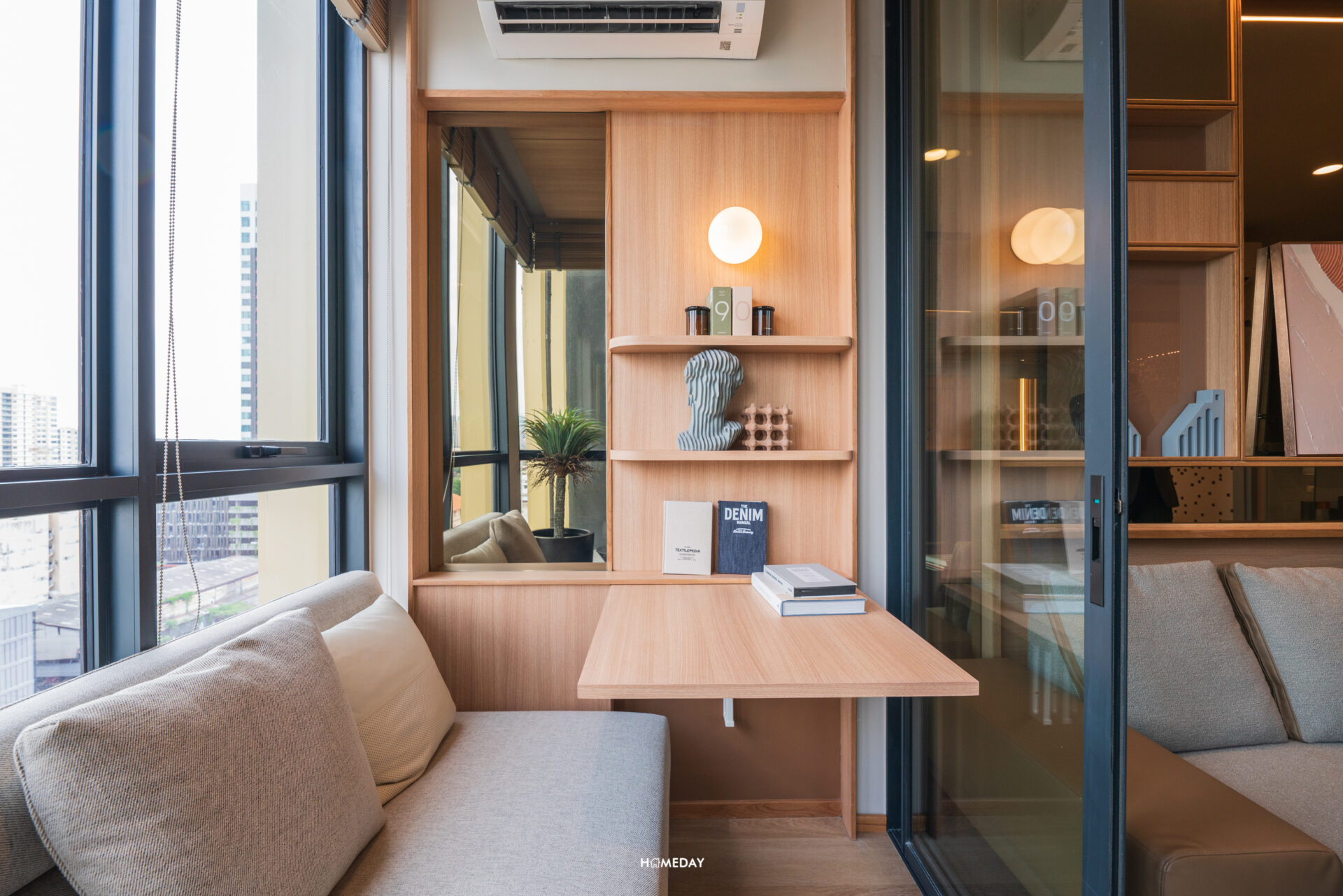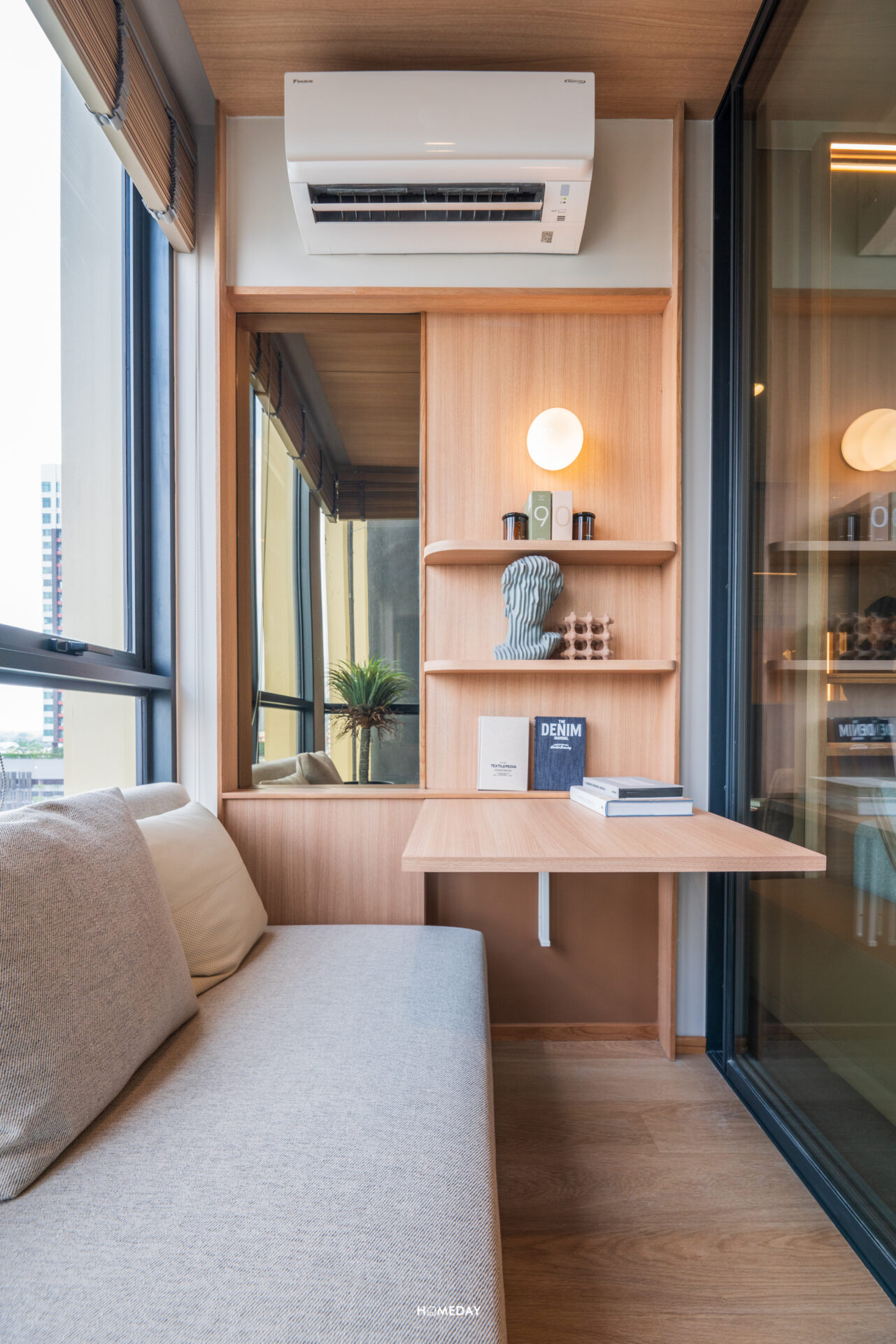 ห้องตัวอย่างออกแบบพื้นที่อเนกประสงค์ให้เป็นมุมพักผ่อนชิล ๆ รองรับไว้ทั้งมุมม้านั่งและอาร์มแชร์พรัอมด้วยโต๊ะข้าง สำหรับนั่งเล่นชมวิวชิล ๆ อ่านหนังสือ ฟังเพลงสบาย ๆ ปลูกต้นไม้เพิ่มบรรยากาศ รับแสงธรรมชาติได้อย่างเต็มที่ สำหรับใครที่อยากปรับเป็นห้องทำงานส่วนตัวก็เหมาะเช่นกันครับ มีวิวให้ชมพักสายตา จัดให้มีทั้งมุมโต๊ะทำงาน พื้นที่เก็บของ และพื้นที่นั่งพักผ่อนได้ในห้องเดียวเลย