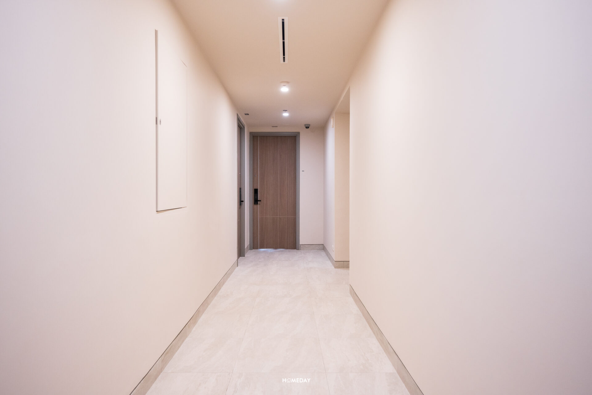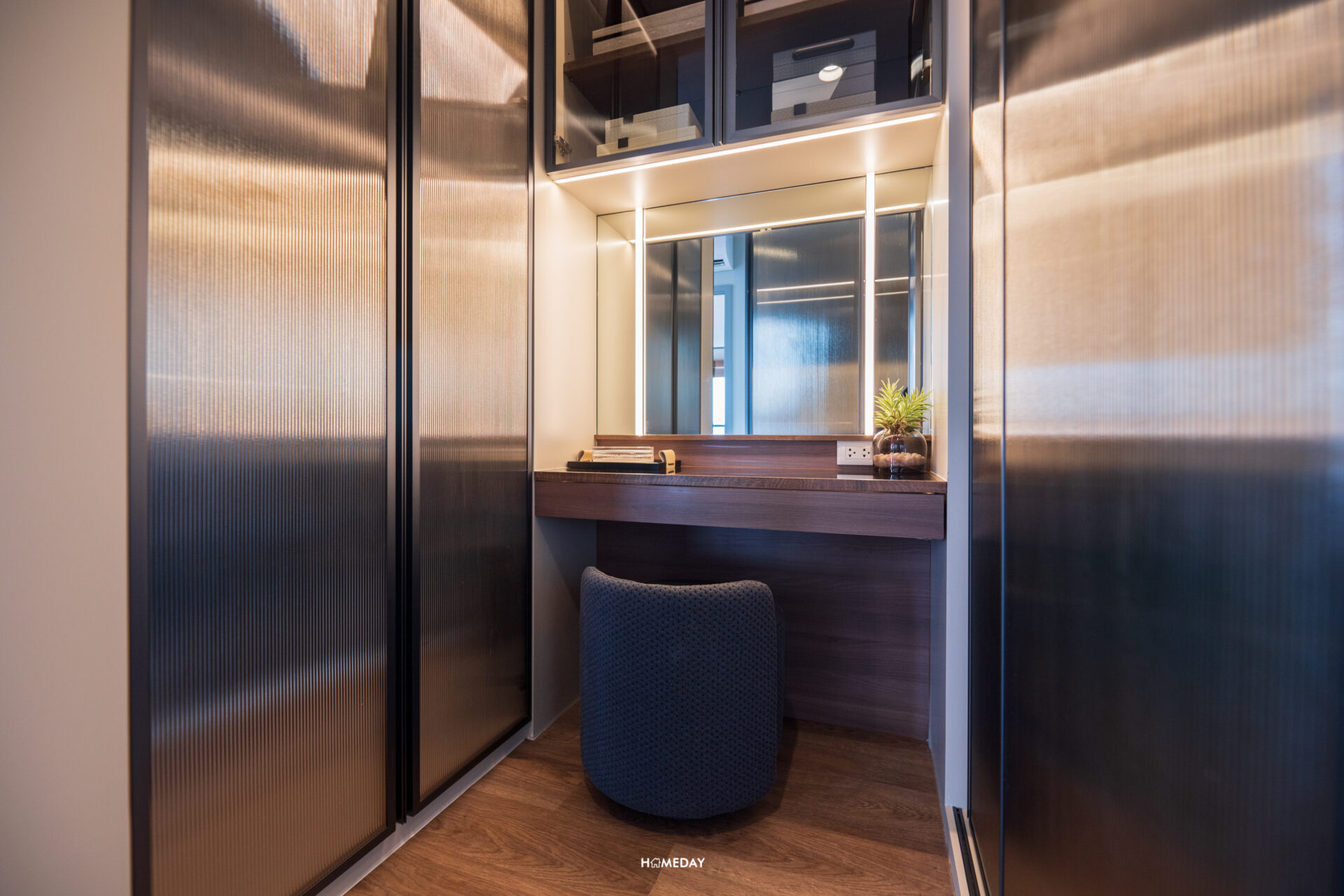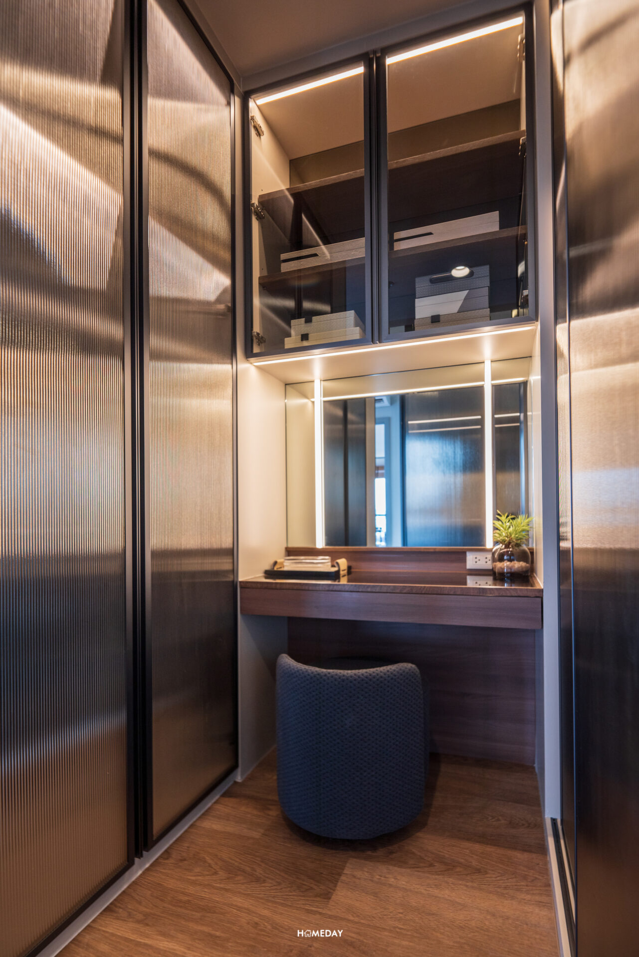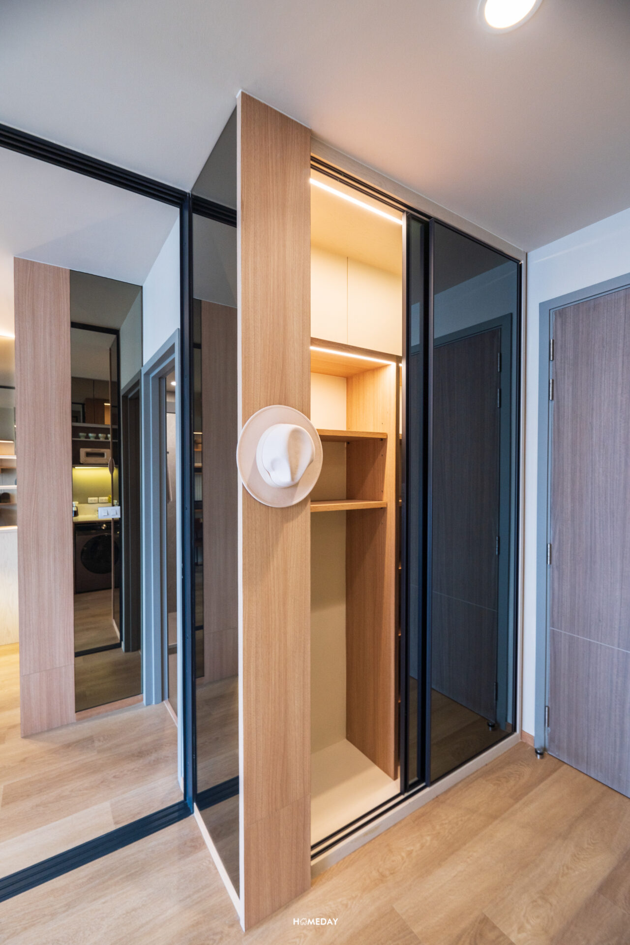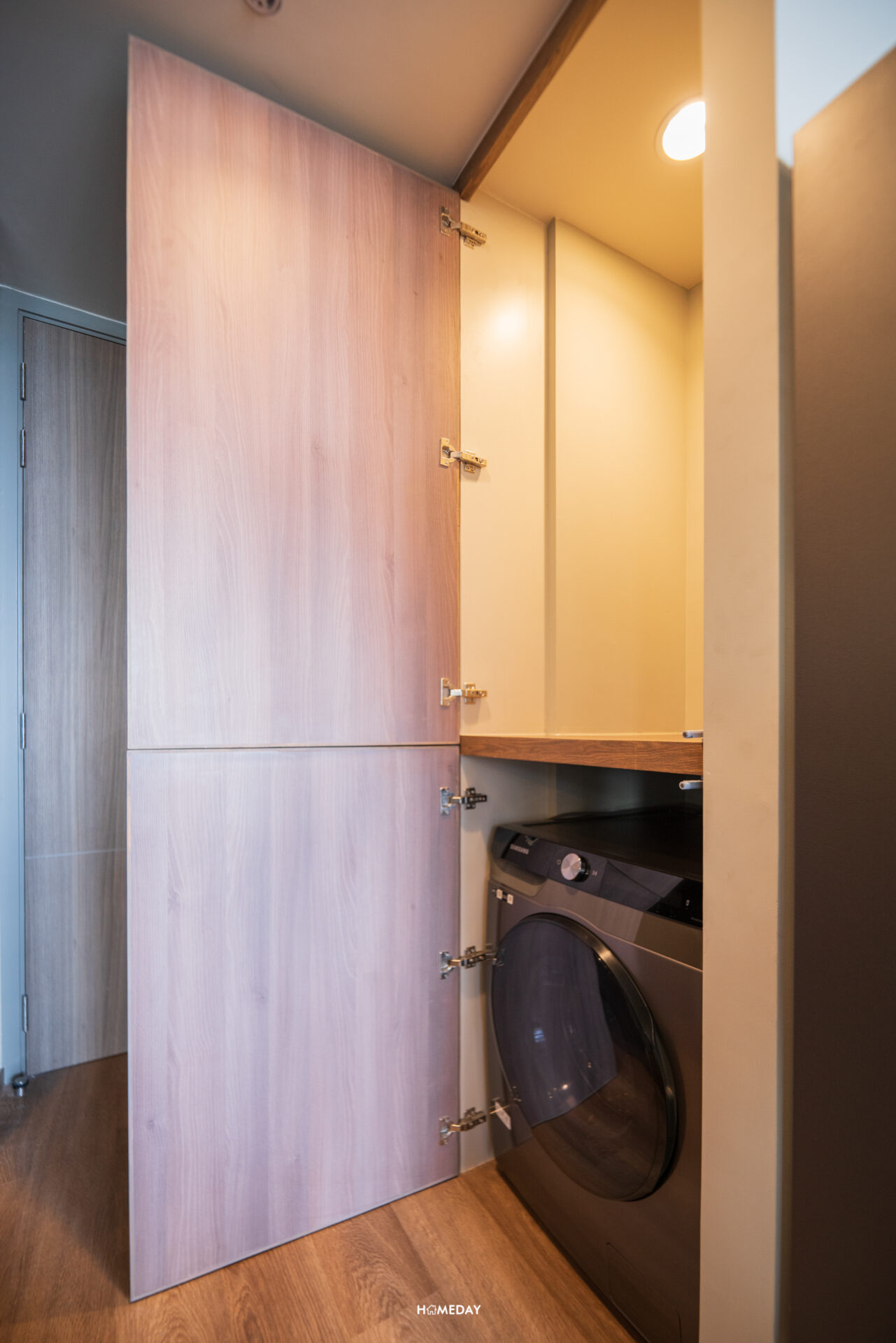 พื้นที่ติดประตูทางเข้า เหลือเว้นช่องไว้ ให้เราสามารถบิลต์อินเฟอร์นิเจอร์ได้เข้าล็อกพอดี อย่างห้องตัวอย่างก็เลือกออกแบบเป็นชั้นวางของและบานตู้ซ่อนเครื่องซักและอบผ้า ห้องจริงเราอาจจะปรับเป็นชั้นวางรองเท้า หรืออื่น ๆ ก็เลือกได้ตามไลฟ์สไตล์เลยครับ