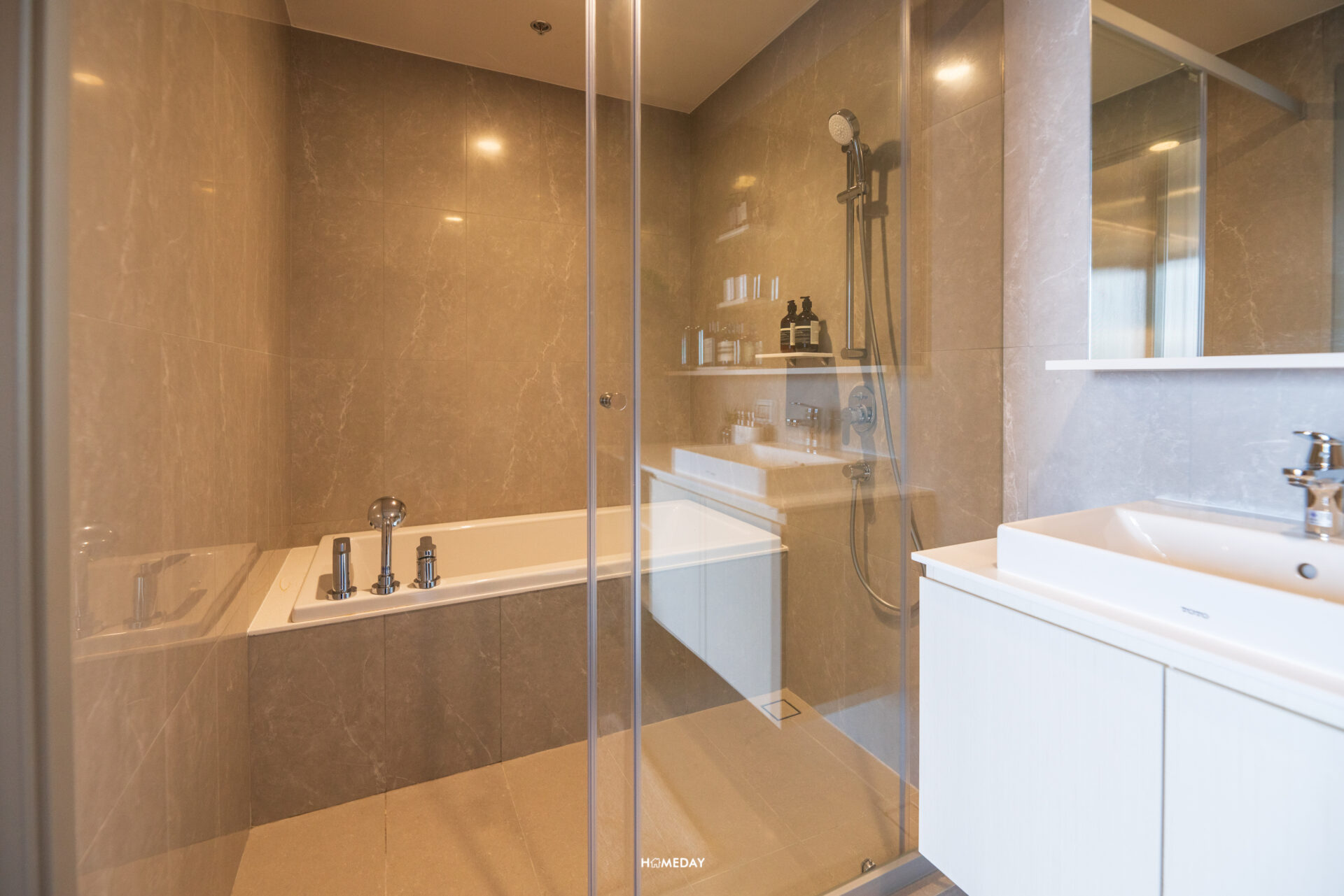 ทางด้านของ Master Bathroom ห้องนี้ก็จะมีขนาดใหญ่กว่า ตัวอ่างล้างหน้าได้ท็อปอ่างขนาดใหญ่ มาพร้อมบานตู้ด้านใต้และชั้นวางของ ใช้งานจัดเก็บสำหรับ 2 ท่านได้อย่างเพียงพอแน่นอน บานกระจกเงาของห้องนี้จะได้บานที่กว้างกว่า มาพร้อมชั้นวางของเหมือนเช่นเคย พื้นที่โซนเปียกกั้น Partition กระจกนิรภัยบานสไลด์มาเหมือนเดิมครับ ภายในได้มาทั้ง Rain Shower, Hand Shower, อ่างอาบน้ำ และชั้นวางของครับ