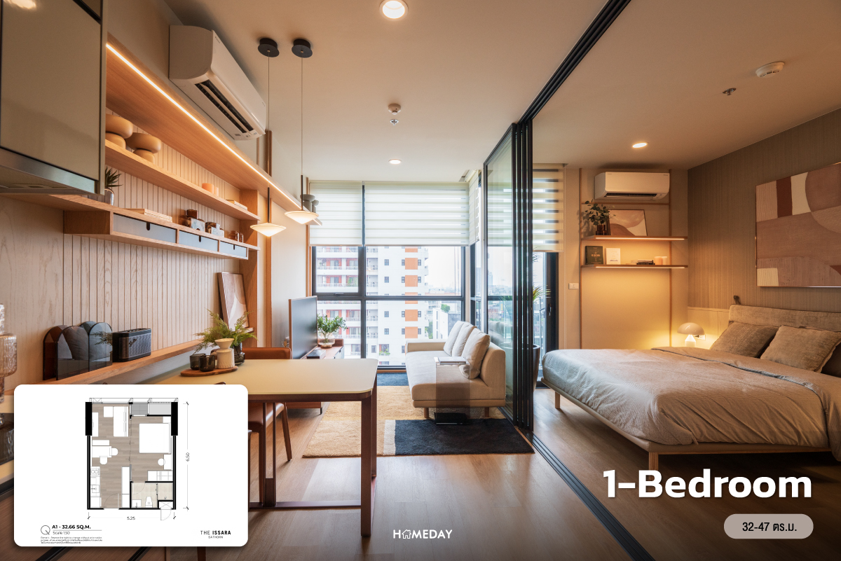 แบบห้อง : 1-Bedroom ปิดท้ายกับแบบห้องที่เราพามาชมกันในวันนี้ ด้วย 1-Bedroom ขนาดพื้นที่ใช้สอย 32-47 ตารางเมตร ห้องนี้จะเป็นห้องที่ได้แปลนมาใกล้เคียงกับ 1-Bedroom Plus เลยครับ แตกต่างกันที่ห้องนี้จะไม่มีห้องอเนกประสงค์ ฝั่งของห้องนอน จะกั้นด้วยประตูกระจกบานเลื่อนแทน และห้องน้ำ จะต้องเข้าผ่านทางห้องนอนครับ