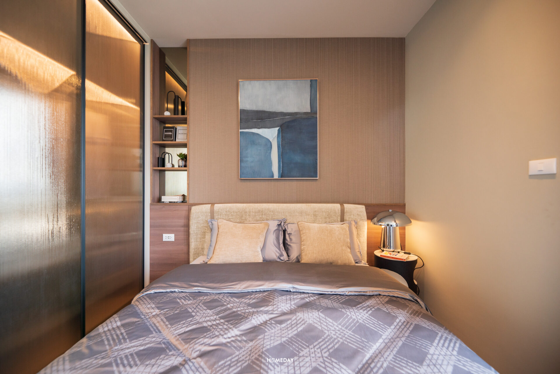 สำหรับขนาดของพื้นที่วางเตียง ถ้าอยู่ 2 ท่าน ก็ยังคงแนะนำให้วางเป็นเตียงขนาด 5 ฟุตครับ จะได้ในส่วนของพื้นที่ใช้สอยรอบเตียงมากยิ่งขึ้น แต่ถ้าหากอยู่คนเดียว อยากได้มุมนั่งทำงาน หรืออยากบิลต์อินตู้เสื้อผ้าใหญ่ ๆ ใส่เป็น 3-3.5 ฟุต ก็ช่วยได้มากเลยครับ ทั้งนี้ทั้งนั้นก็ขึ้นอยู่กับการออกแบบของเราเลย เพราะห้องตัวอย่างก็เลือกวางเป็น 5 ฟุตเอาไว้ให้ดูครับ จะเห็นได้เลยว่า พื้นที่ด้านข้างเตียง สามารถใส่ได้ทั้งโต๊ะหัวเตียงสองฝั่ง, บิลต์อินชั้นวางของได้ และวางตู้เสื้อผ้าขนาดใหญ่ได้ครับ