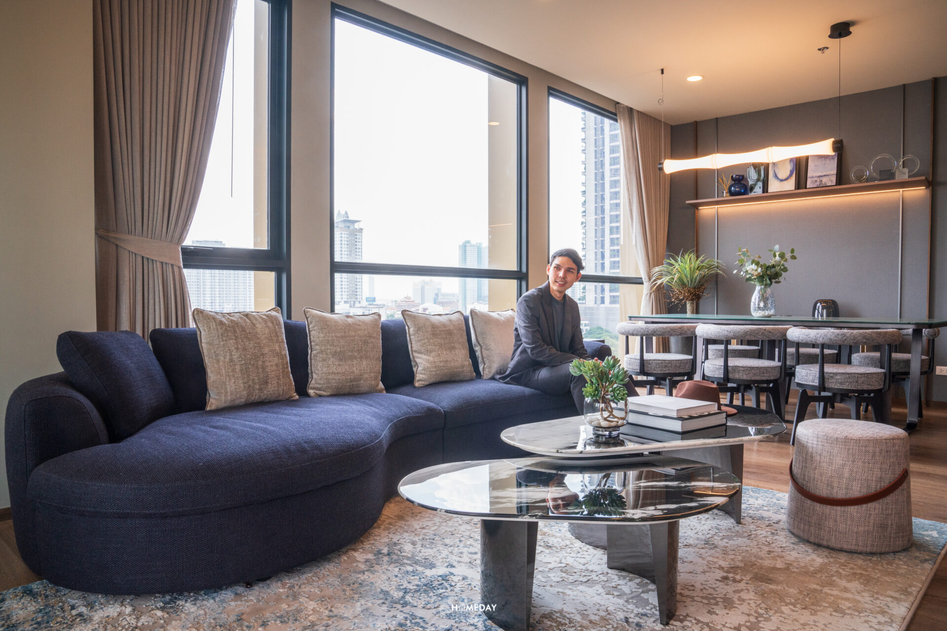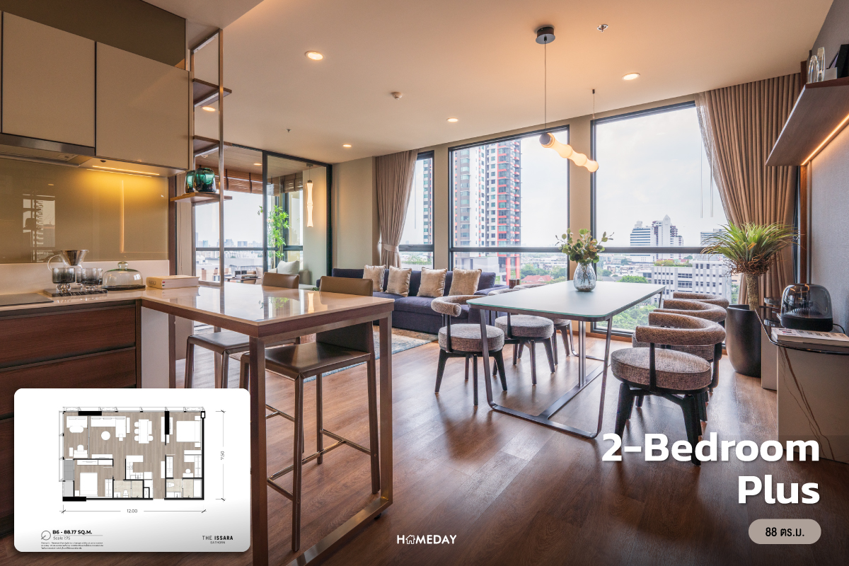 แบบห้อง : 2-Bedroom Plus พาชมห้องแรก 2-Bedroom Plus ขนาดพื้นที่ใช้สอย 88 ตารางเมตร แปลนห้องได้พื้นที่หน้ากว้างลักษณะเดียวกันกับบ้านเดี่ยว เปิดประตูเข้ามาถึงจะเจอกับโถงทางเดินที่นำไปสู่ครัว พื้นที่รับประทานอาหาร และห้องนั่งเล่นตามลำดับ ซึ่งพื้นที่ทั้งหมดในโซนนี้จะเป็น Open Space ที่อยู่เชื่อมต่อกันบริเวณกึ่งกลางของตัวห้อง จุดเด่นคือห้องนี้ เป็นห้องมุมครับ รับวิวฝั่งแม่น้ำเจ้าพระยาและบางกะเจ้า ด้วยกระจกเข้ามุม ตัวฝ้าเพดานสูง 2.7 เมตร มาตรฐานระดับบ้านครับ