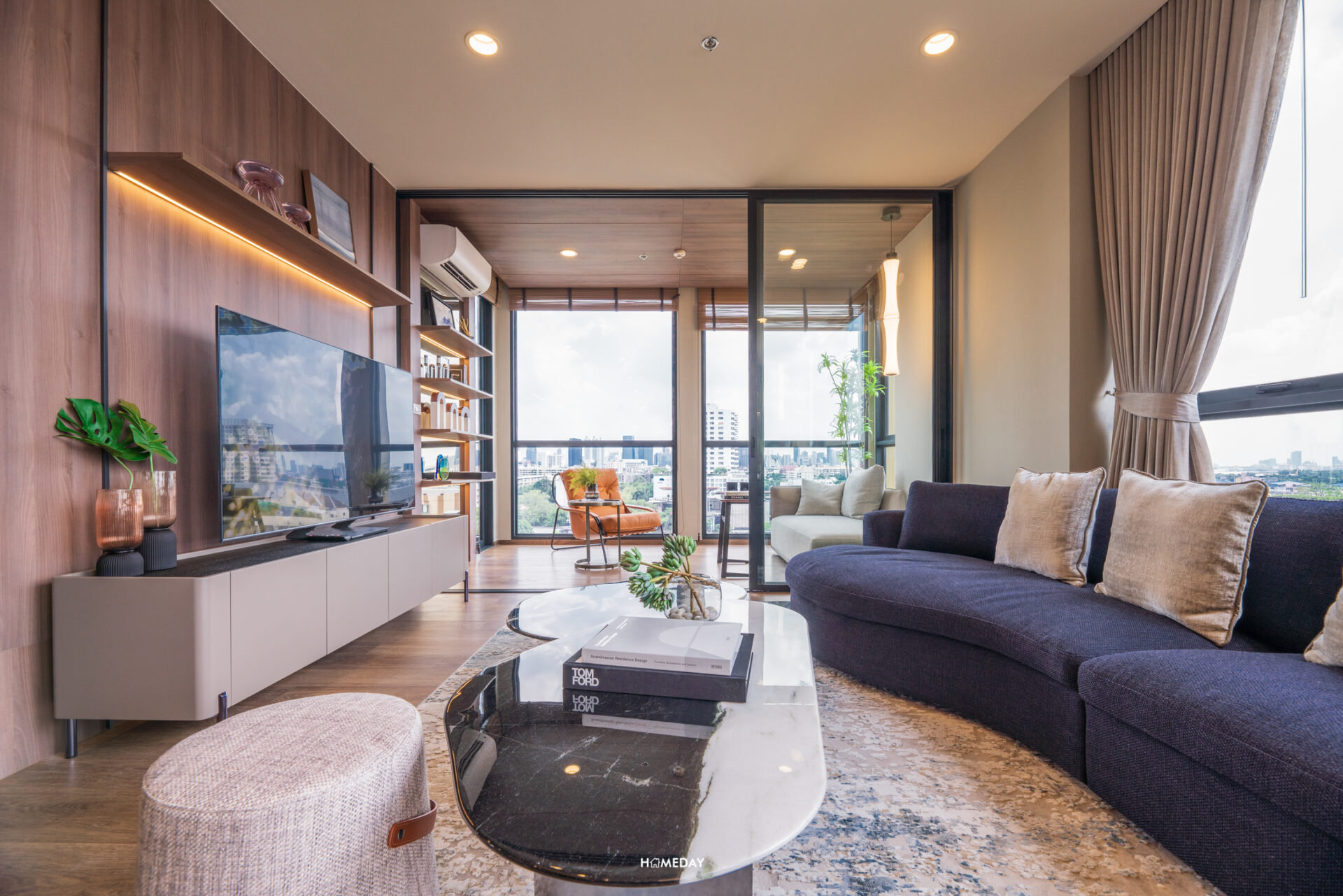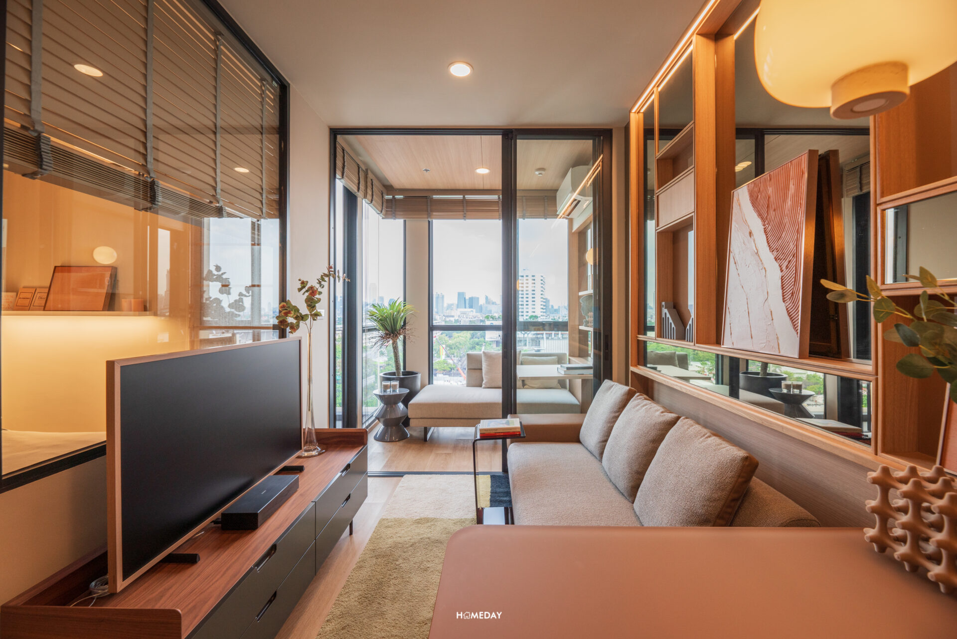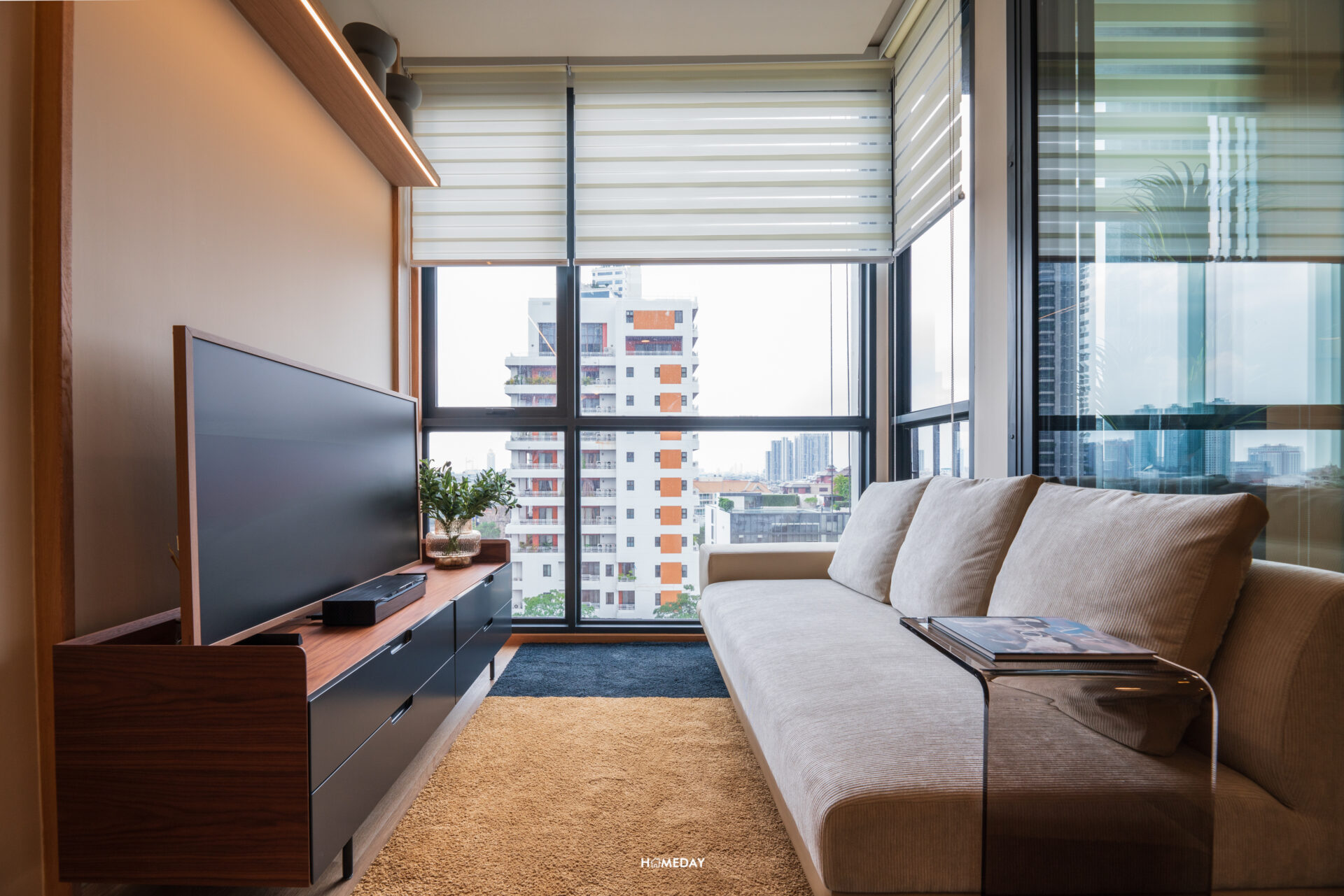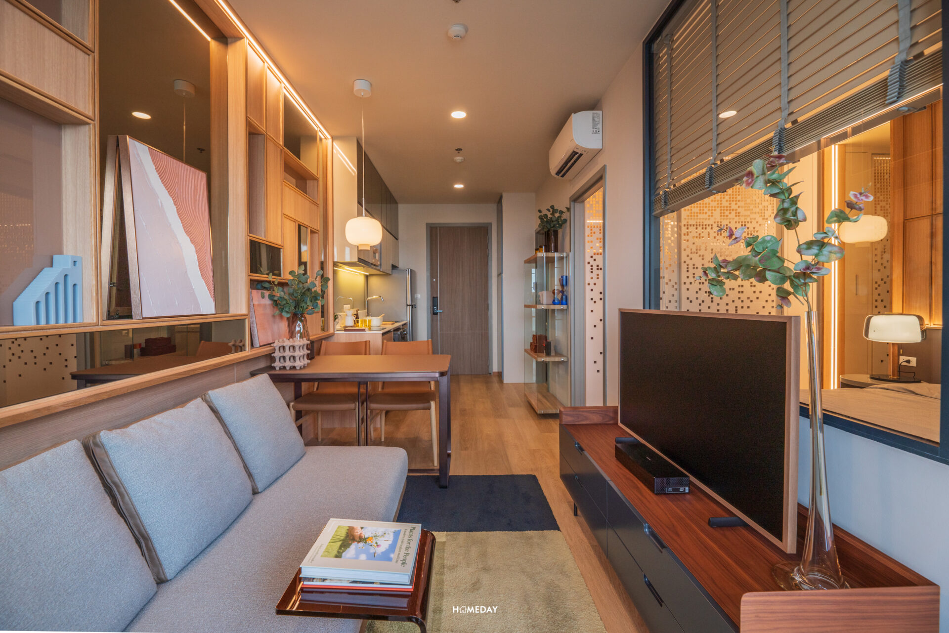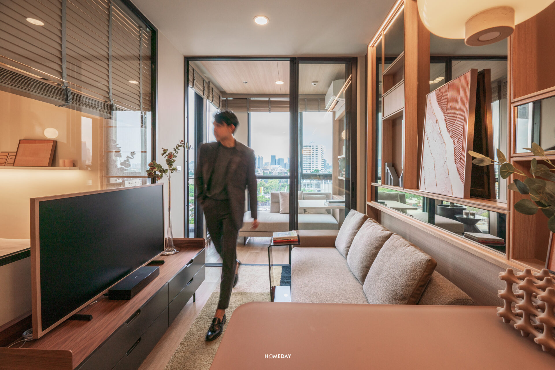 ตัวห้องนั่งเล่นห้องนี้ ข้อดีที่เป็นจุดแตกต่างจาก 1-Bedroom Plus คือฝั่งของชั้นวางทีวี ที่อยู่ติดกับผนัง ไม่ใช่กระจกของห้อง ทำให้เราสามารถเลือกออกแบบเป็นงานบิลต์อินได้ครับ ก็จะได้ความสวยงาม ประหยัดพื้นที่ และได้พื้นที่การจัดเก็บมากขึ้นอีกด้วย ส่วนฝั่งพื้นที่วางโซฟา ก็สามารถวางเป็นขนาด 2-3 ที่นั่งได้เหมือนเช่นเคยครับ ด้านหลังโซฟาก็จะอยู่พิงกับกระจกบานสไลด์ของห้องนอนครับ