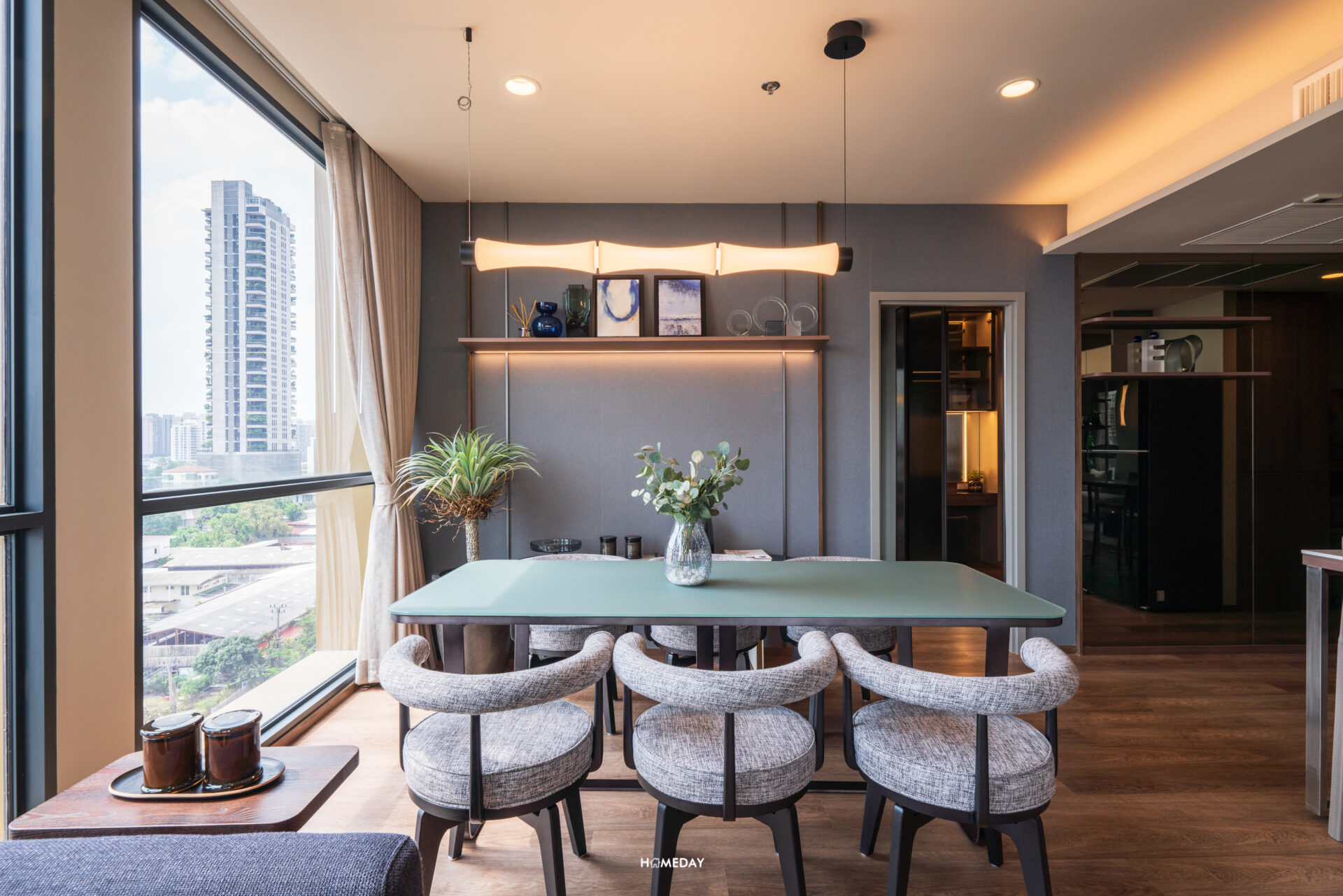 ด้านหน้า Pantry มีพื้นที่รองรับสำหรับวางชุดโต๊ะเก้าอี้นั่งรับประทานอาหารได้ 6-8 ที่นั่ง สามารถวางโต๊ะตัวยาวรองรับแขกและปาร์ตี้ได้สบาย ๆ ดินเนอร์รับวิวสวย ๆ ได้ รอบโต๊ะสามารถเลื่อนเก้าอี้เข้า-ออกได้สะดวก คล่องตัว เดินผ่านไป-มาได้ ไม่ติดขัดแต่อย่างใดครับ