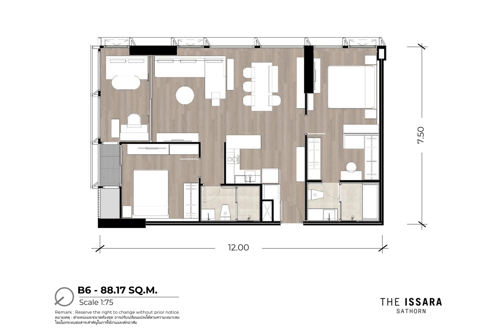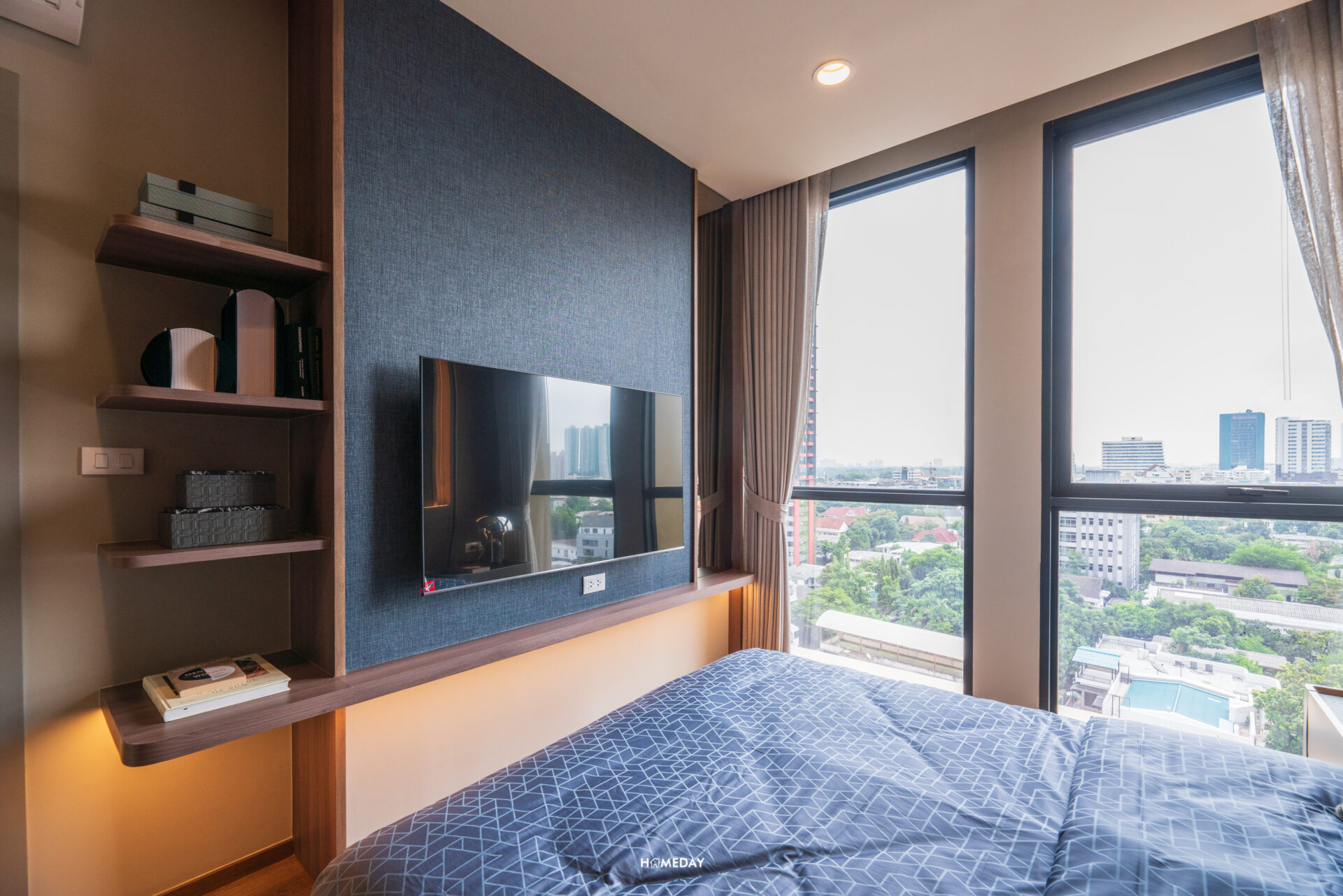 ปิดท้ายด้วย Master Bedroom ห้องนอนใหญ่ ที่มาพร้อมแปลนแบบหน้ากว้าง แบ่งโซนพื้นที่การใช้งานแยกโซนแต่งตัวและโซนพักผ่อนออกจากกันอย่างชัดเจน ได้สัดส่วน และความเป็นส่วนตัวมากยิ่งขึ้น ฝั่งพื้นที่วางเตียงได้บานหน้าต่างขนาดใหญ่ รับแสงธรรมชาติและวิวได้อย่างเต็มที่ พื้นที่วางเตียงรองรับขนาด 6 ฟุตได้สบาย หัวเตียงสองฝั่งสามารถใส่ฟังก์ชันเพิ่มเติมได้ สำหรับห้องตัวอย่างก็เลือกวางโต๊ะหัวเตียงเอาไว้ให้ดูเป็นแนวทางในการตกแต่ง ปลายเตียงสามารถบิลต์อินชั้นวางของและ/ หรือชั้นวางทีวีเพิ่มเติมได้เลยครับ