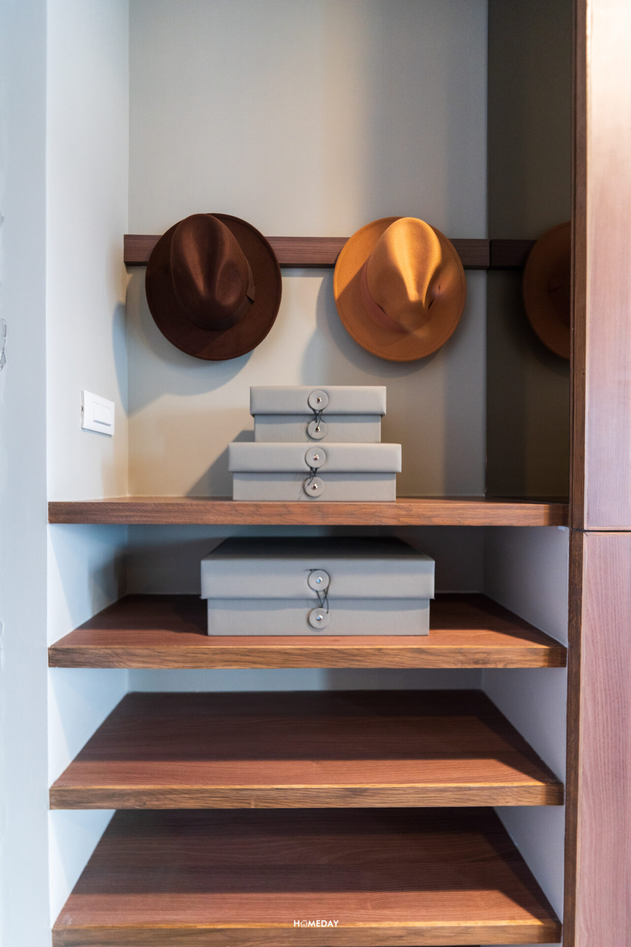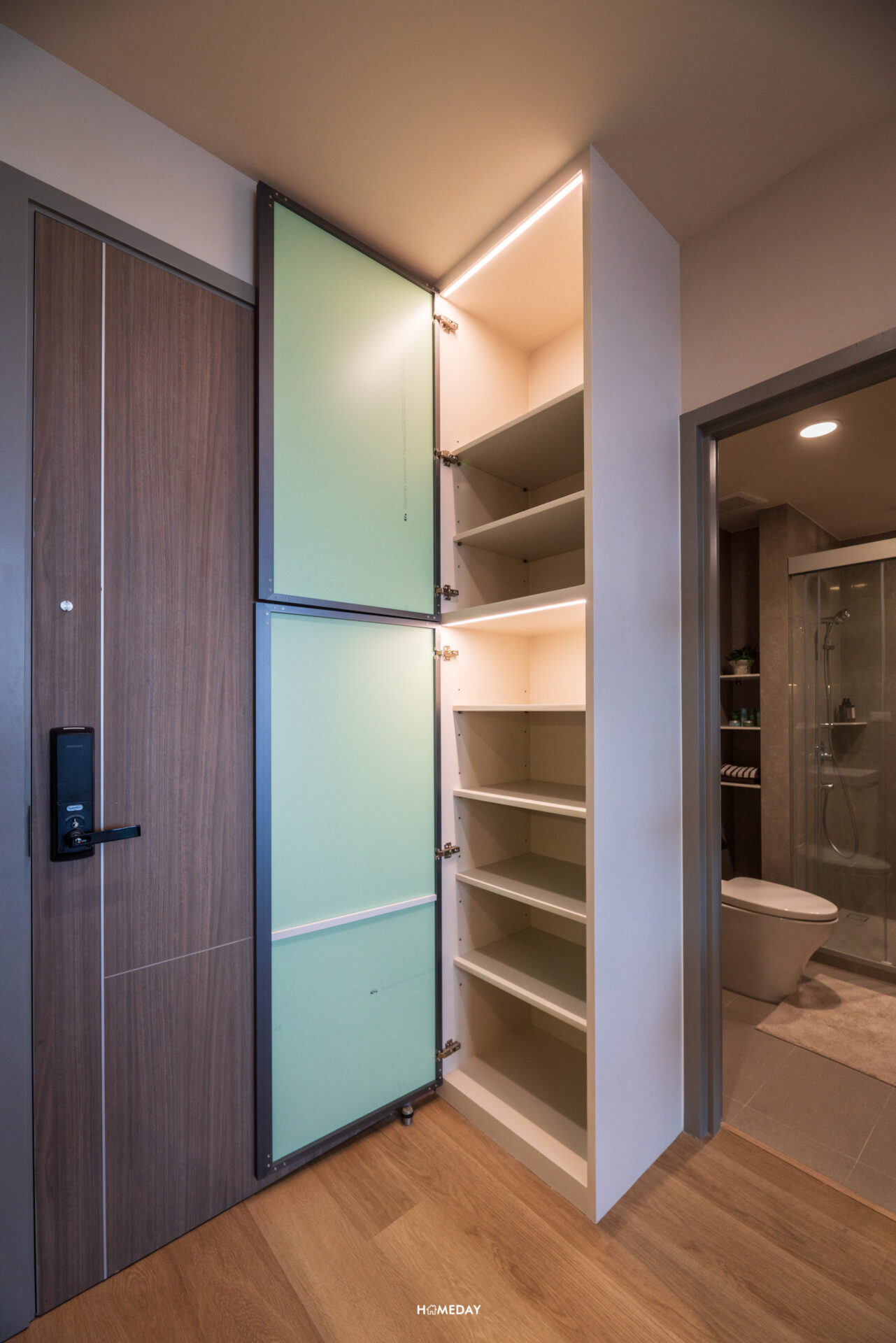 ซ้ายมือติดทางเข้าบริเวณด้านหน้าห้องน้ำ มีพื้นที่เหลือให้เราสามารถบิลต์อินตู้เก็บของเท้าได้เลยครับ ตำแหน่งนี้ลงตัวมาก ๆ ทั้งขนาดและความง่ายในการหยิบใช้งาน ห้องจริงก็สามารถนำไอเดียนี้ไปปรับใช้กันได้เลยครับ
