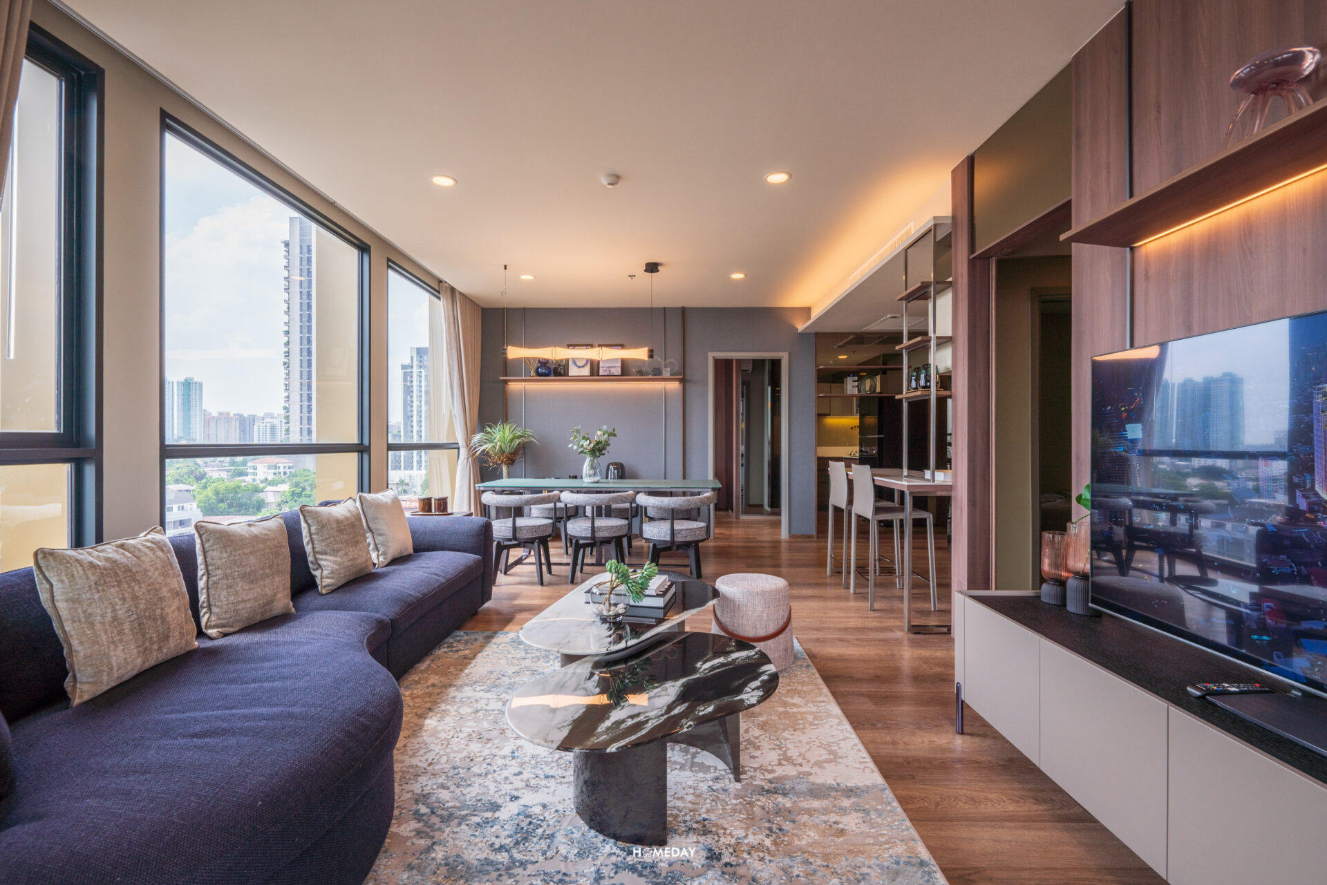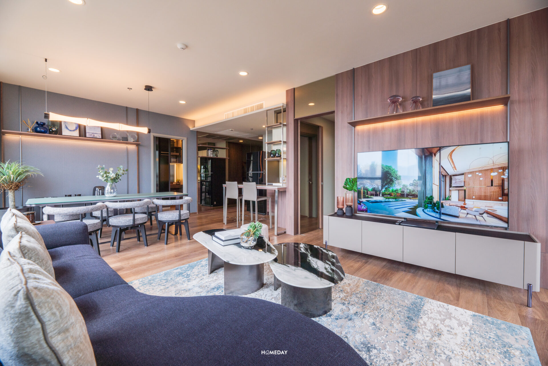 ห้องนั่งเล่นสามารถวางชุดโซฟาขนาด 4-6 ที่นั่งได้กำลังลงตัว เหลือพื้นที่รองรับสำหรับการวางโต๊ะกลางขนาดใหญ่ ใช้วางของได้อย่างเต็มที่ ฝั่งผนังรองรับการบิลต์อินชั้นวางทีวีขนาดใหญ่ สามารถใส่ทีวีได้ทุกไซซ์ ได้ระยะการรับชมที่เหมาะสมตามมาตรฐาน