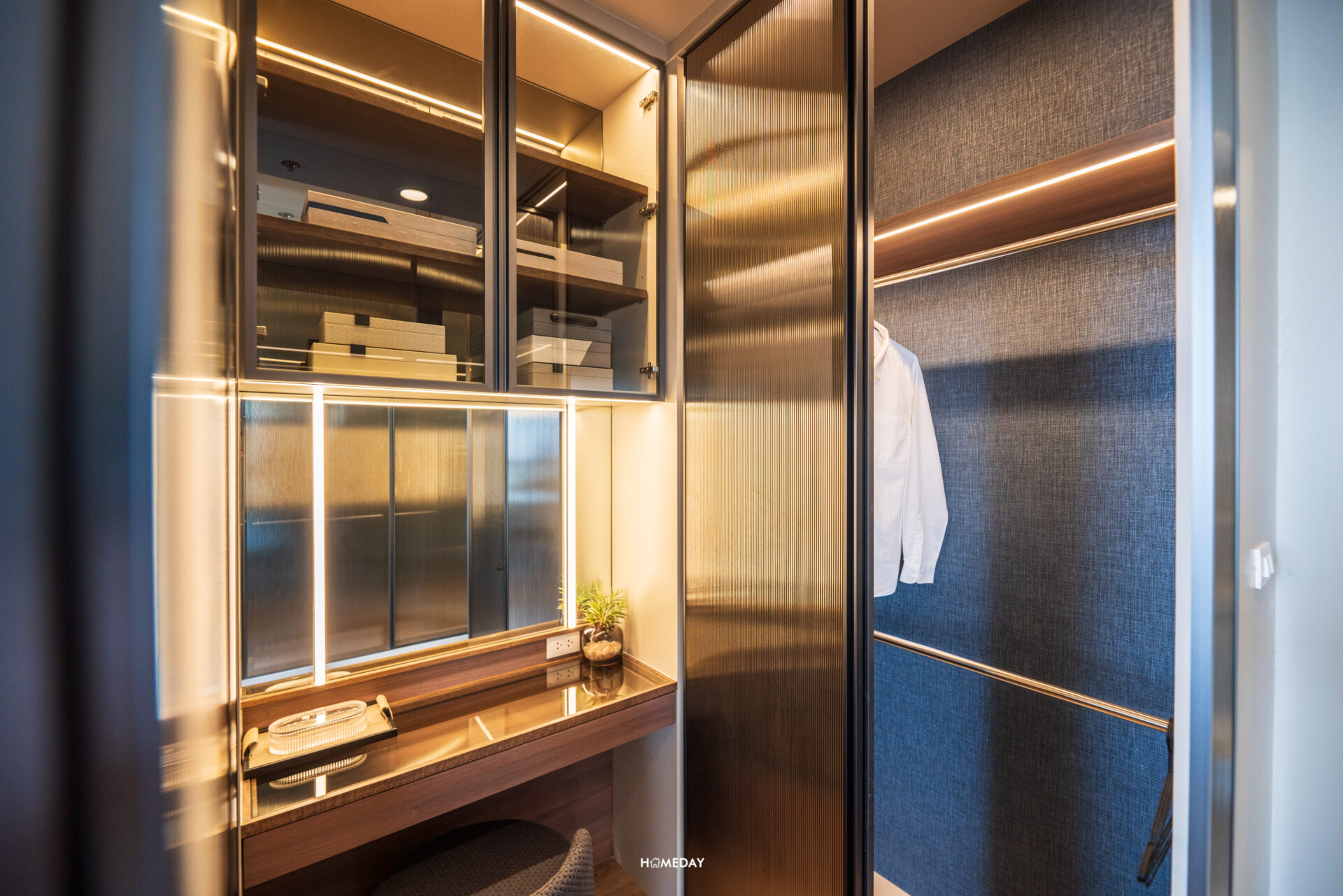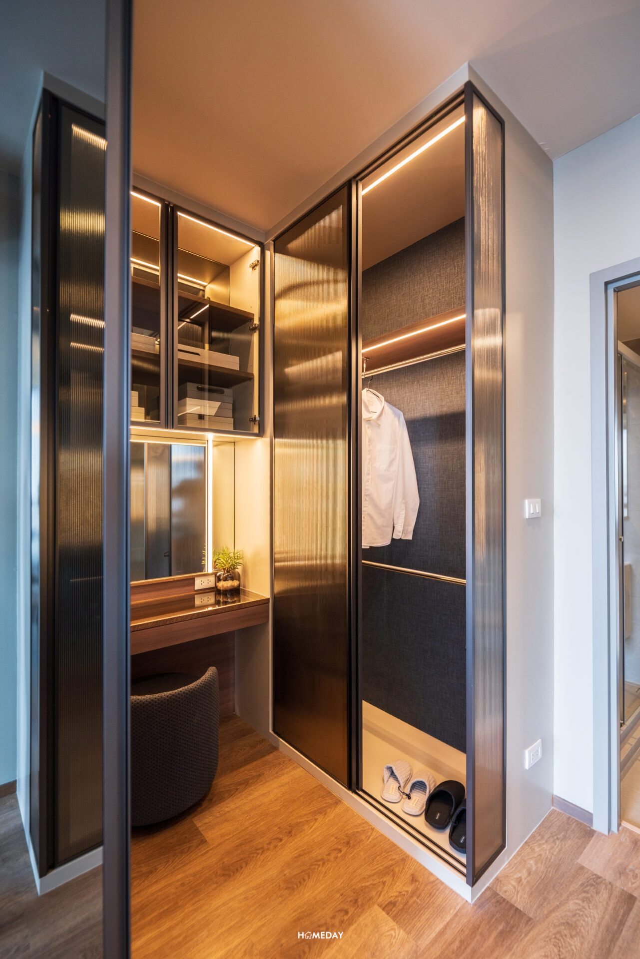 พื้นที่ข้างเตียงด้านหน้าห้องน้ำ รองรับสำหรับการบิลต์อิน Walk-in Closet ได้ทั้งสองฝั่ง ฝั่งหนึ่งสามารถบิลต์เป็นตู้เข้ามุมทรงตัว U ได้เลย ส่วนอีกฝั่งก็สามารถวางบิลต์ตู้ขนาดใหญ่เพิ่มได้อีก เรียกว่าได้พื้นที่จัดเก็บเพียงพออย่างแน่นอน สามารถใช้งานห้องนี้ 2 ท่านได้สบาย ๆ เลยครับ