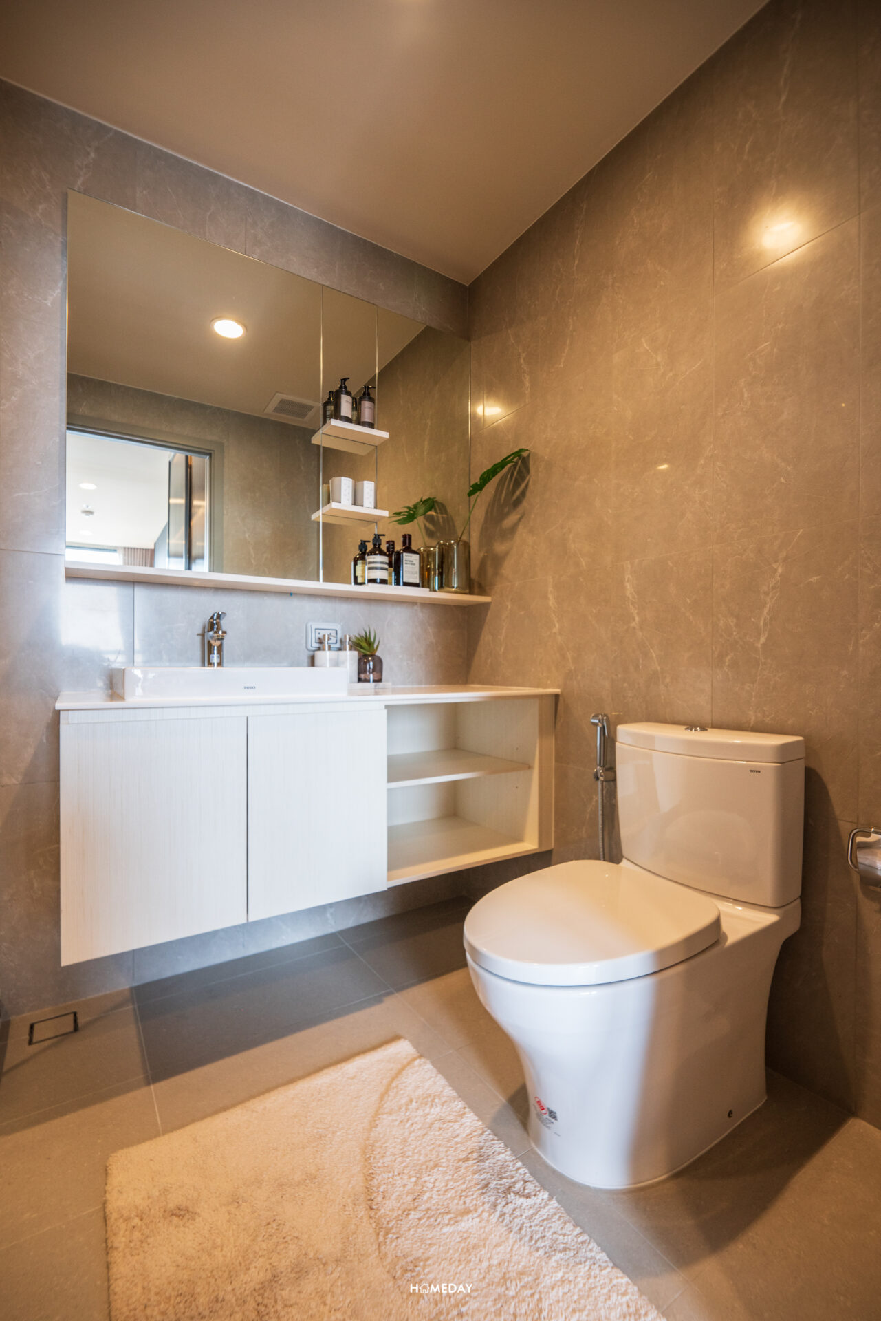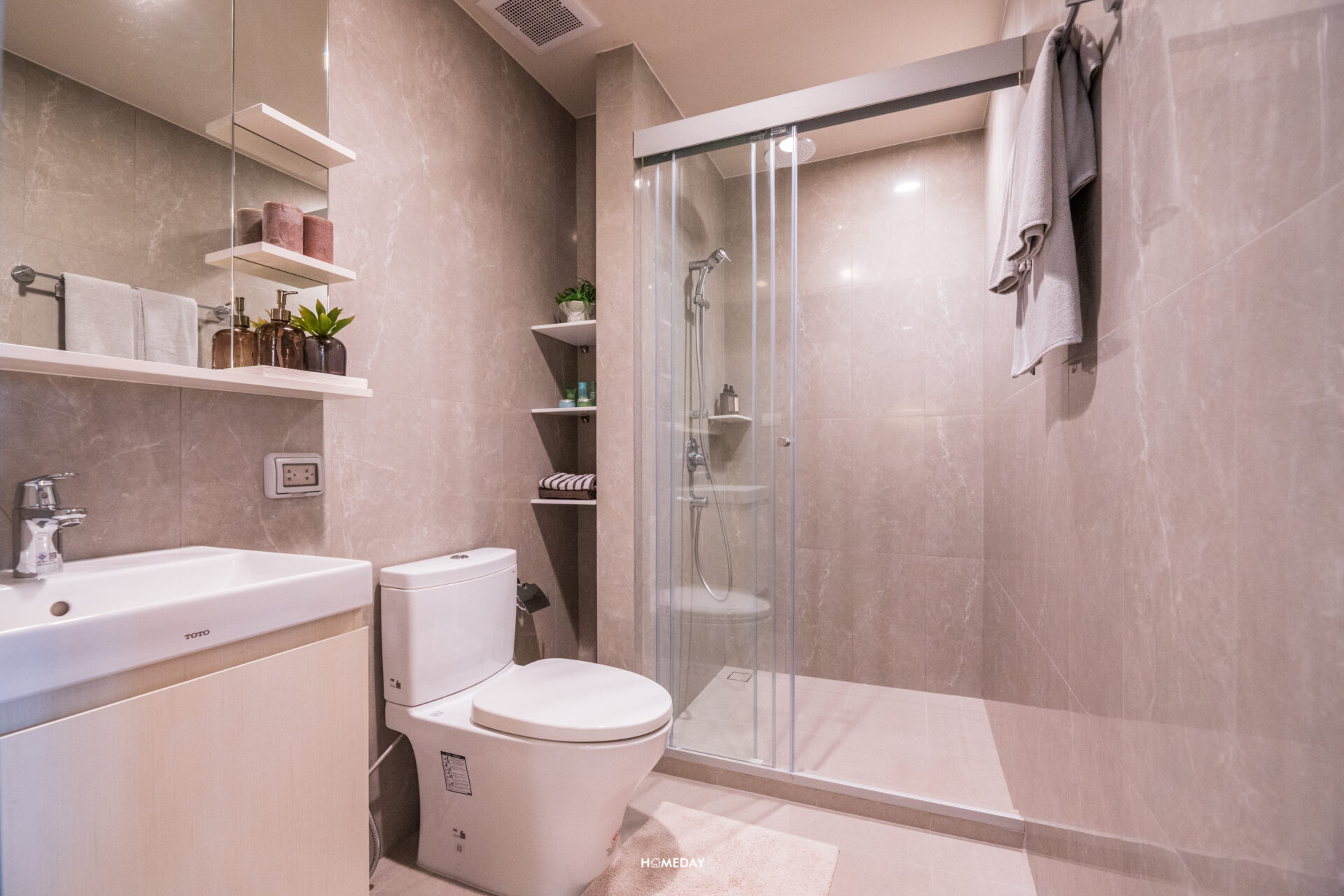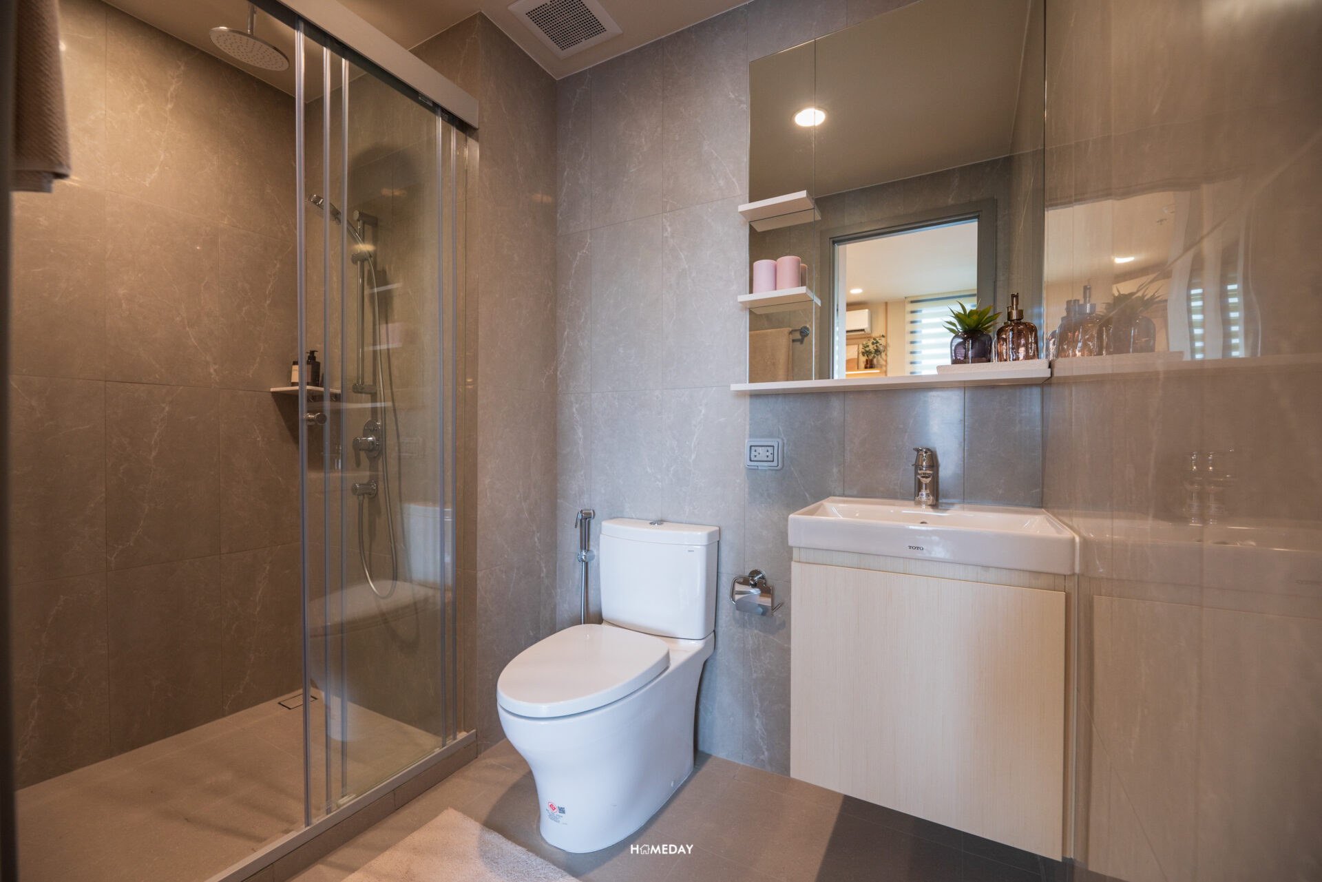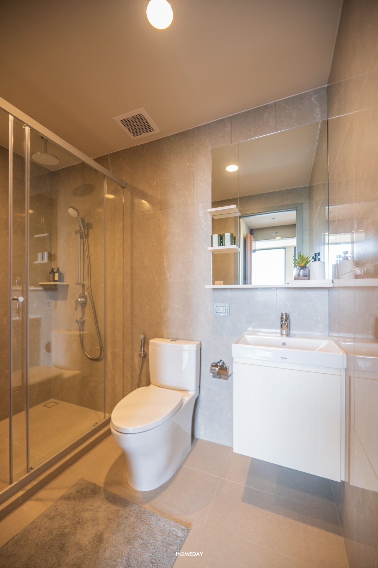 ห้องน้ำได้ฟังก์ชันการใช้งานมาใกล้เคียงกับ 1-Bedroom Plus อีกเช่นกัน ต่างกันที่ขนาดเล็กน้อย และด้านข้างโถสุขภัณฑ์จะไม่มีในส่วนของชั้นวางของมาให้ครับ แต่ถึงอย่างไรทั้งชั้นบริเวณกระจกเงา และชั้นภายใน Shower Box ก็สามารถใช้วางของพื้นฐานได้ครบถ้วนอยู่แล้วครับ