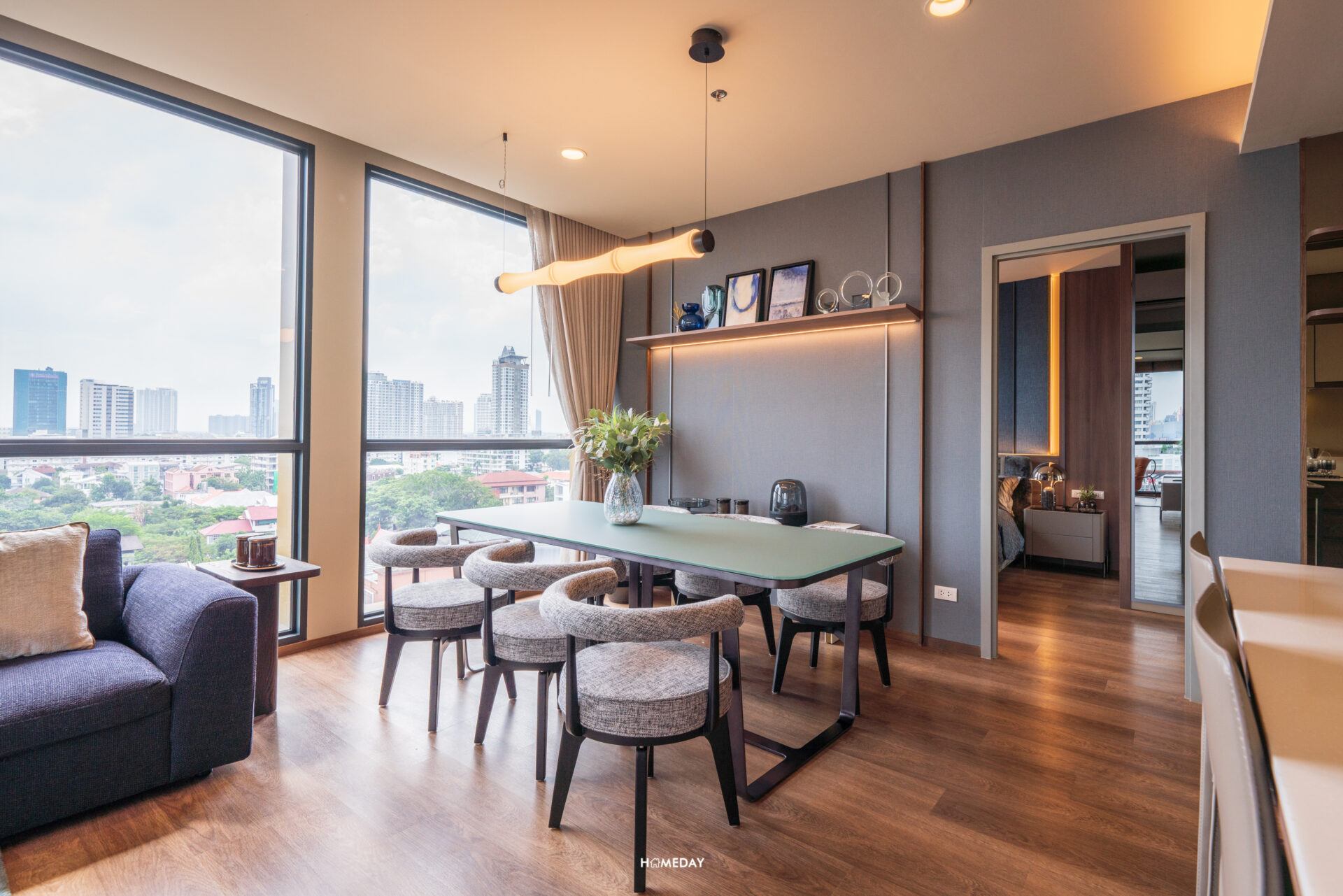 พื้นที่ติดครัวเหมาะมากสำหรับการวางโต๊ะรับประทานอาหาร อย่างห้องตัวอย่างก็เลือกวางเป็นชุดโต๊ะ 2 ที่นั่ง หันหน้าไปทางห้องนั่งเล่น ทานไปดูทีวีไปด้วยได้ชิล ๆ เลยครับ แถมยังรับวิวจากหน้าต่างของห้องอเนกประสงค์ได้อีกด้วย ผนังด้านข้างบิลต์อินเพิ่มเป็นชั้นวางของเก๋ ๆ แบบห้องตัวอย่างก็ช่วยเพิ่มพื้นที่การจัดเก็บได้ดีครับ