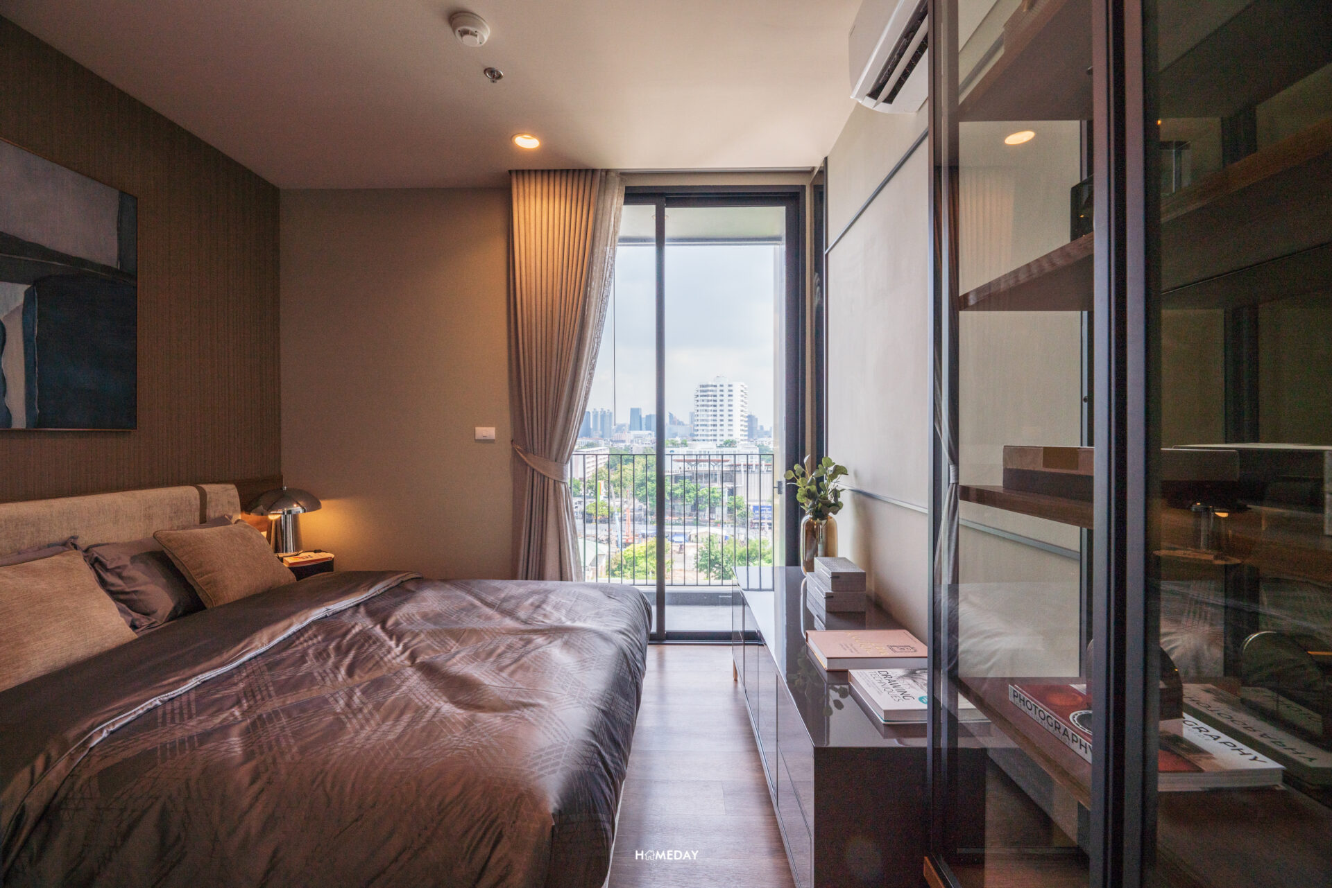ปลายเตียงเหลือพื้นที่ให้สามารถวางชั้นทีวีหรือตู้เก็บของเพิ่มเติมได้ตามชอบ เพิ่มพื้นที่จัดเก็บและฟังก์ชันการใช้งานได้ โดยยังเหลือพื้นที่ให้เดินเชื่อมไปสู่ระเบียงได้อย่างคล่องตัว ตัวระเบียงขนาดกำลังดี สามารถใช้งานได้จริง จะทำมุมนั่งเล่นหรือปลูกต้นไม้ก็ได้หมดครับ