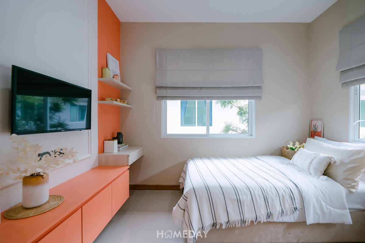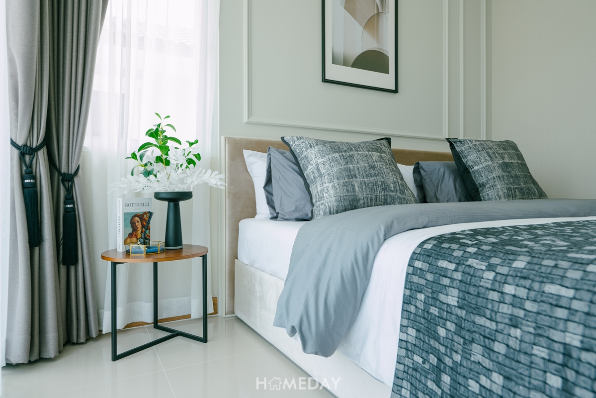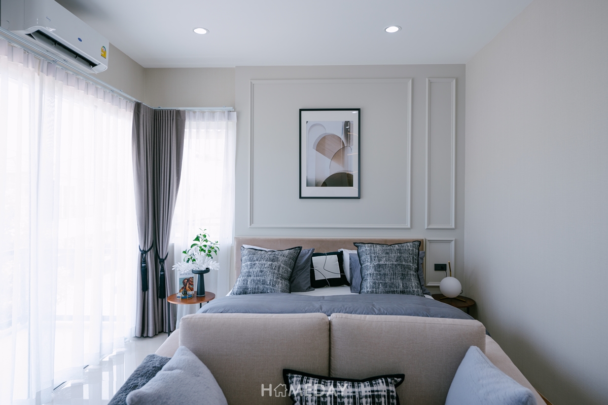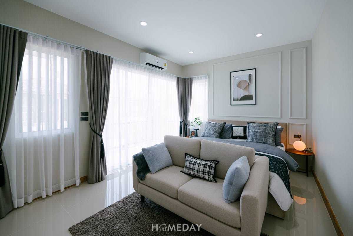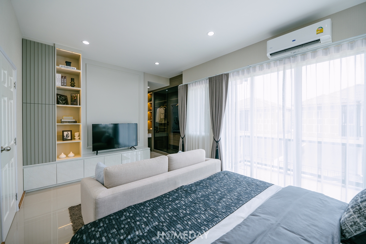 มาต่อในส่วนของห้องนอนหลักที่ตกแต่งสไตล์โมเดิร์น เรียบหรูและสบายตา มีขนาดกว้างพอที่จะจัดวางเตียง โซฟา และเครื่องพร้อมระบบ Entertainment ได้ครบครัน ในโซนห้องนอนเชื่อมต่อกับส่วนเชื่อมที่สามารถจัดเป็น Walk in closet และมีห้องน้ำในตัว เพื่อความสะดวกสบาย