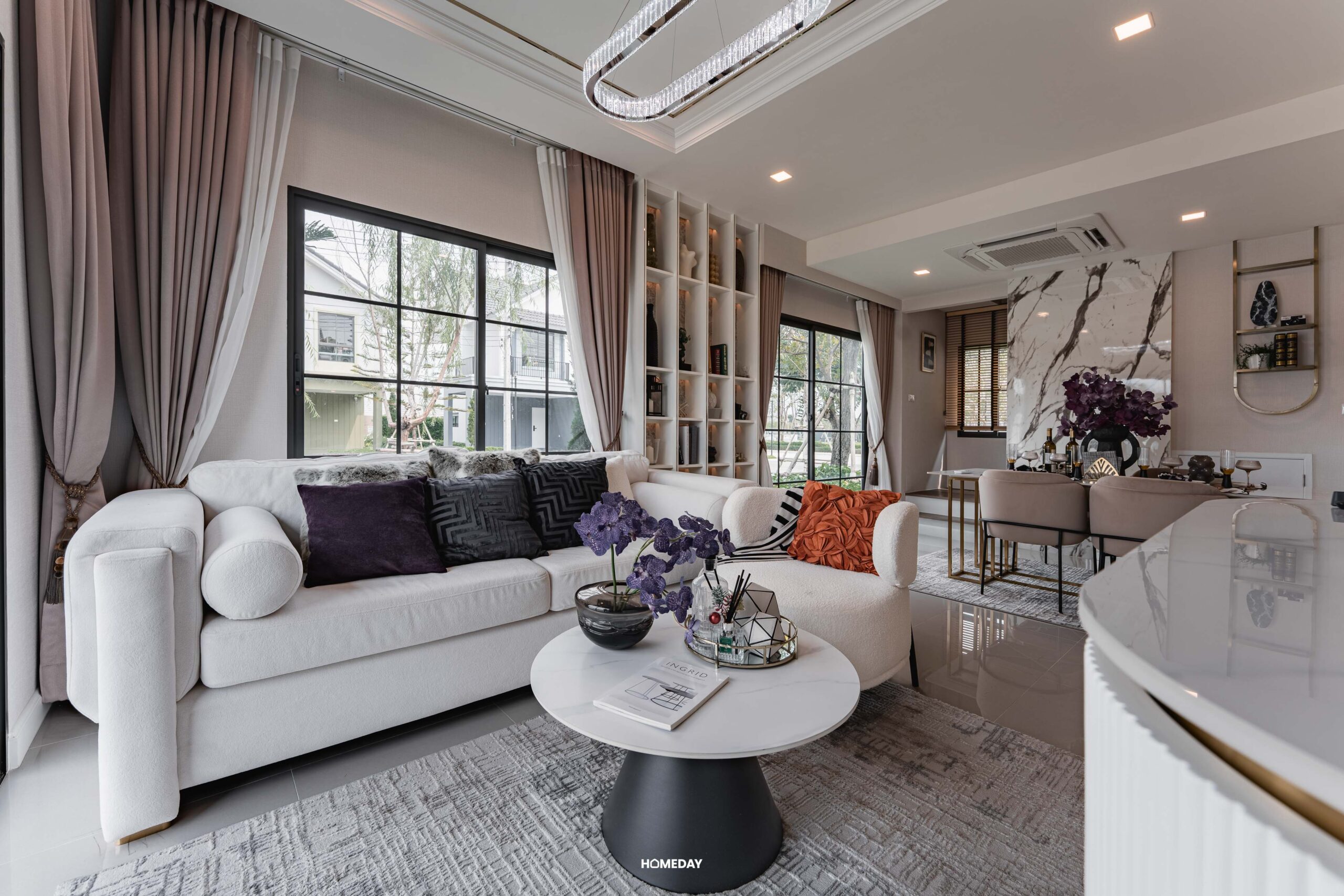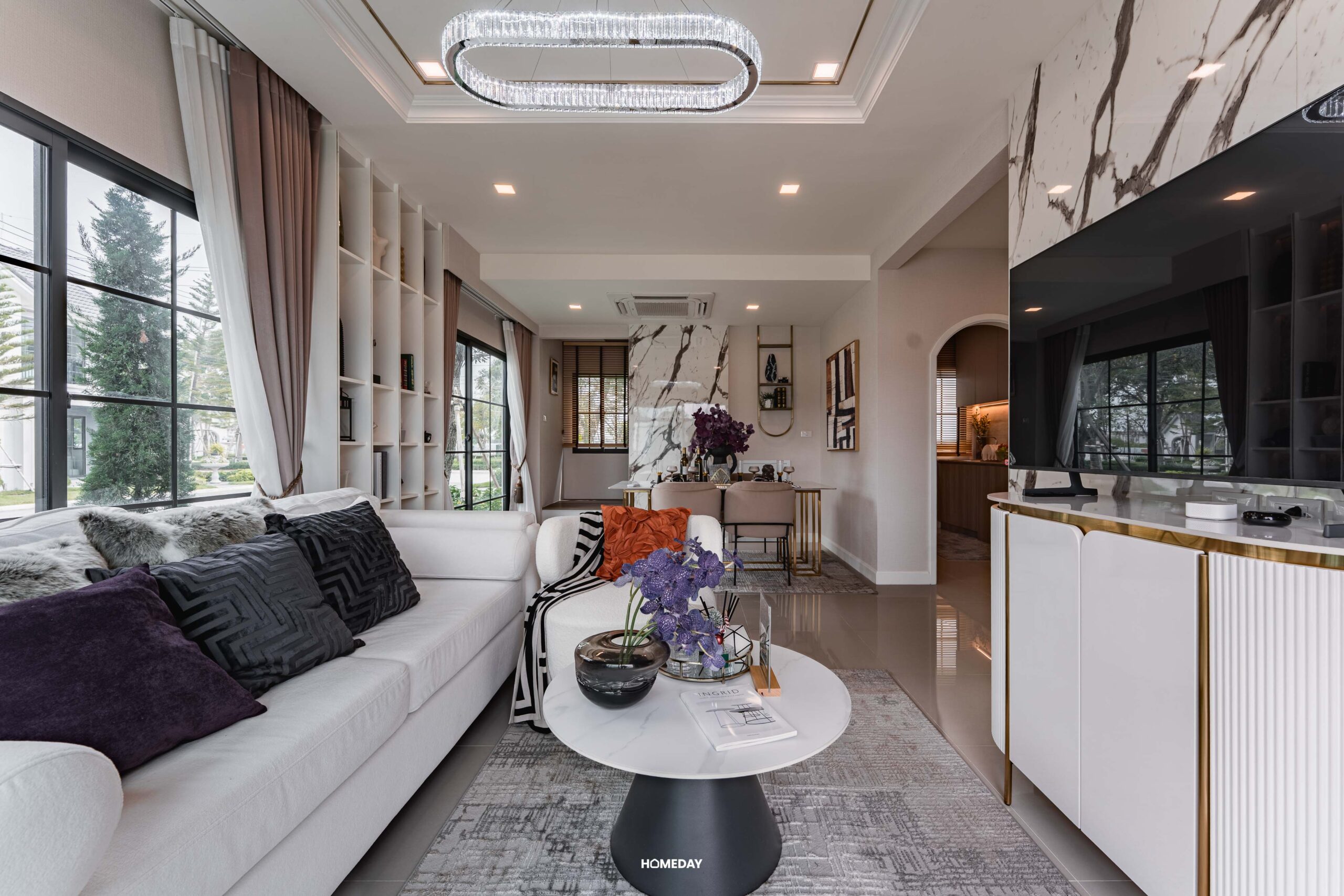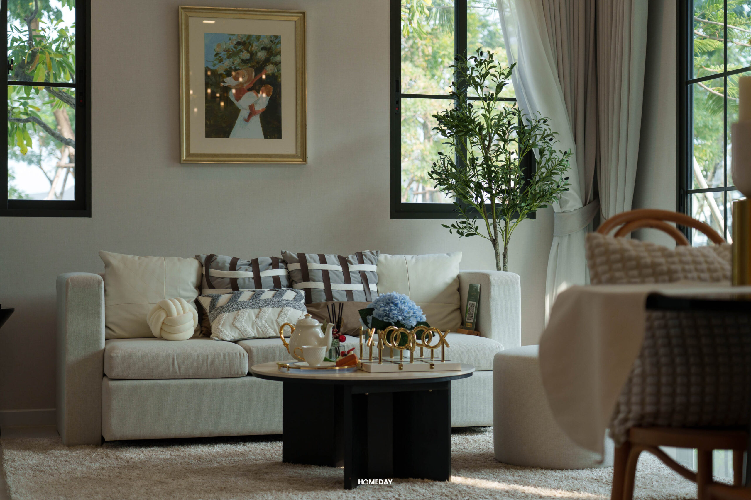 เปิดประตูเข้ามาภายในบ้านจะเจอกับ Living Area แบบ Open Plan ที่เชื่อมต่อพื้นที่ใช้งานเข้าหากันอย่างต่อเนื่อง ทำให้บรรยากาศภายในบ้านดูโปร่งและใช้งานได้สะดวก มีช่องแสงขนาดใหญ่หลายจุด ช่วยให้บ้านรับแสงธรรมชาติได้ดี ทำให้พื้นที่ภายในดูสว่าง โล่ง และน่าอยู่ตลอดทั้งวัน โซนห้องนั่งเล่นจะอยู่บริเวณหน้าบ้าน ได้พื้นที่ค่อนข้างกว้าง สามารถวางโซฟาขนาด 3-4 ที่นั่ง พร้อมโต๊ะกลางสำหรับวางเครื่องดื่มหรือของทานเล่นในระหว่างพักผ่อนหรือดูทีวีได้สบาย ฝั่งตรงข้ามเป็นผนังแนวยาวที่สามารถวางชั้นวางทีวี หรือจะ Built-in เป็นตู้โชว์และชั้นเก็บของขนาดใหญ่ก็ทำได้ บริเวณนี้มีการเตรียม ปลั๊กไฟ, USB Port และจุด Cable TV มาให้พร้อมใช้งาน ระยะระหว่างโซฟาและผนังทีวีค่อนข้างกว้าง ทำให้สามารถวางทีวีจอใหญ่และนั่งดูได้ในระยะที่สบายตา อีกทั้งยังเหลือพื้นที่ให้เดินเชื่อมไปยังส่วนอื่นของบ้านได้อย่างสะดวก